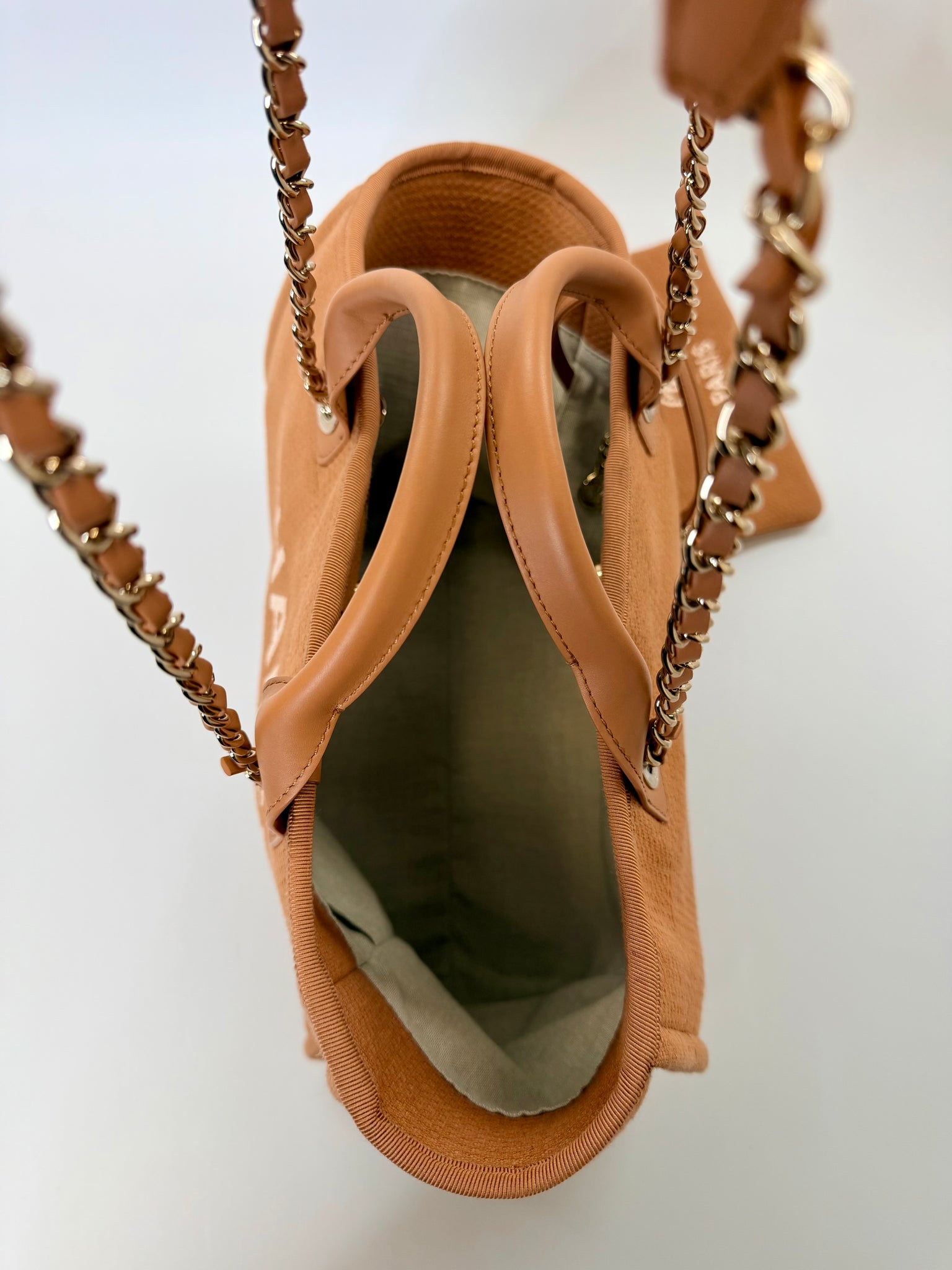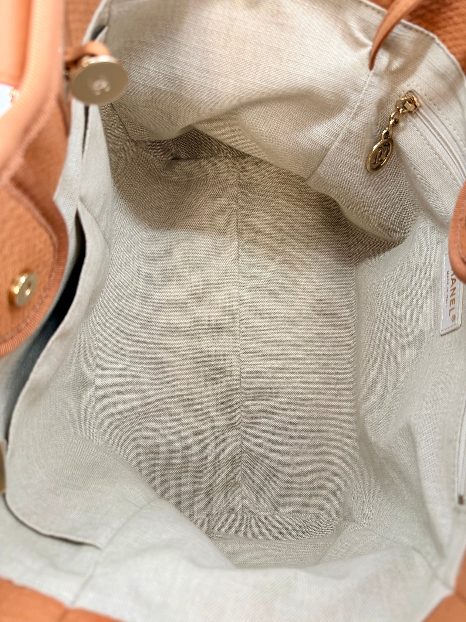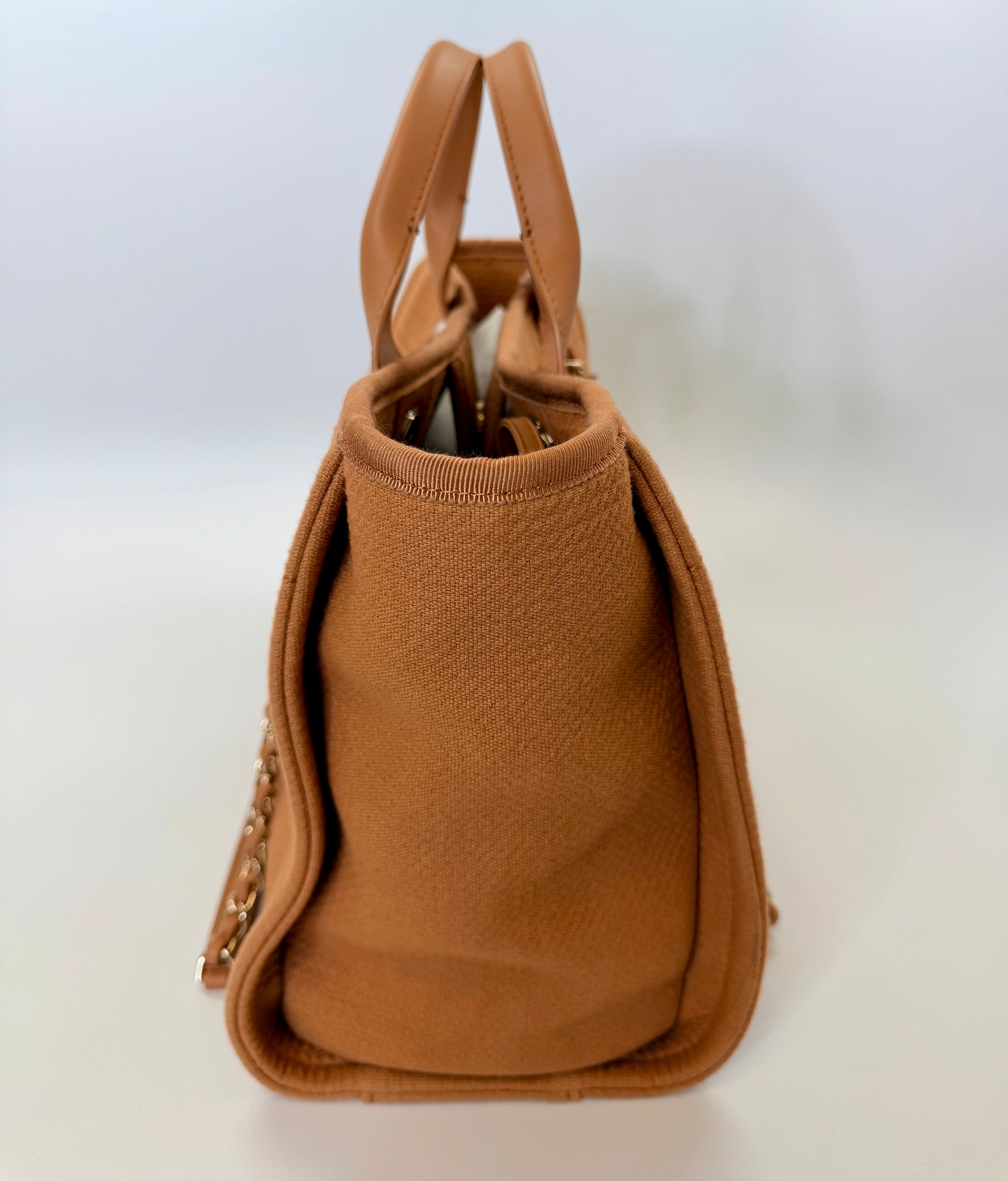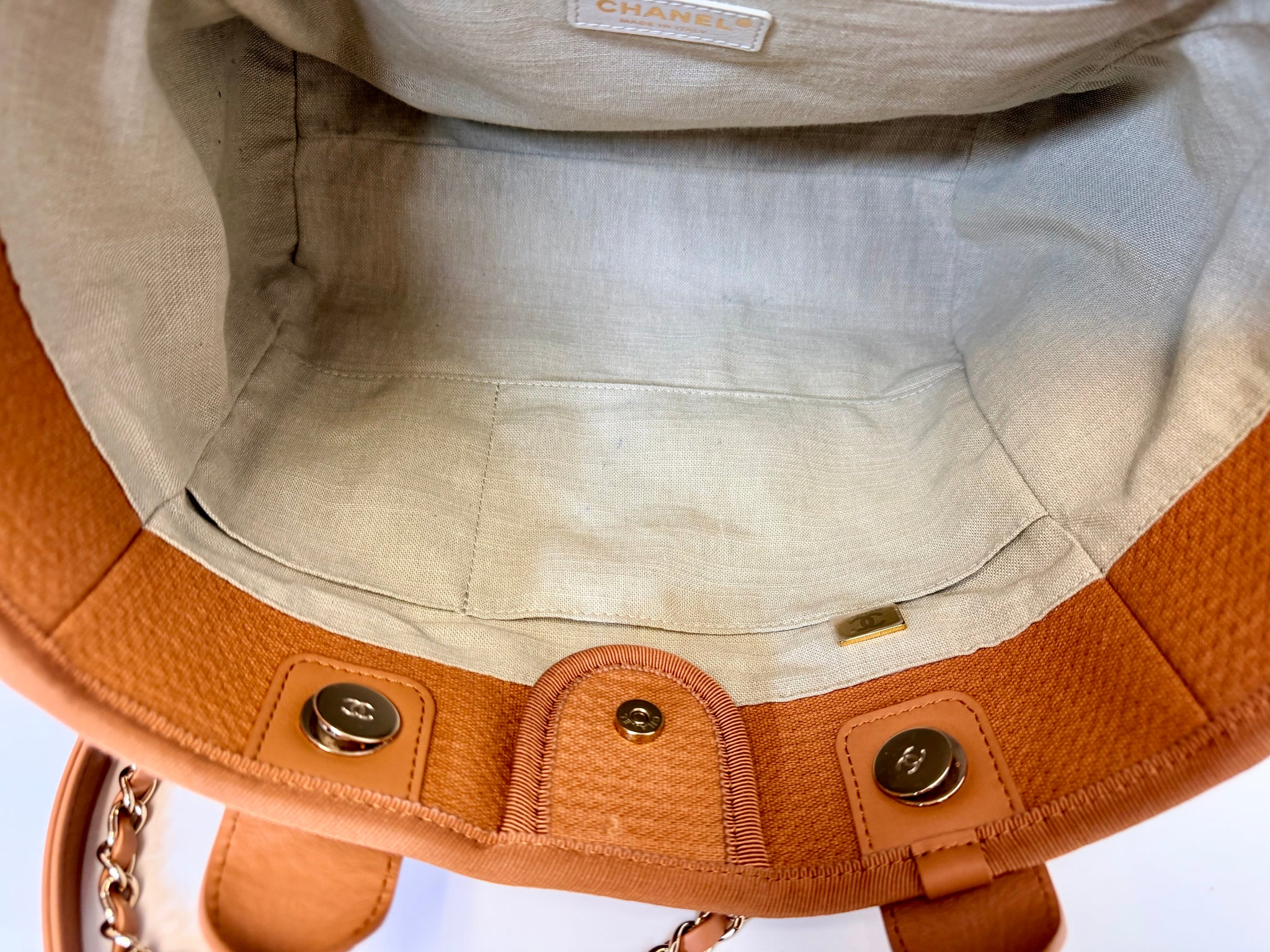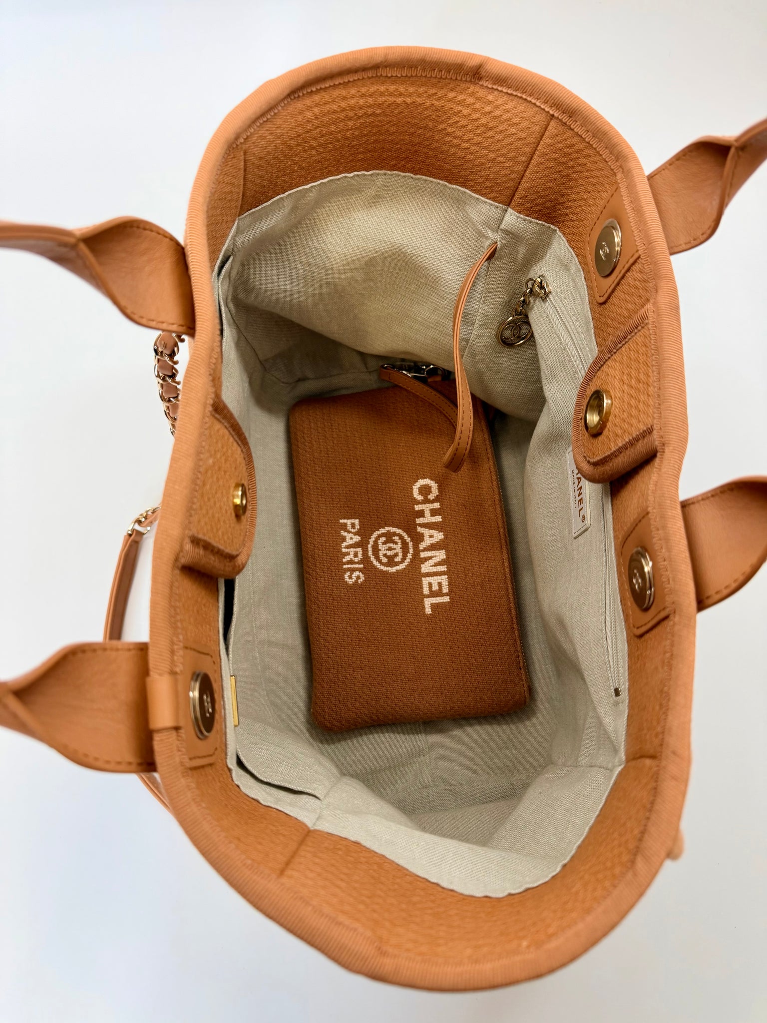This is a pre-owned CHANEL marro and ivory mixed fibers, leather and gold tone metal hardware Deauville Shopping Bag with Pouch. She features a center snap closure, leather top handles and chain and leather shoulder straps laced in leather.