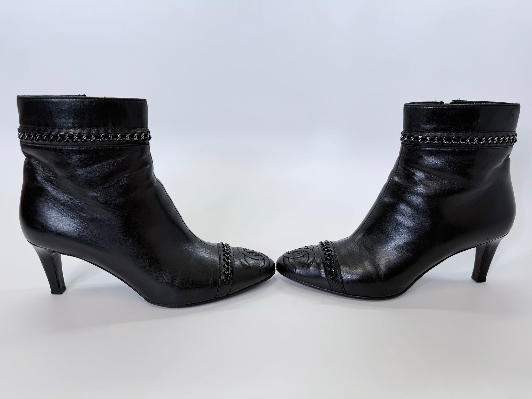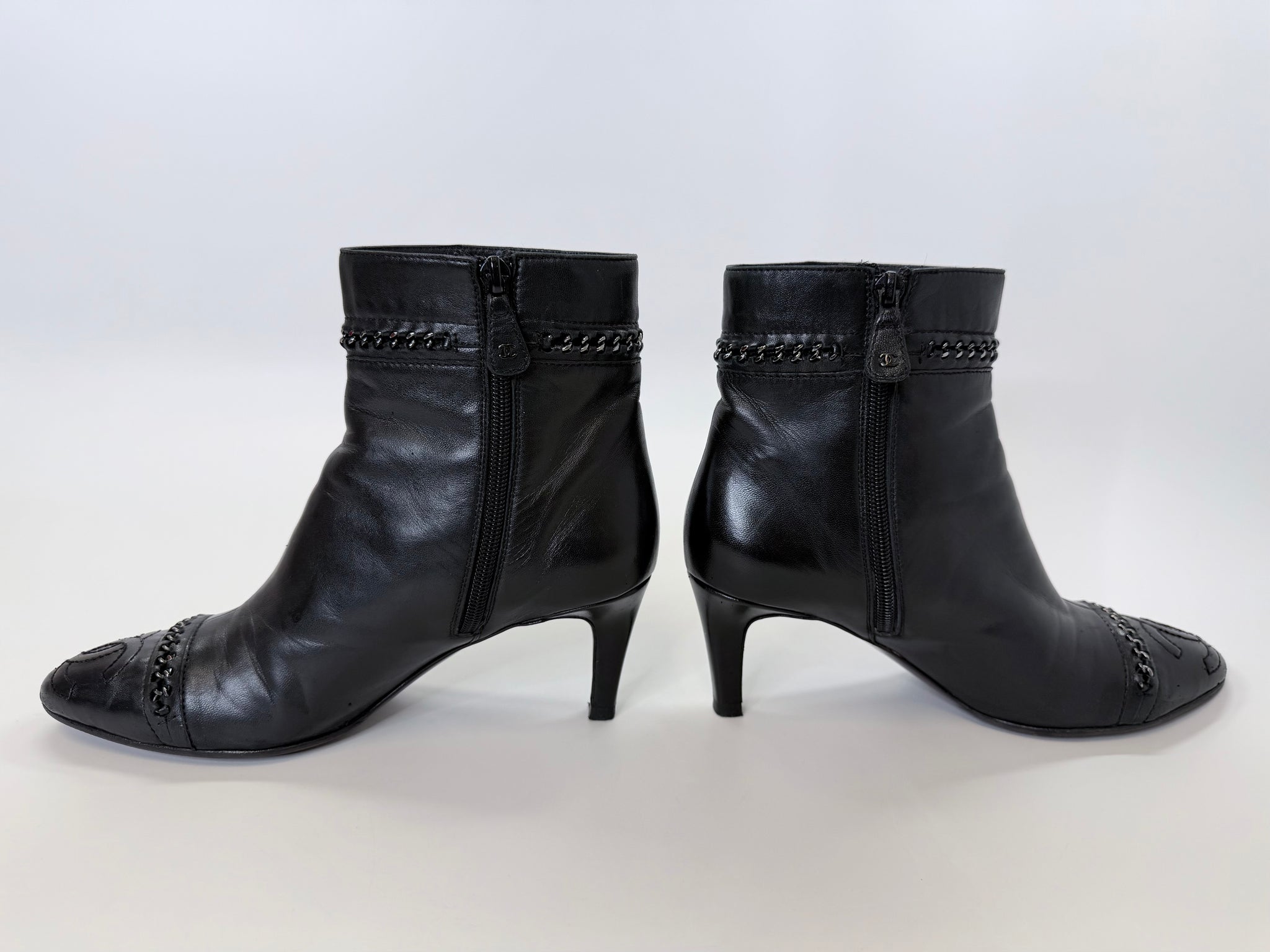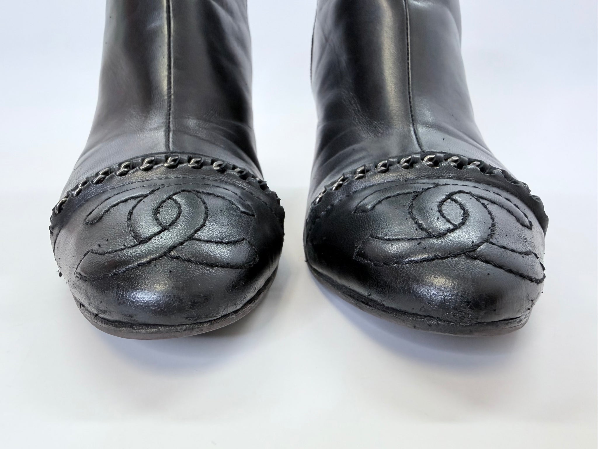 These are pre-owned CHANEL black leather CC cap toe boots. They feature silver metal hardware, decorative chains and inside zip closures with CC zipper pulls.