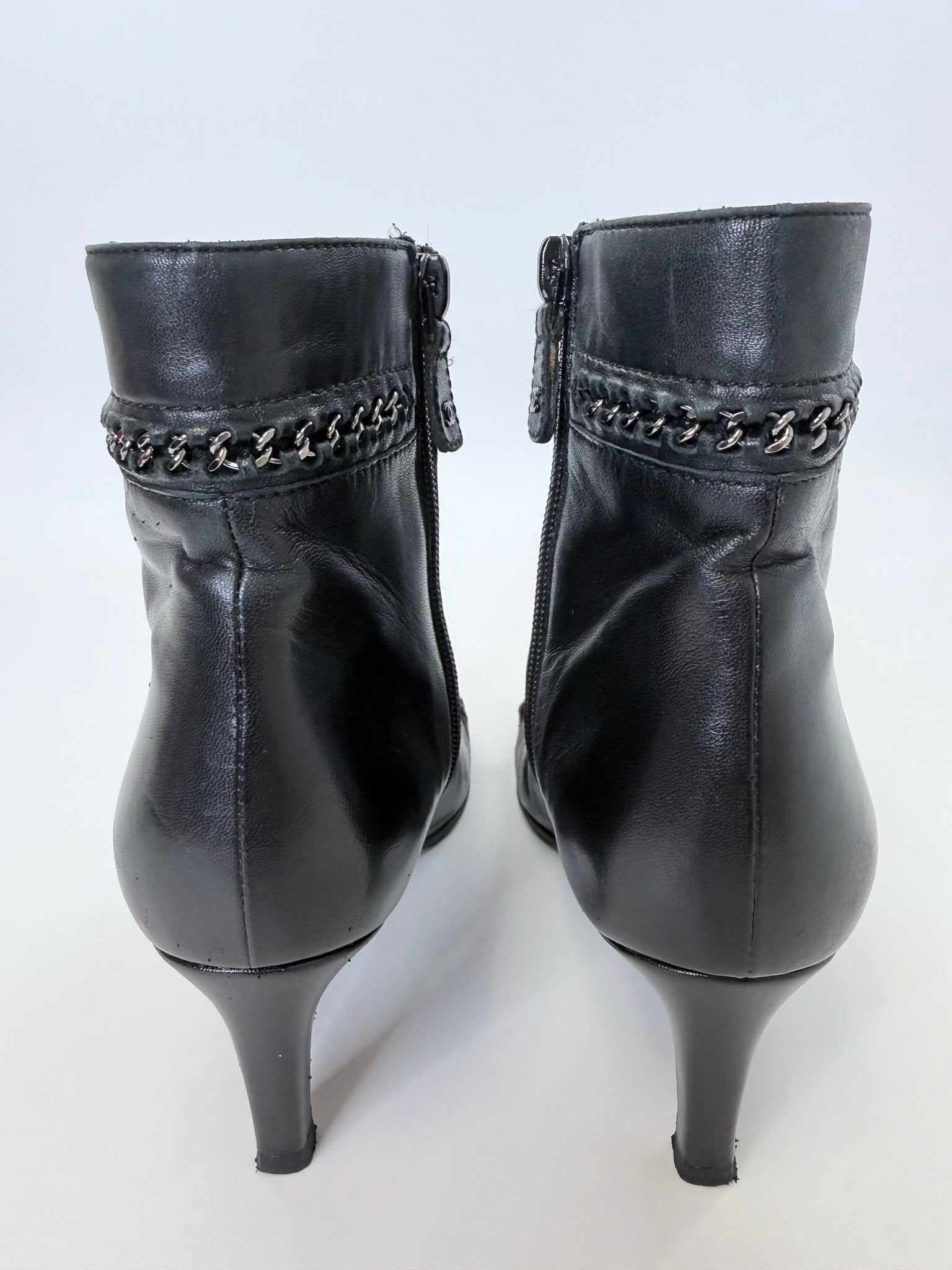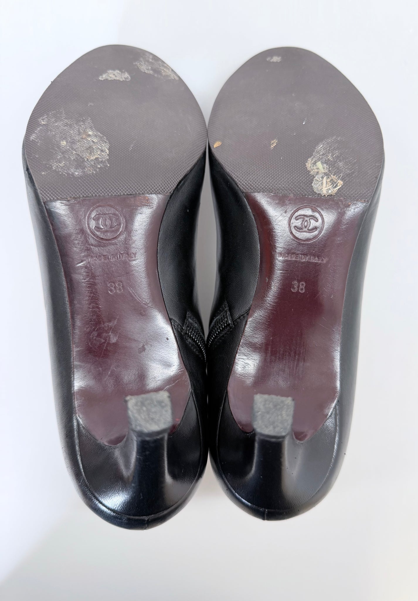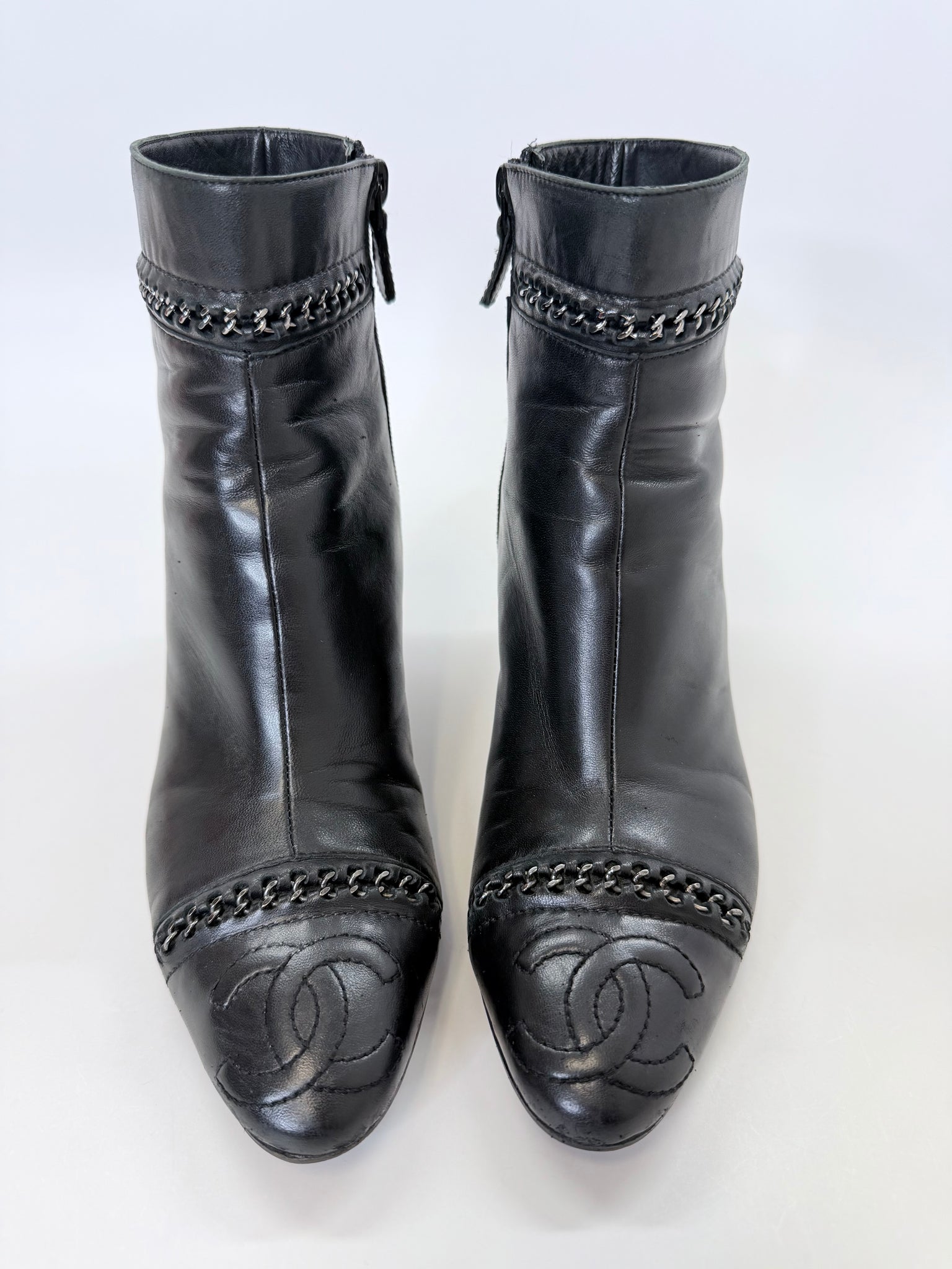 These are pre-owned CHANEL black leather CC cap toe boots. They feature silver metal hardware, decorative chains and inside zip closures with CC zipper pulls.