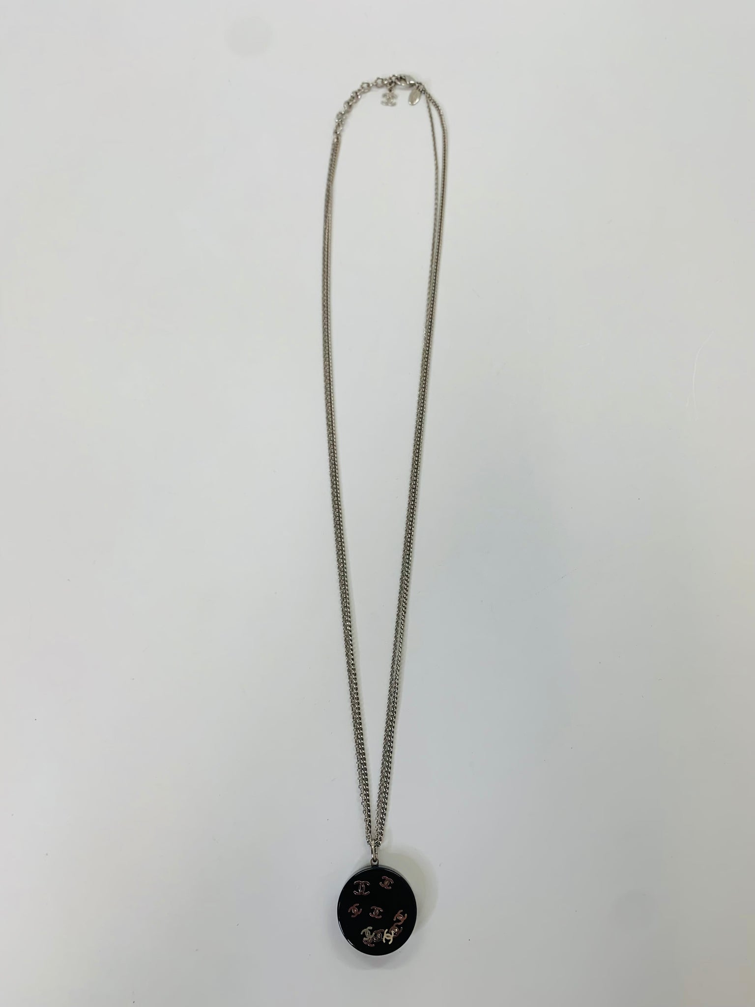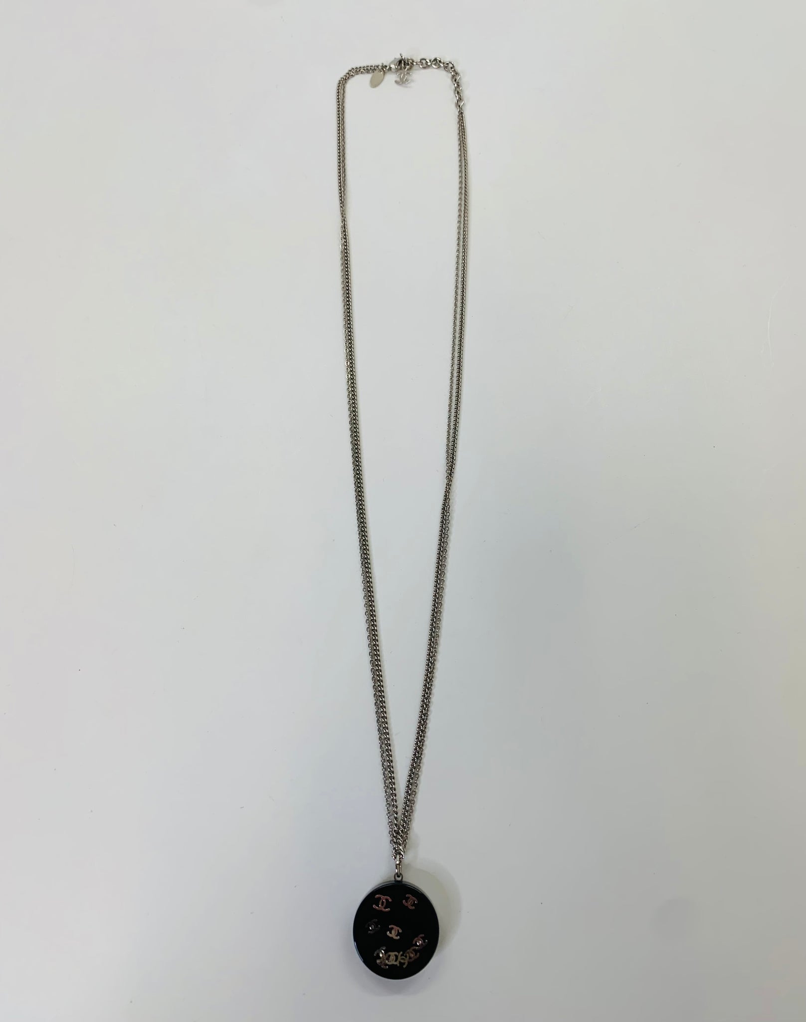 This is a pre-owned CHANEL silver metal and black resin with floating CC’s pendant necklace. She features a lobster claw clasp closure.