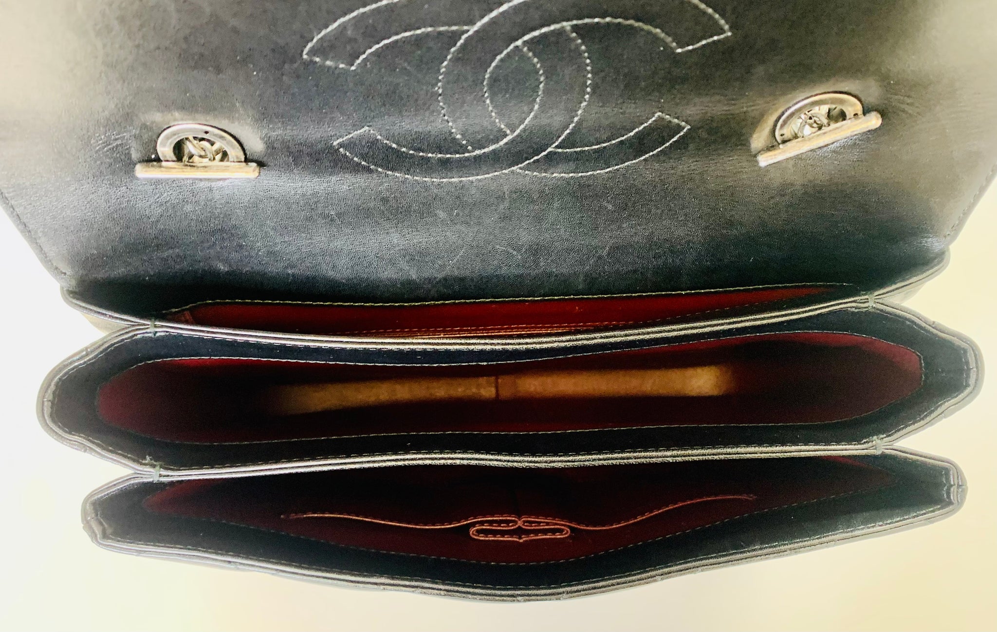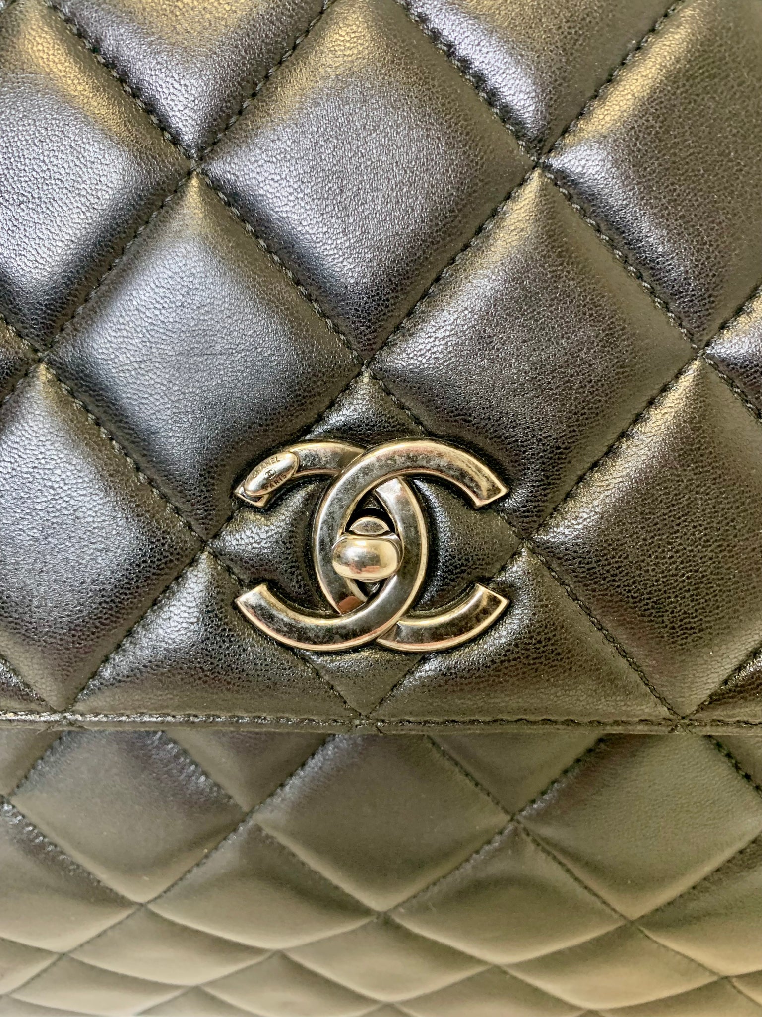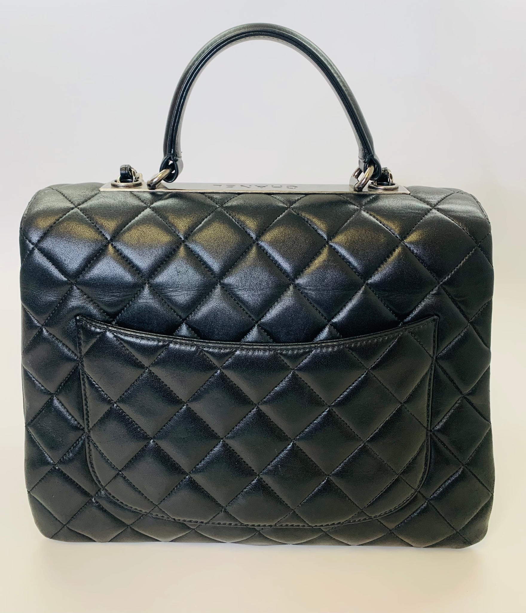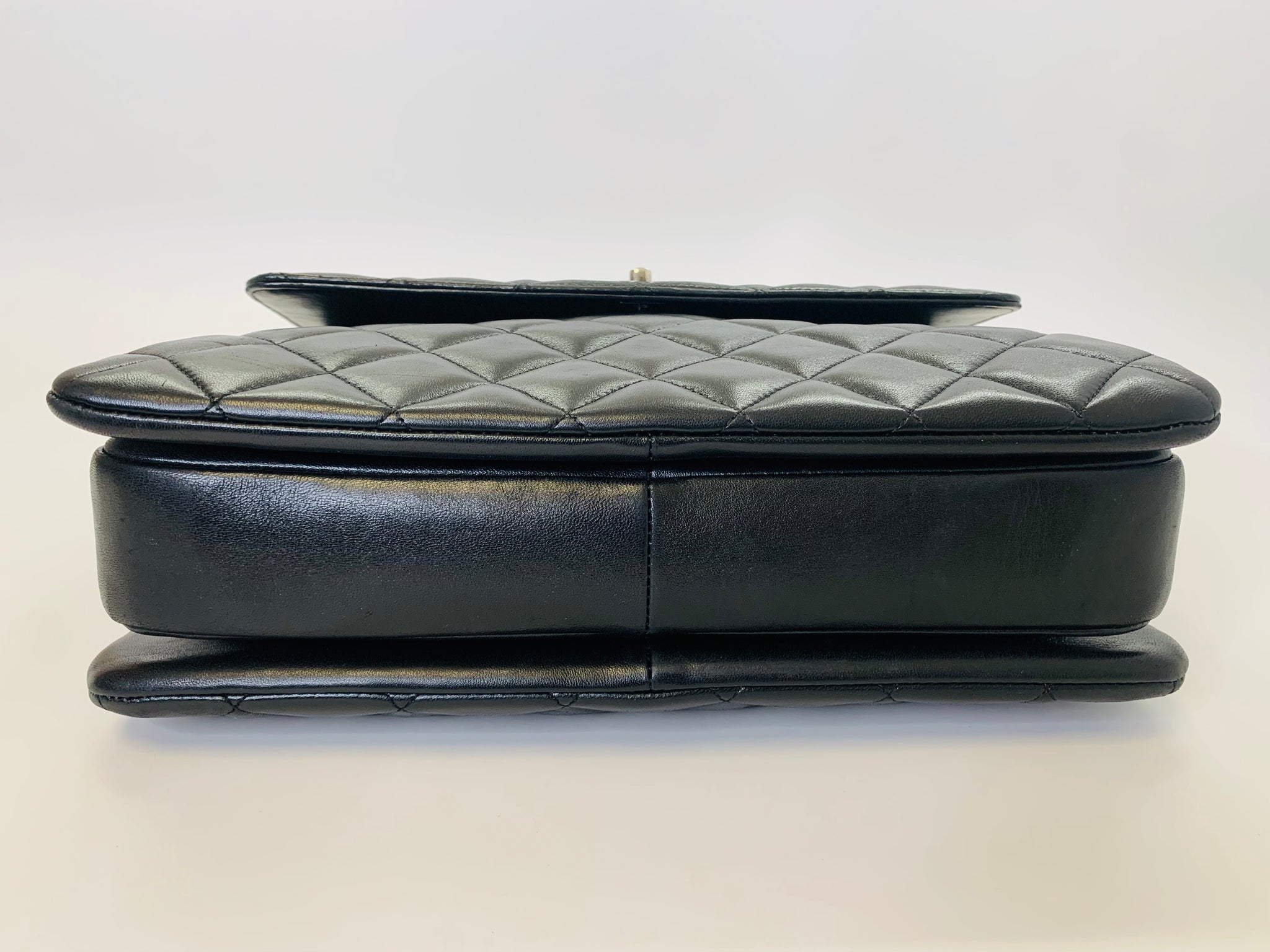 This is a pre-owned CHANEL large black quilted leather Flap Bag with a top handle. She features ruthenium metal hardware, a CC turnlock clasp closure, a chain shoulder strap threaded in black leather, a CHANEL letters plate under the top handle and one open back pocket.