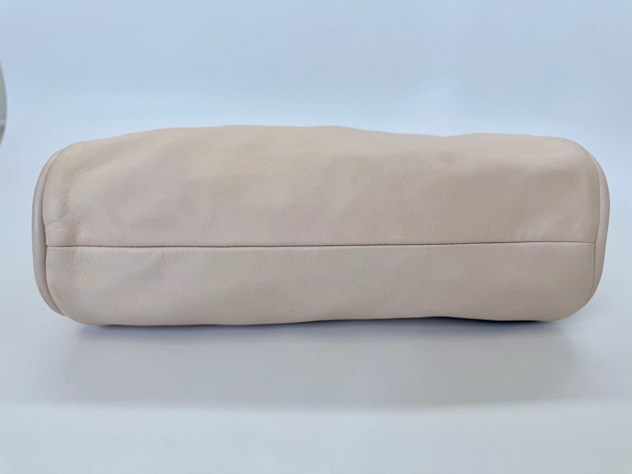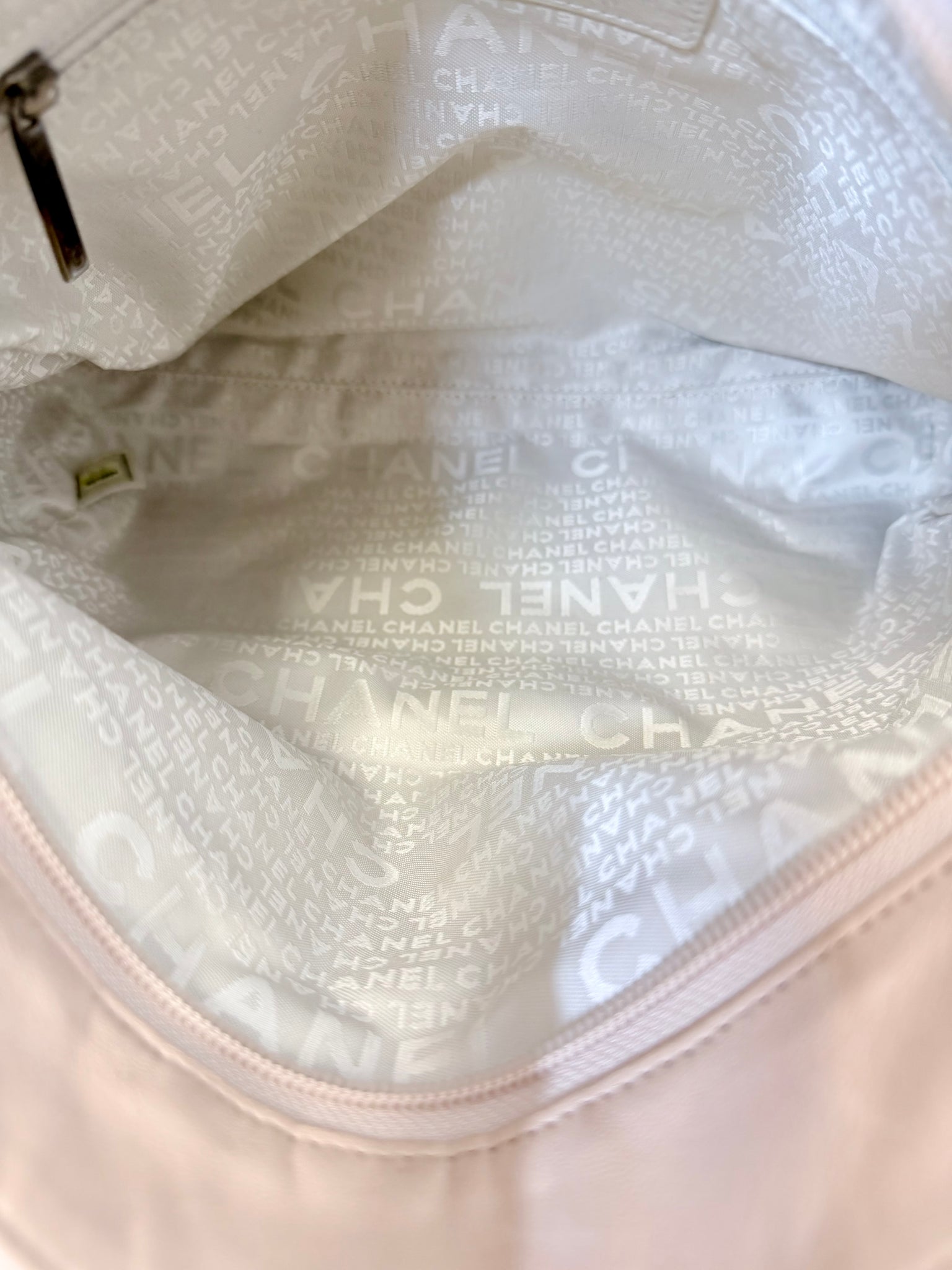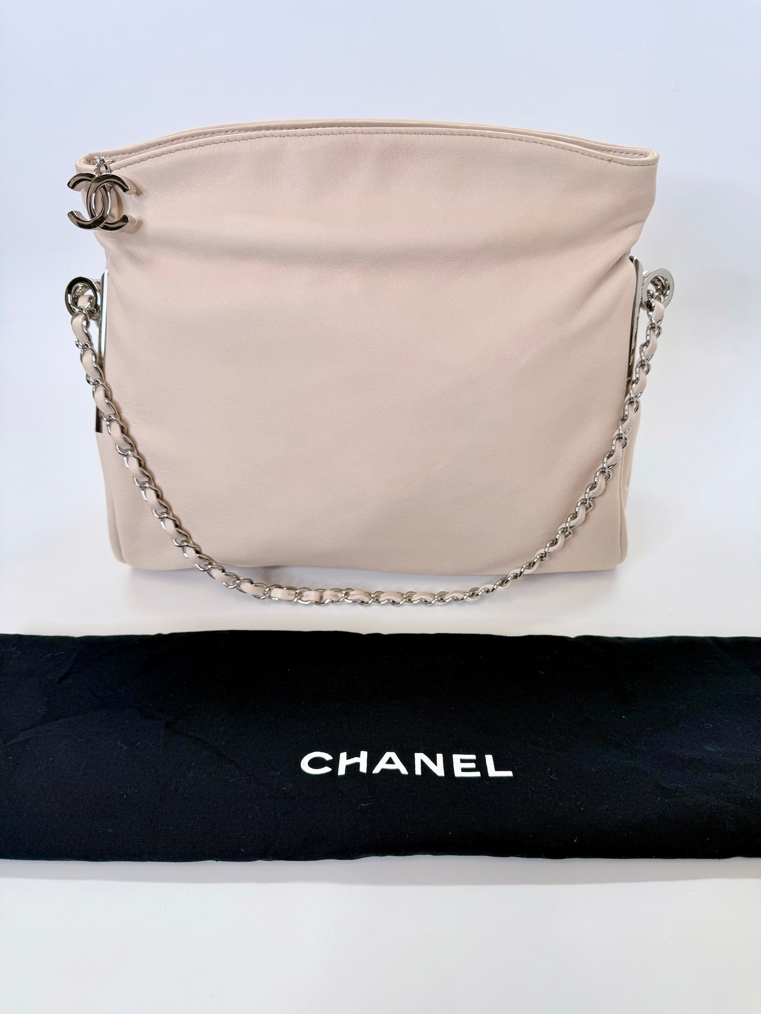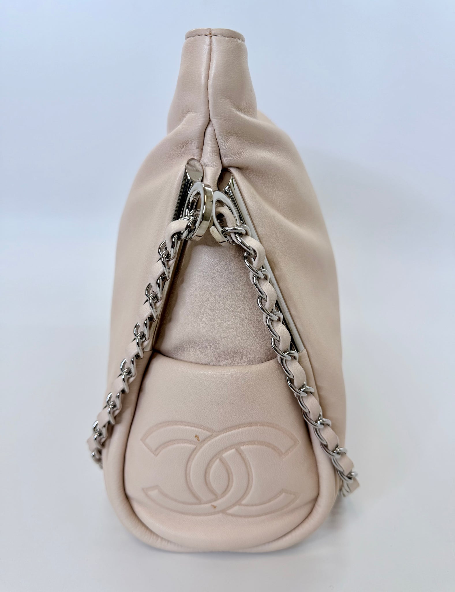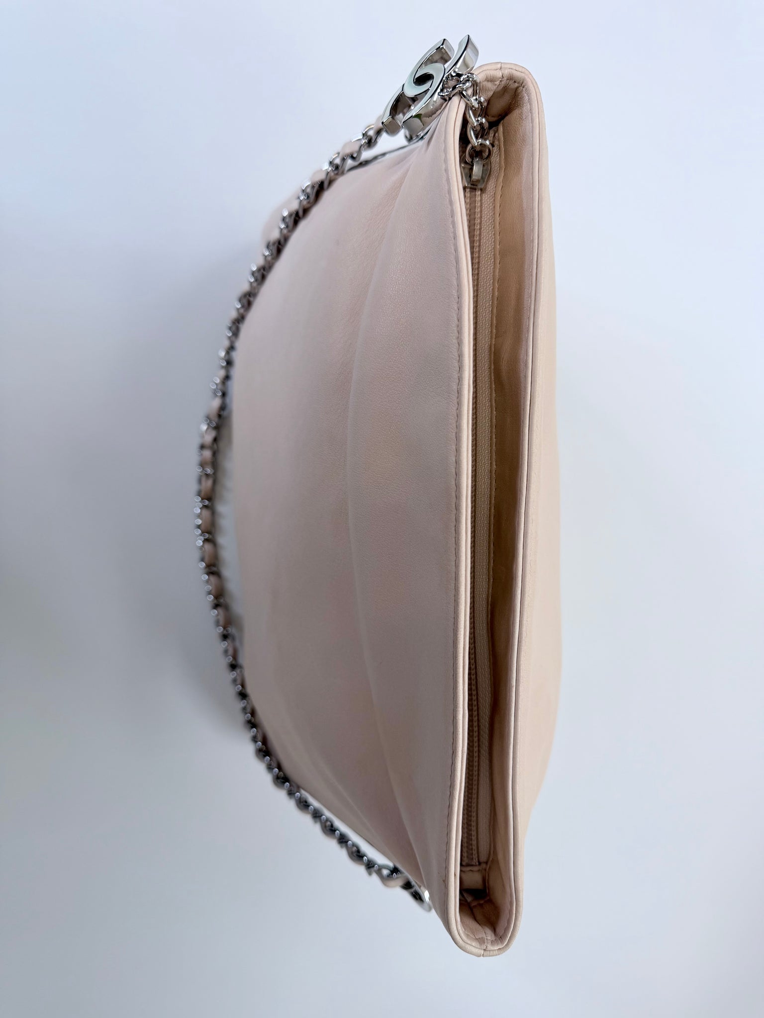 This is a pre-owned CHANEL blush pink lambskin with silver metal hardware Ultimate Soft Hobo bag. She features a zip top closure with a silver metal CC zipper pull, CC embossed open side pockets and a silver metal sliding chain threaded in leather that can be carried doubled and short or long and single.