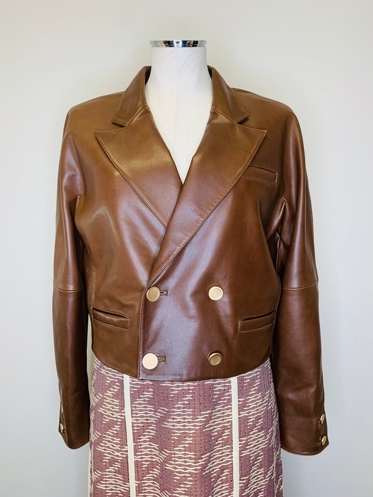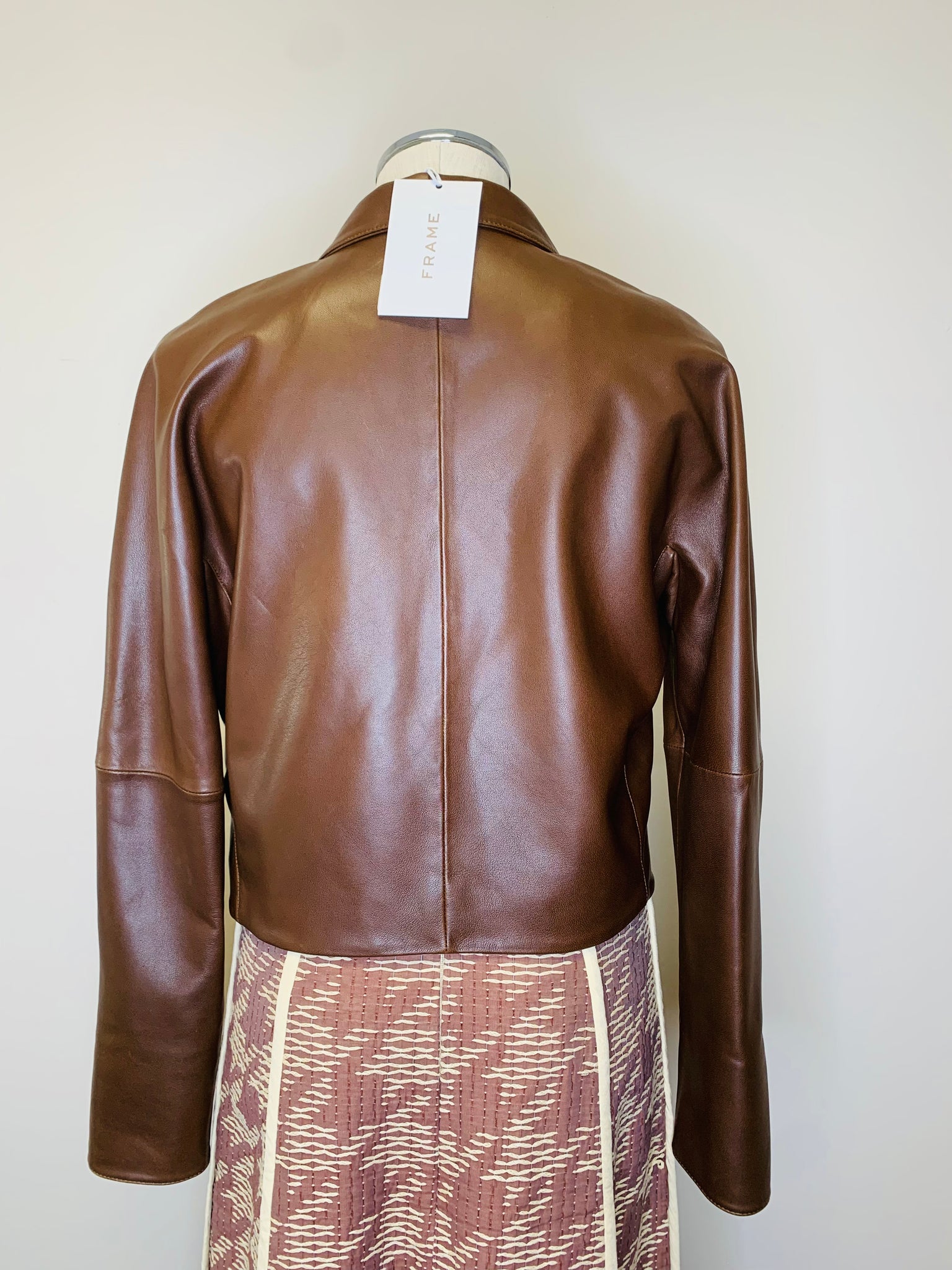 This is a pre-owned Frame cedar leather Timeless jacket. She features gold metal buttons and two open front pockets.