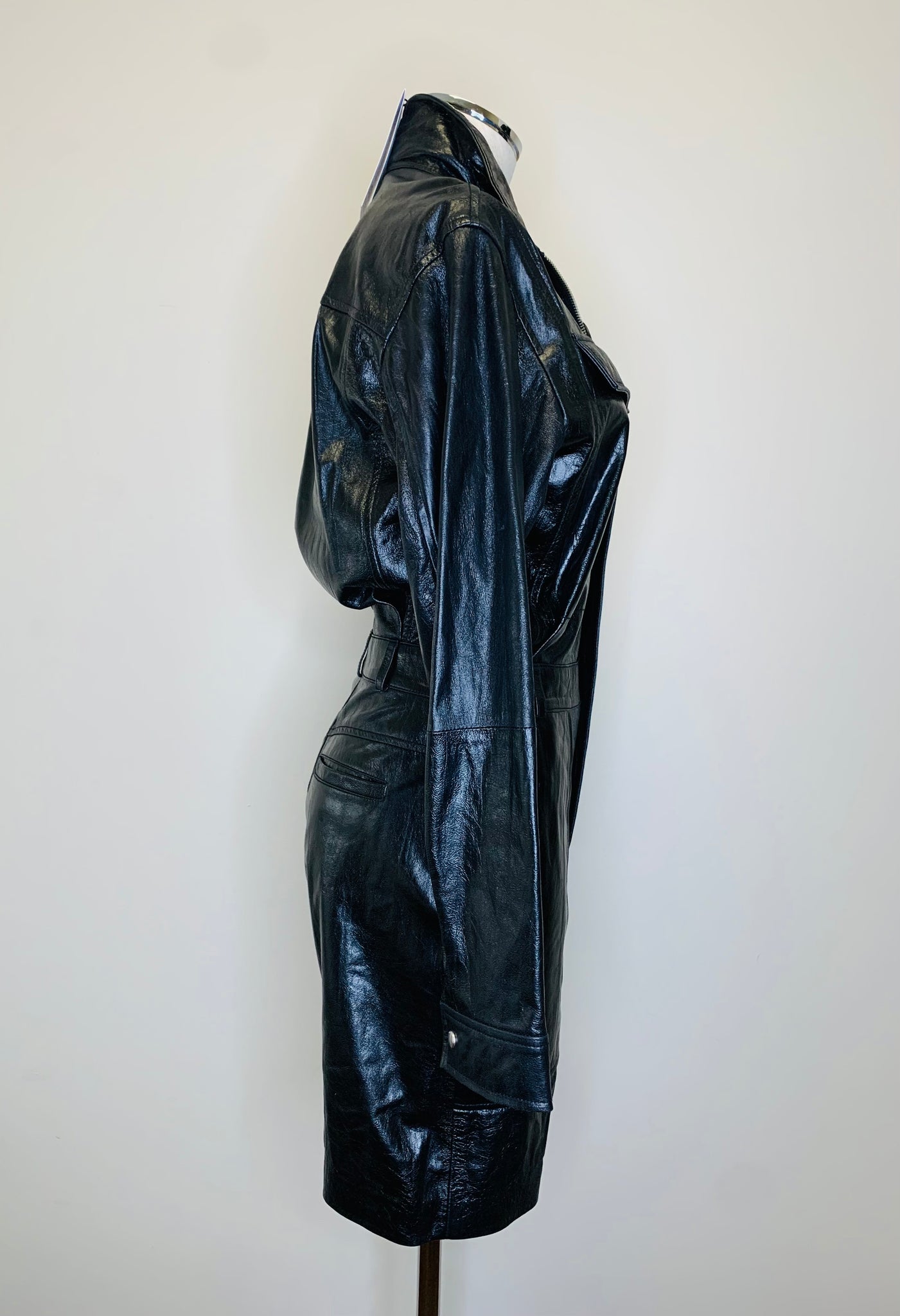 This is a pre-owned Iro Satya black leather jumpsuit. She features a covered placket zip front closure with snap, belts loops, front chest pockets, side slit pockets and snap closure cuffs.