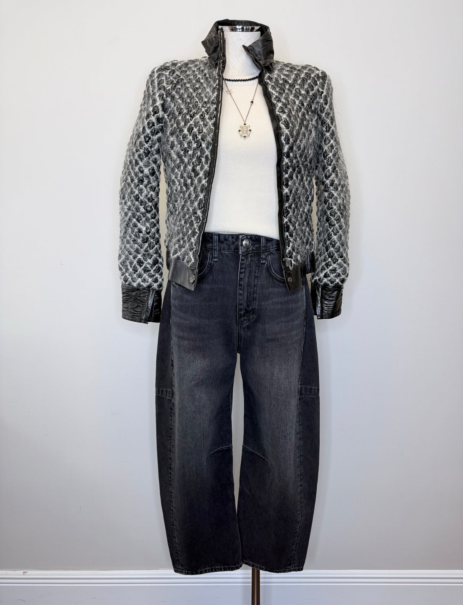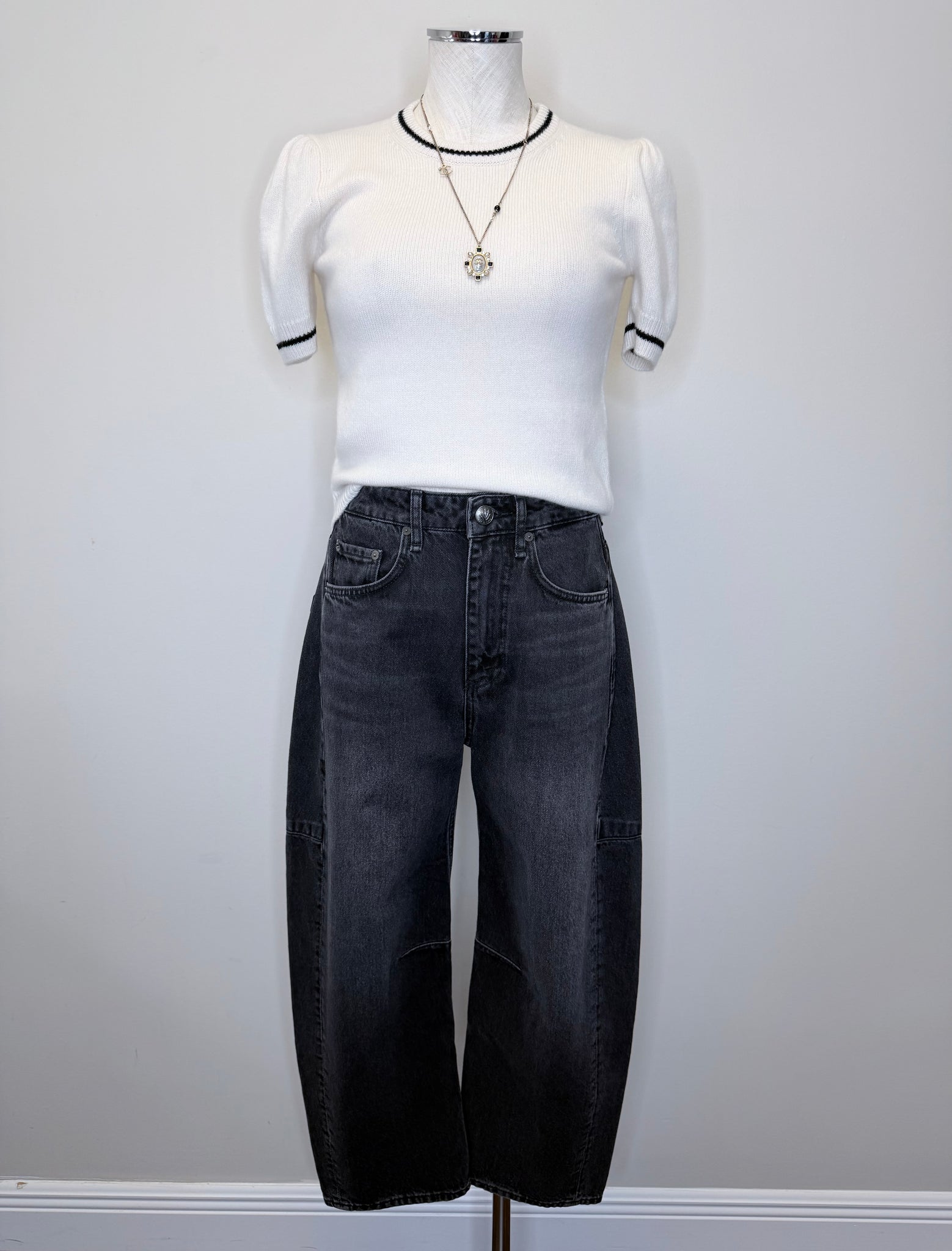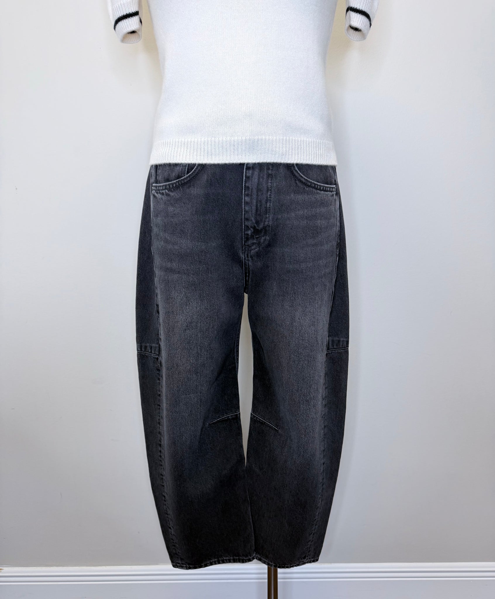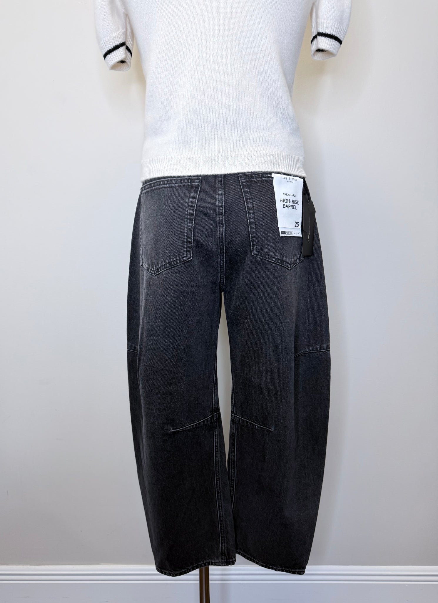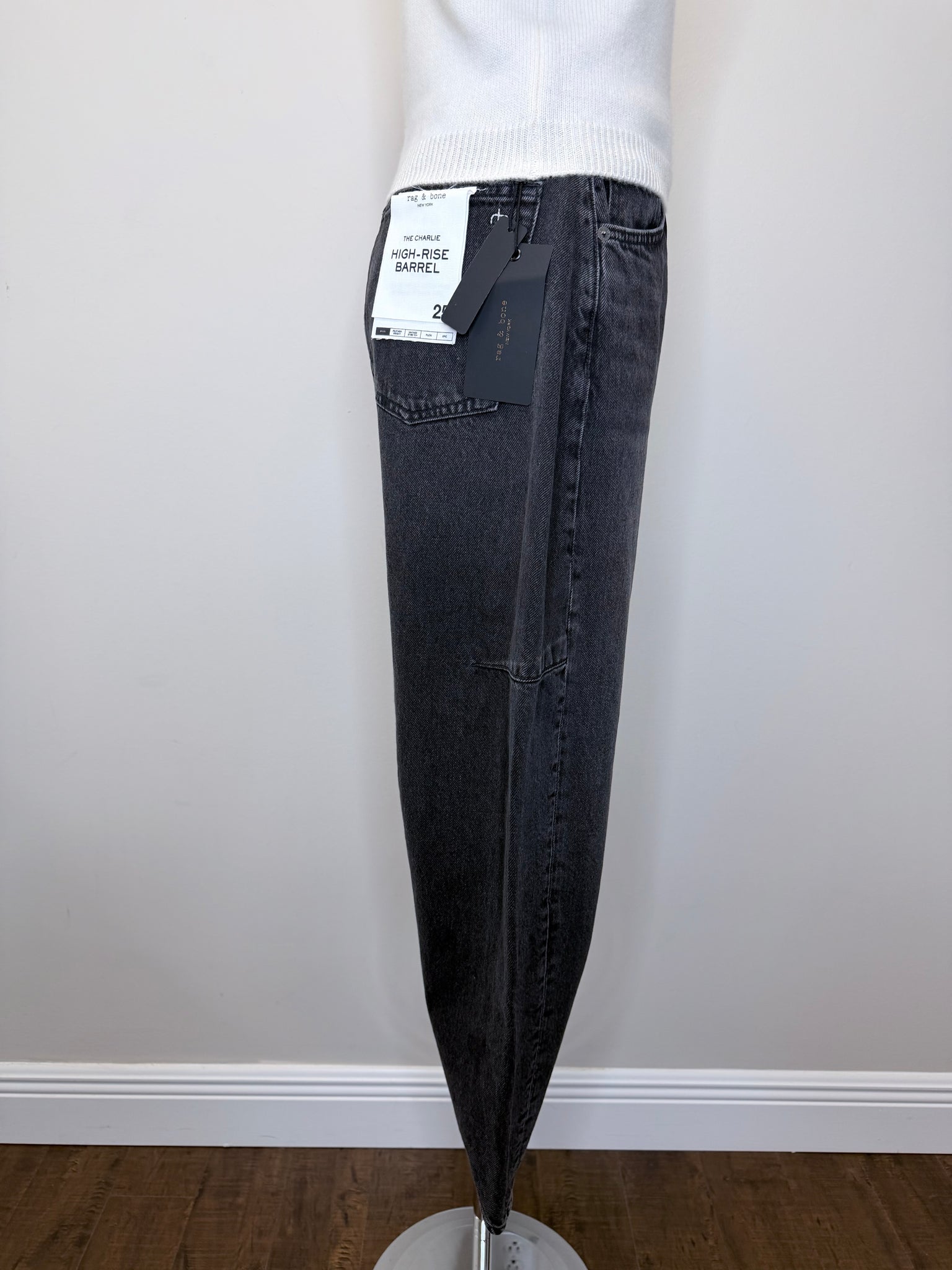 These are pre-owned Rag & Bone black stone Charlie high rise barrel leg jeans. They feature a zip front with single button closure.