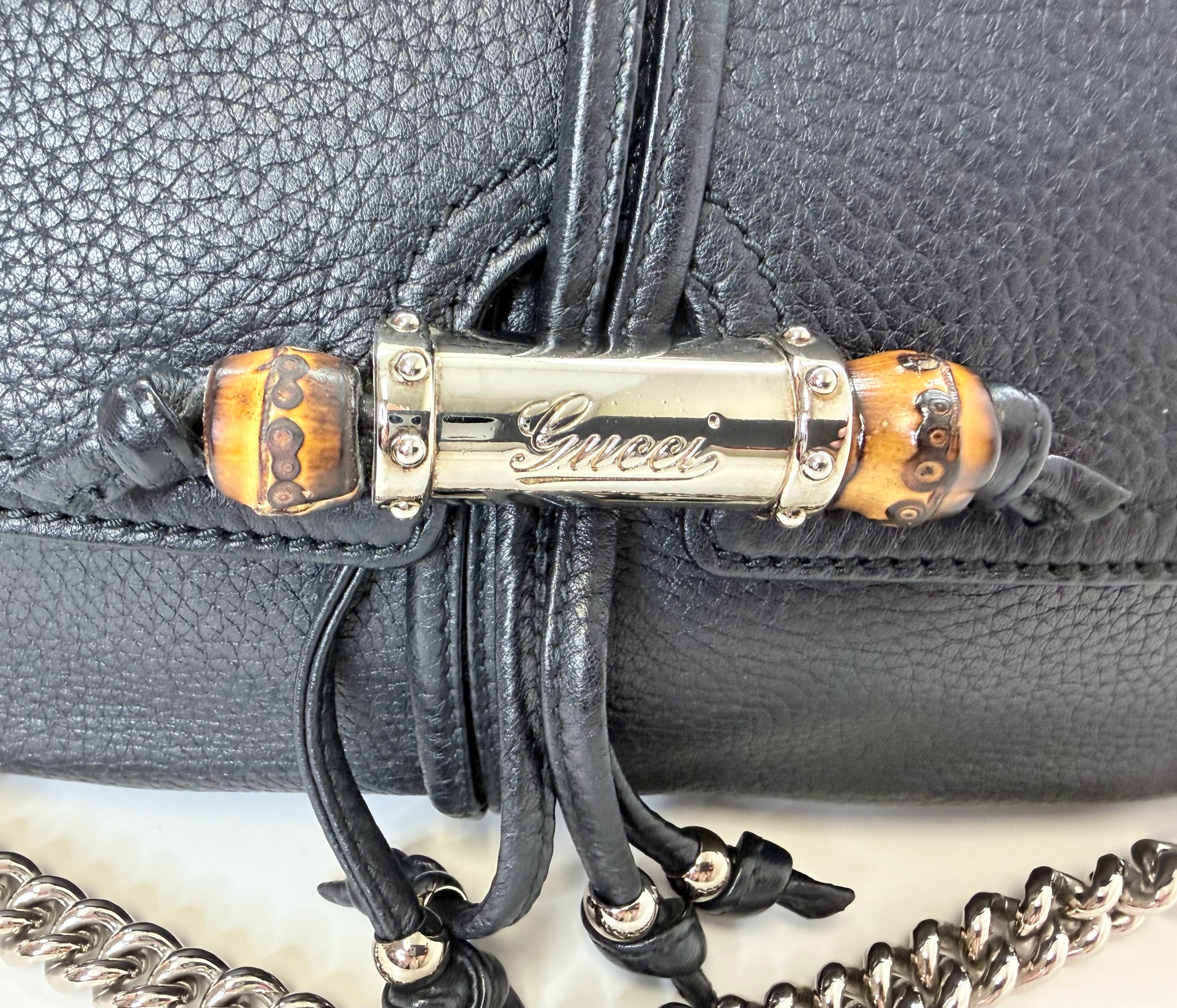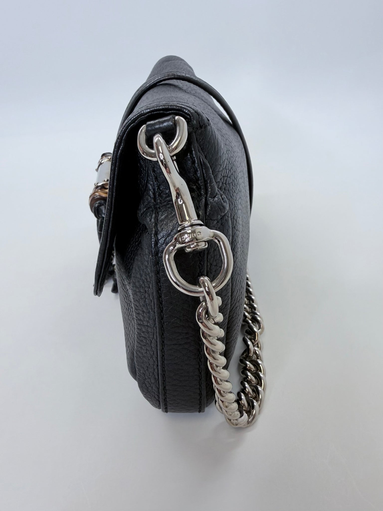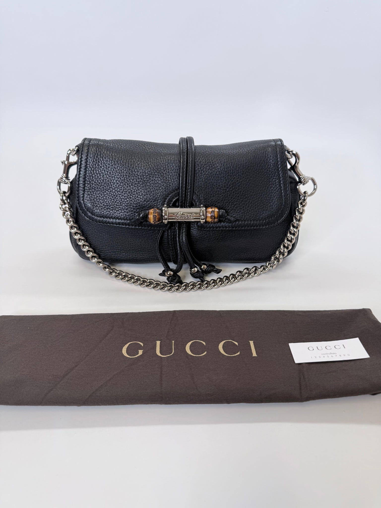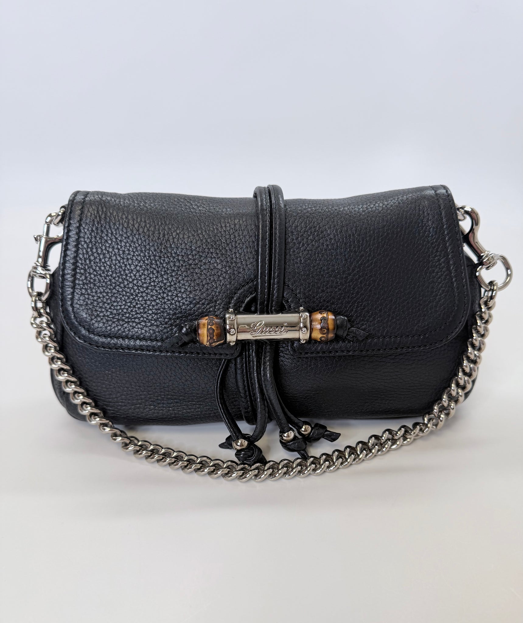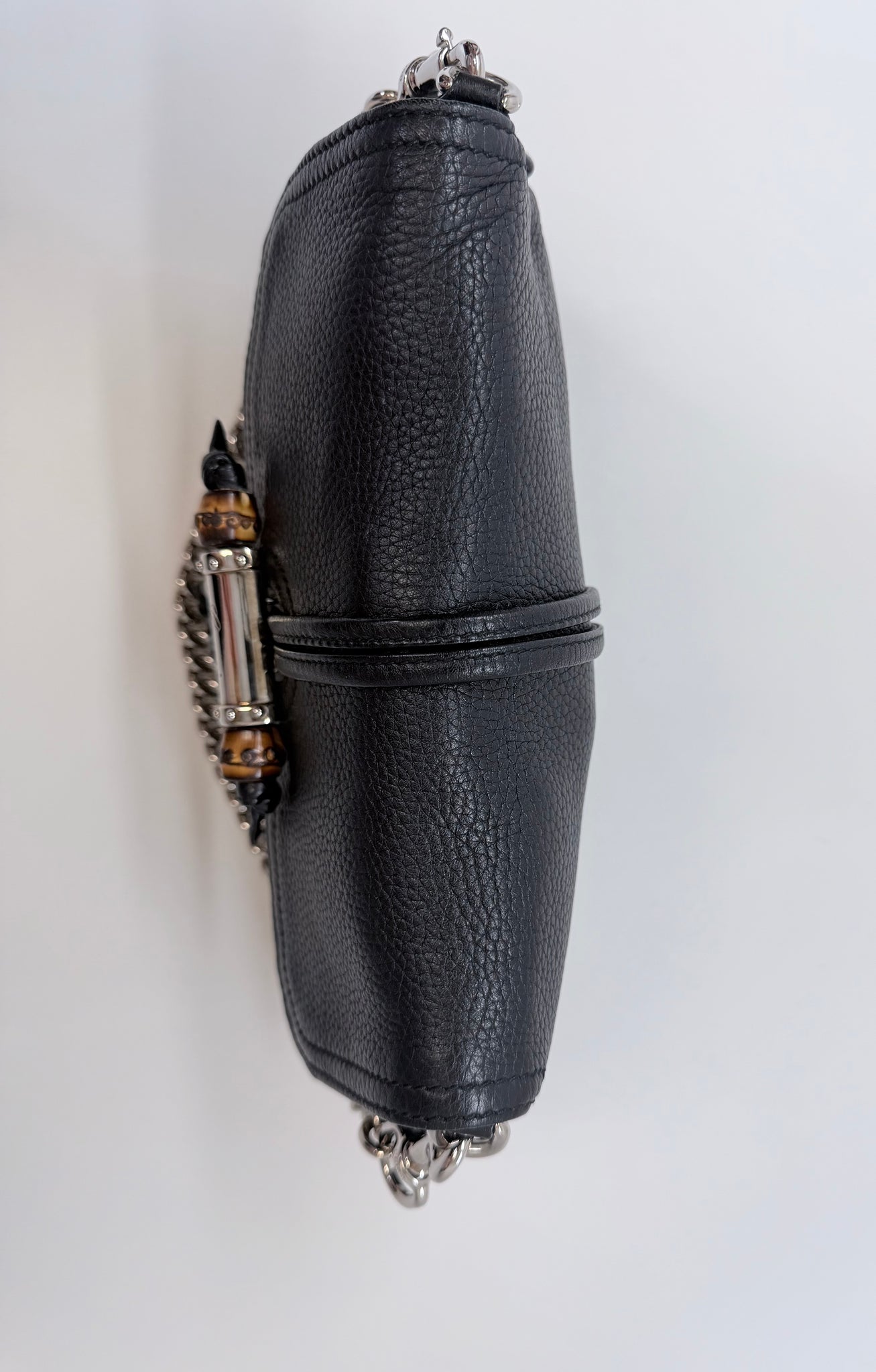 This is a pre-owned Gucci black pebbled leather Croisette bamboo bag with silver metal hardware.  She features a flap top closure, decorative tassels with silver metal hardware and a detachable silver metal chain strap.