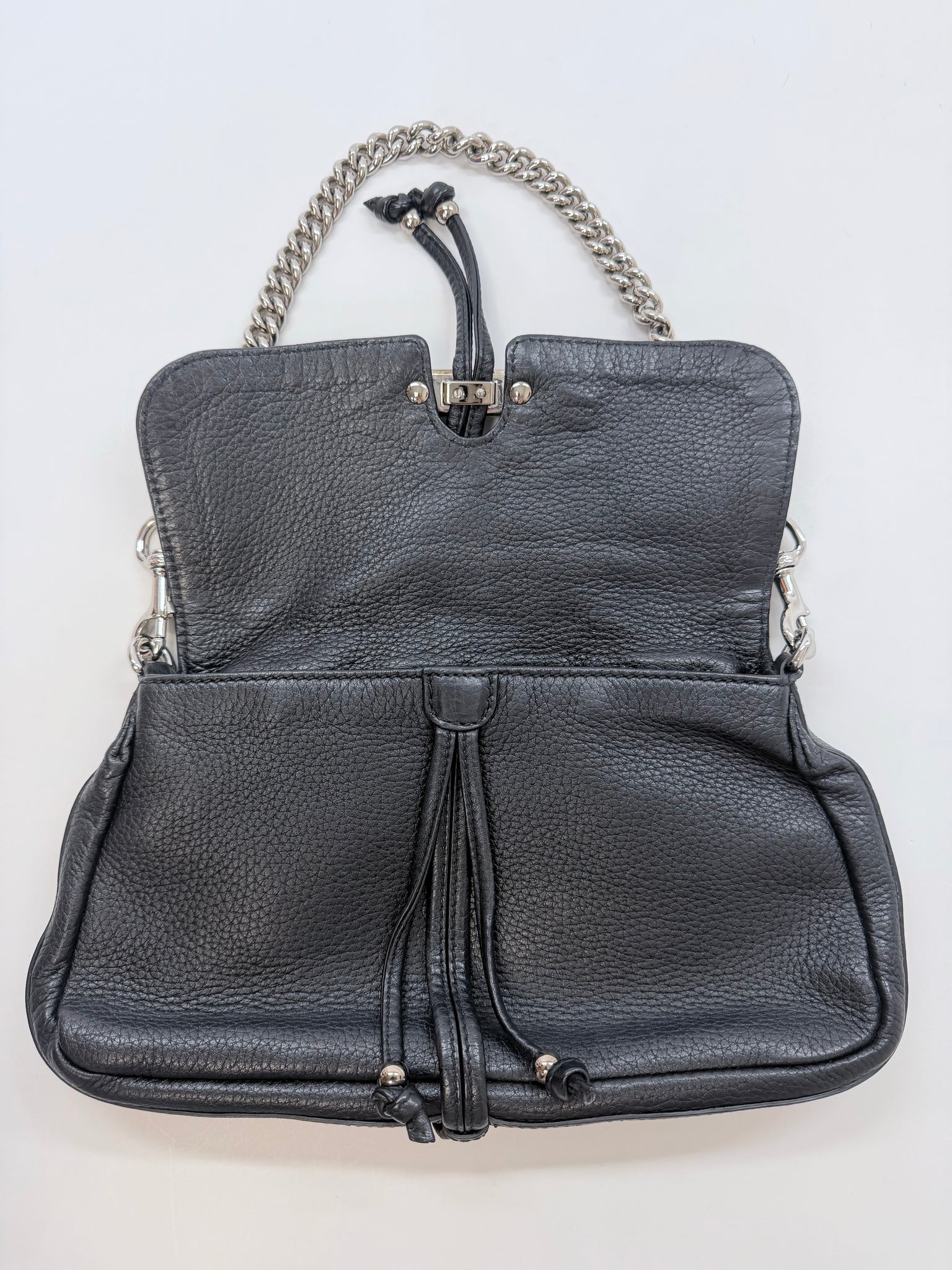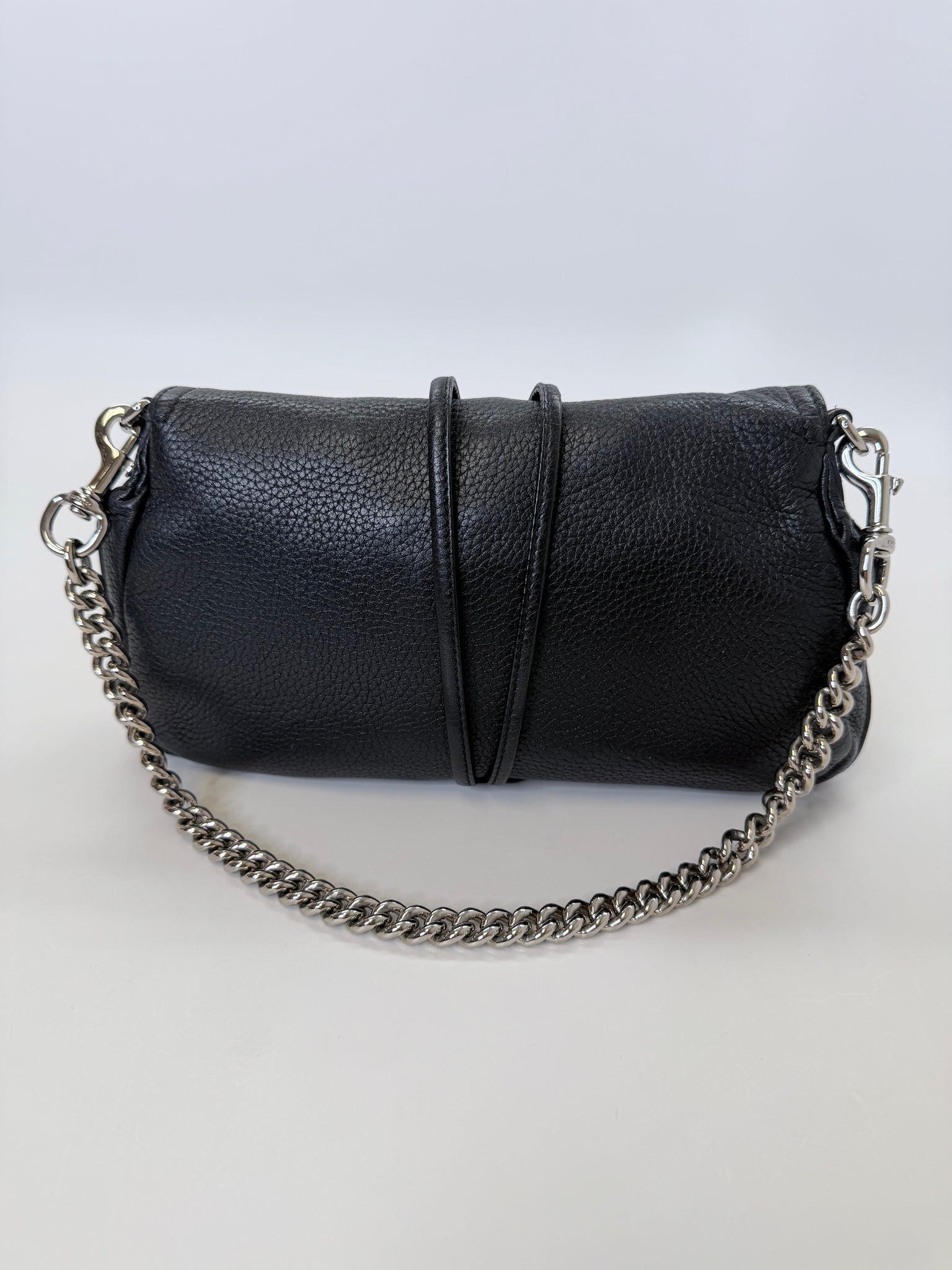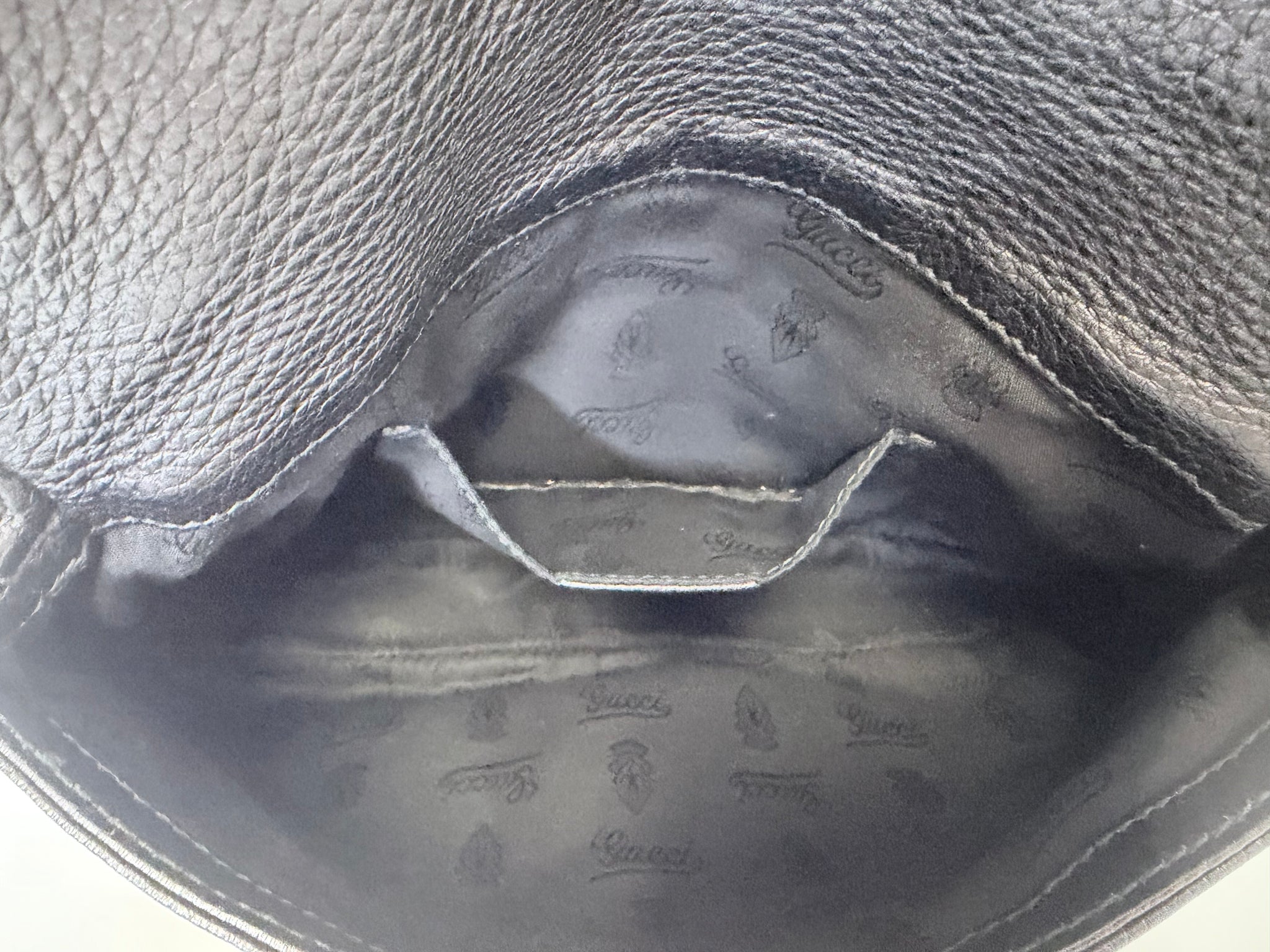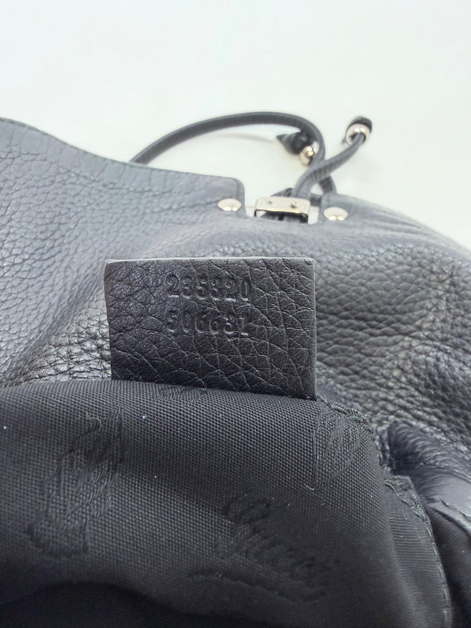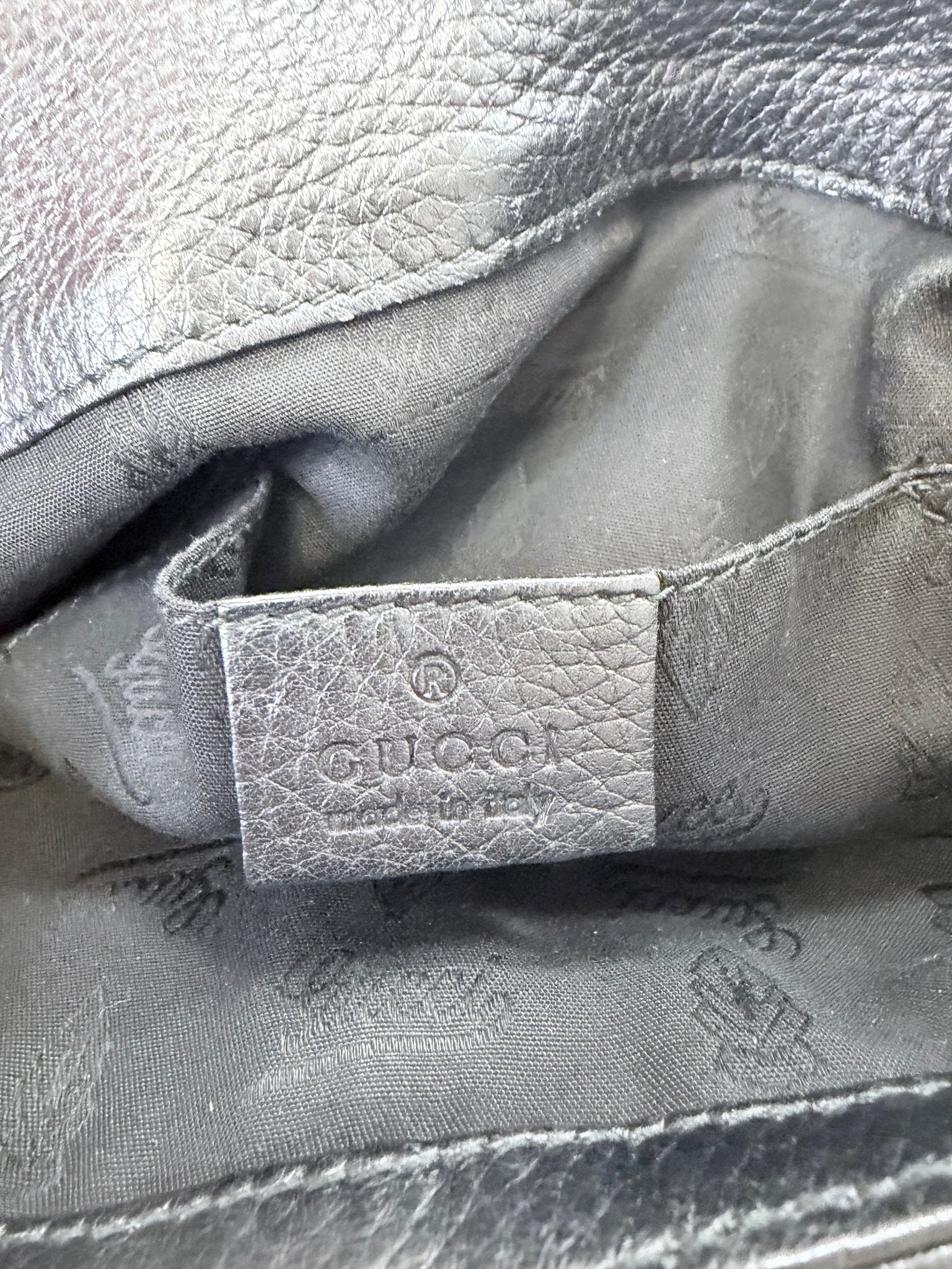This is a pre-owned Gucci black pebbled leather Croisette bamboo bag with silver metal hardware.  She features a flap top closure, decorative tassels with silver metal hardware and a detachable silver metal chain strap.