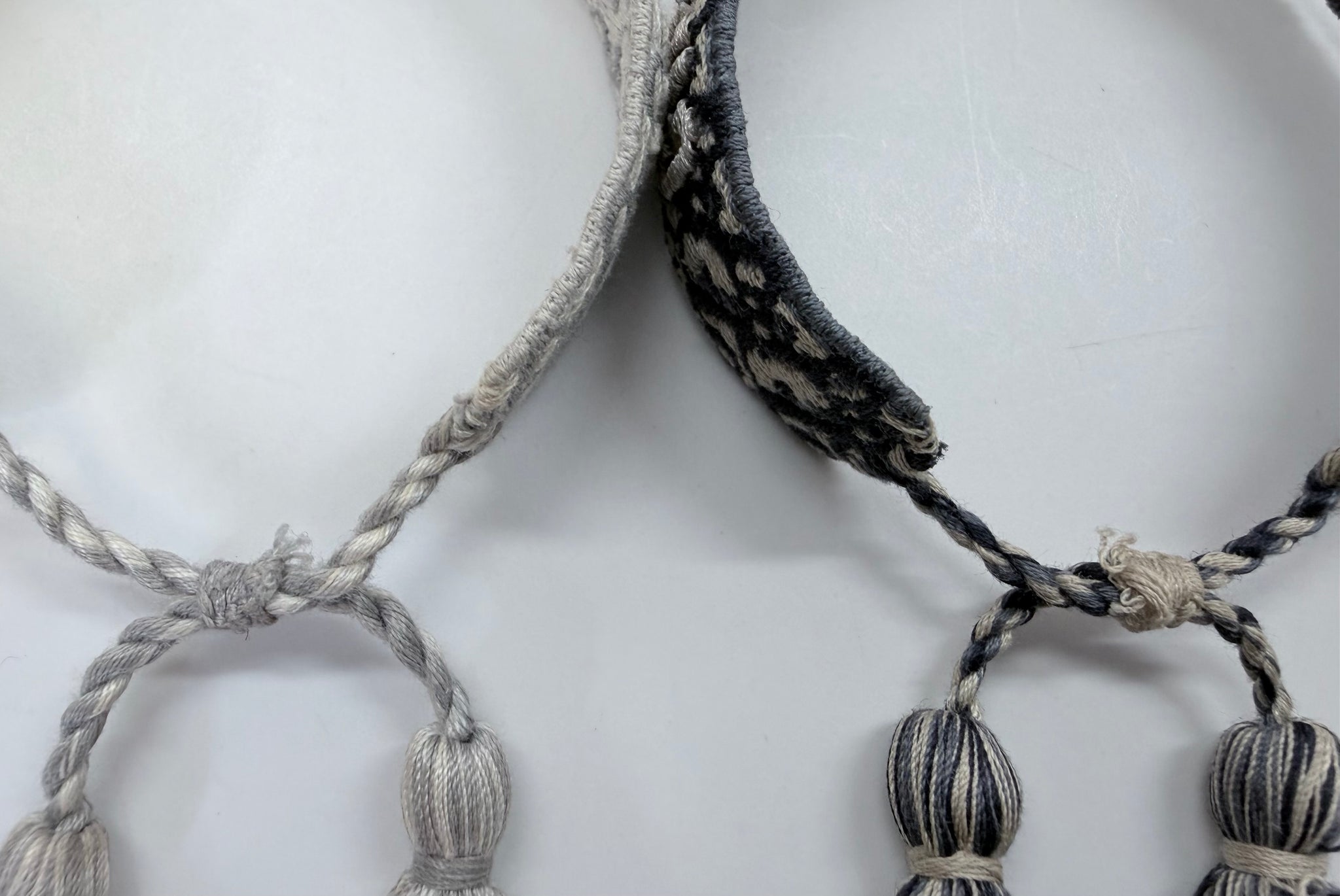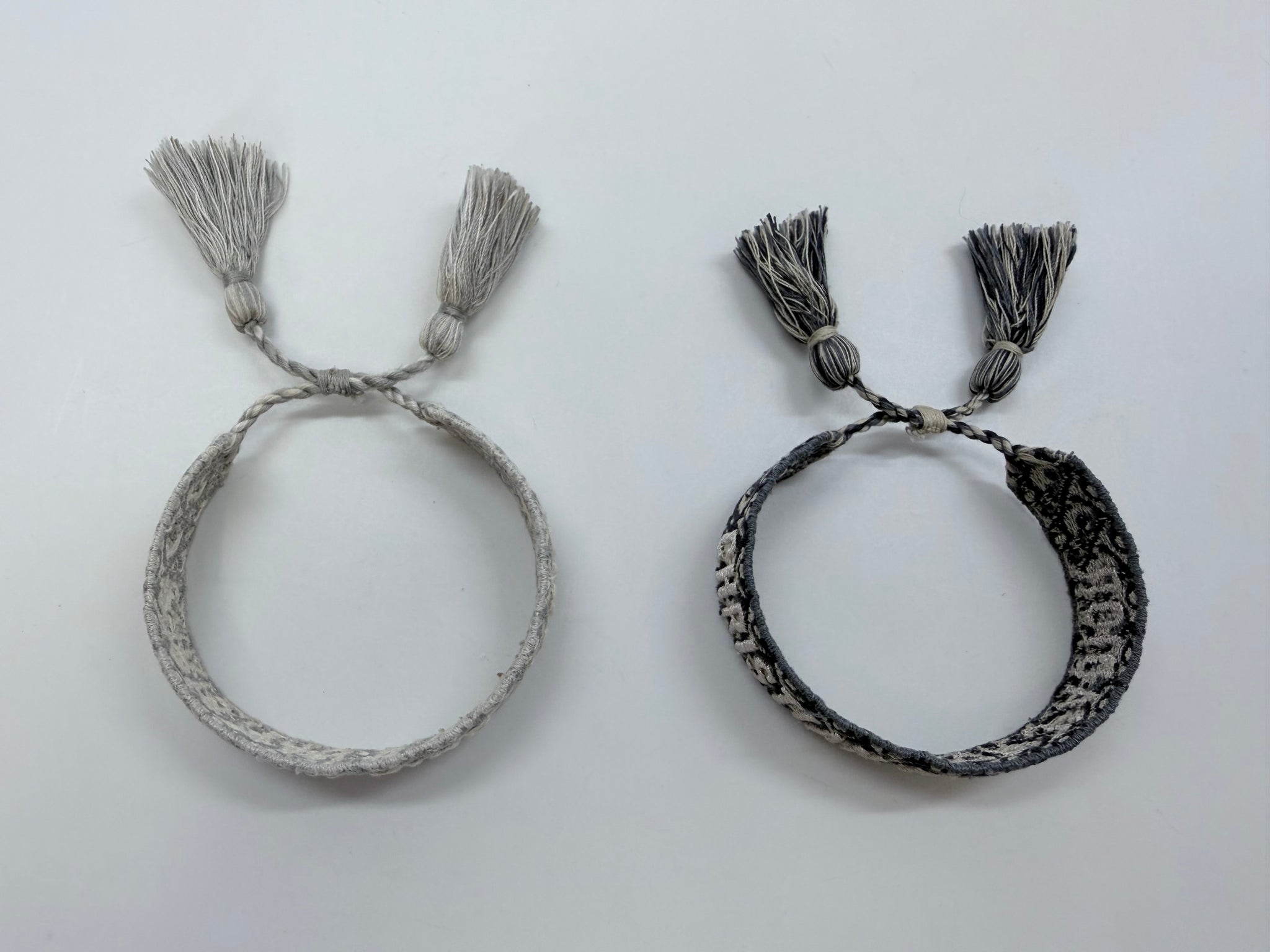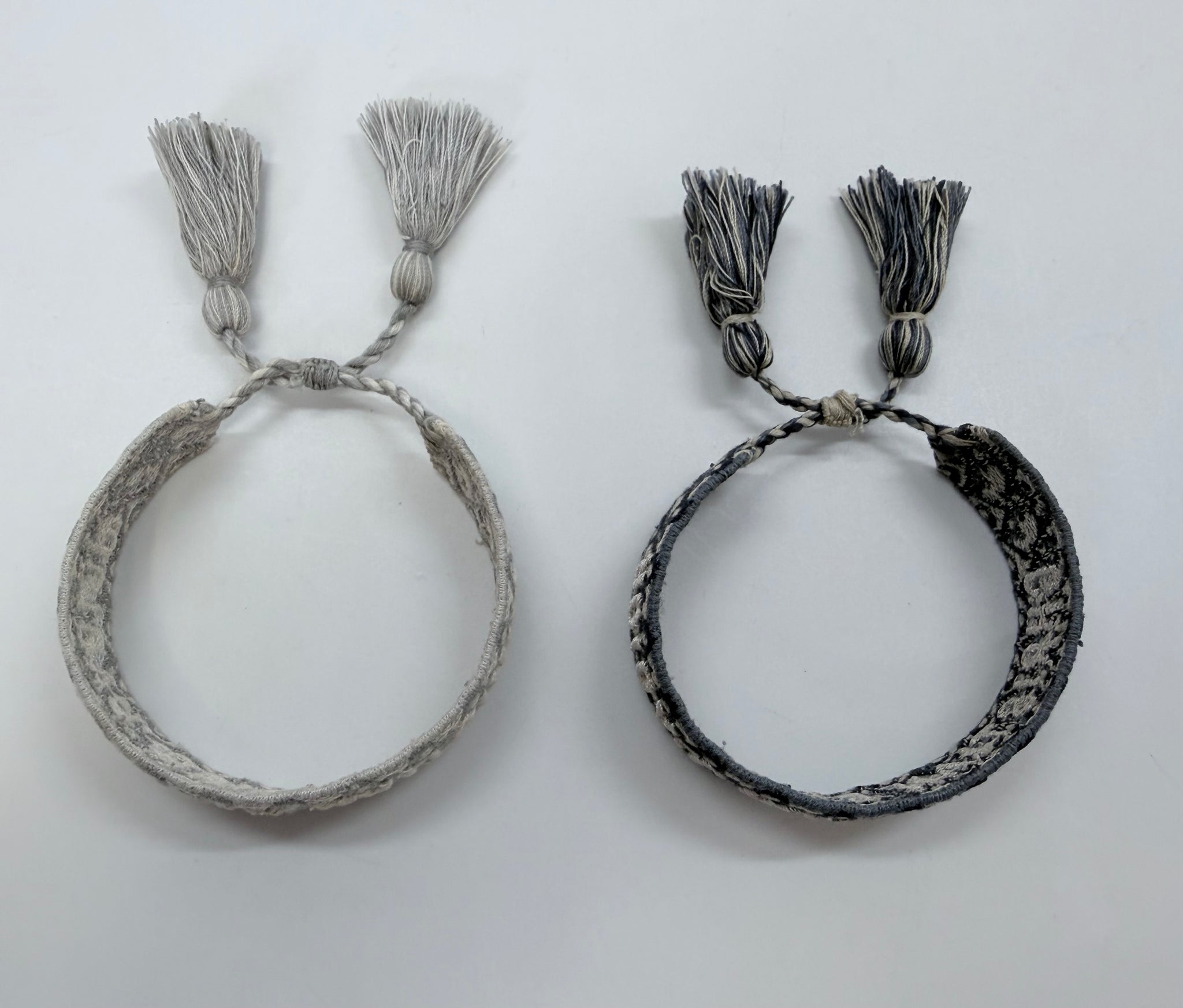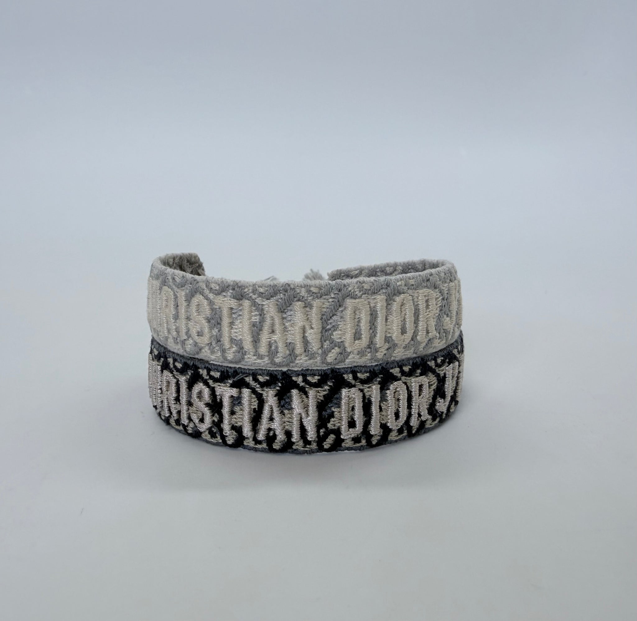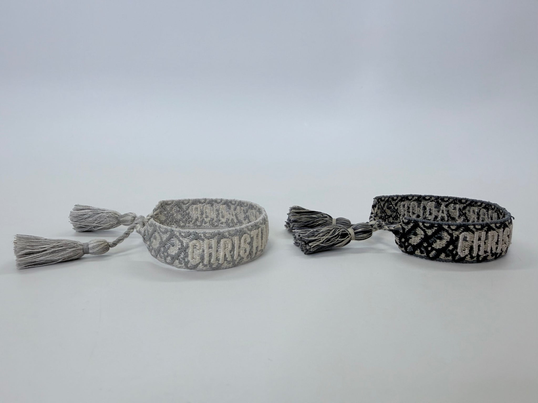 These are pre-owned Christian Dior J’Adior gray and navy blue oblique cotton bracelets set of two. They feature handmade tassel cords to adjust the size from smaller to larger.