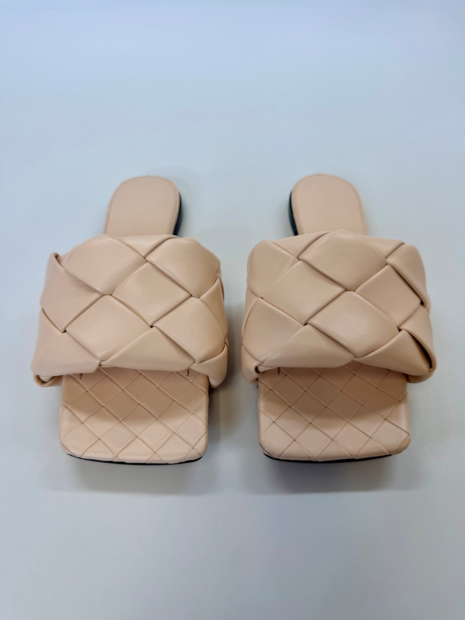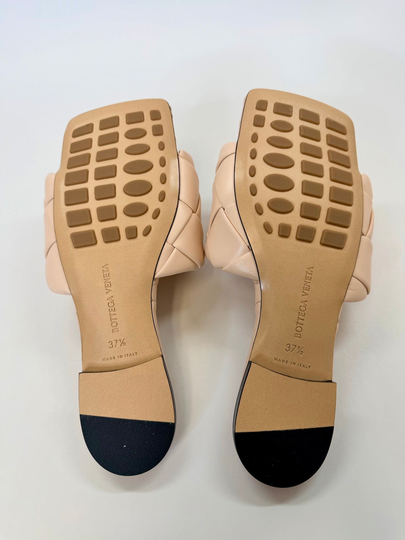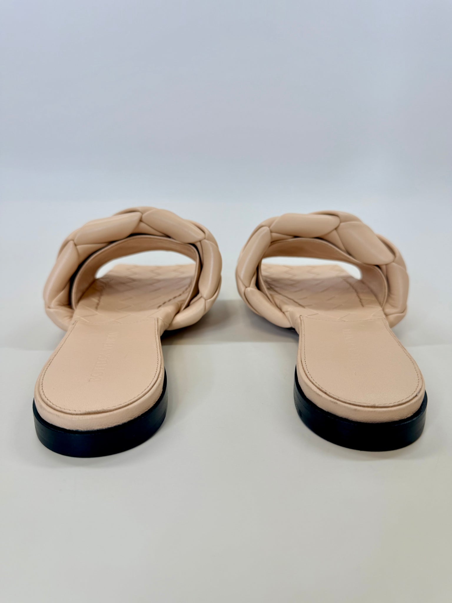 These are pre-owned Bottega Veneta blush intrecciato leather lido flat sandals.