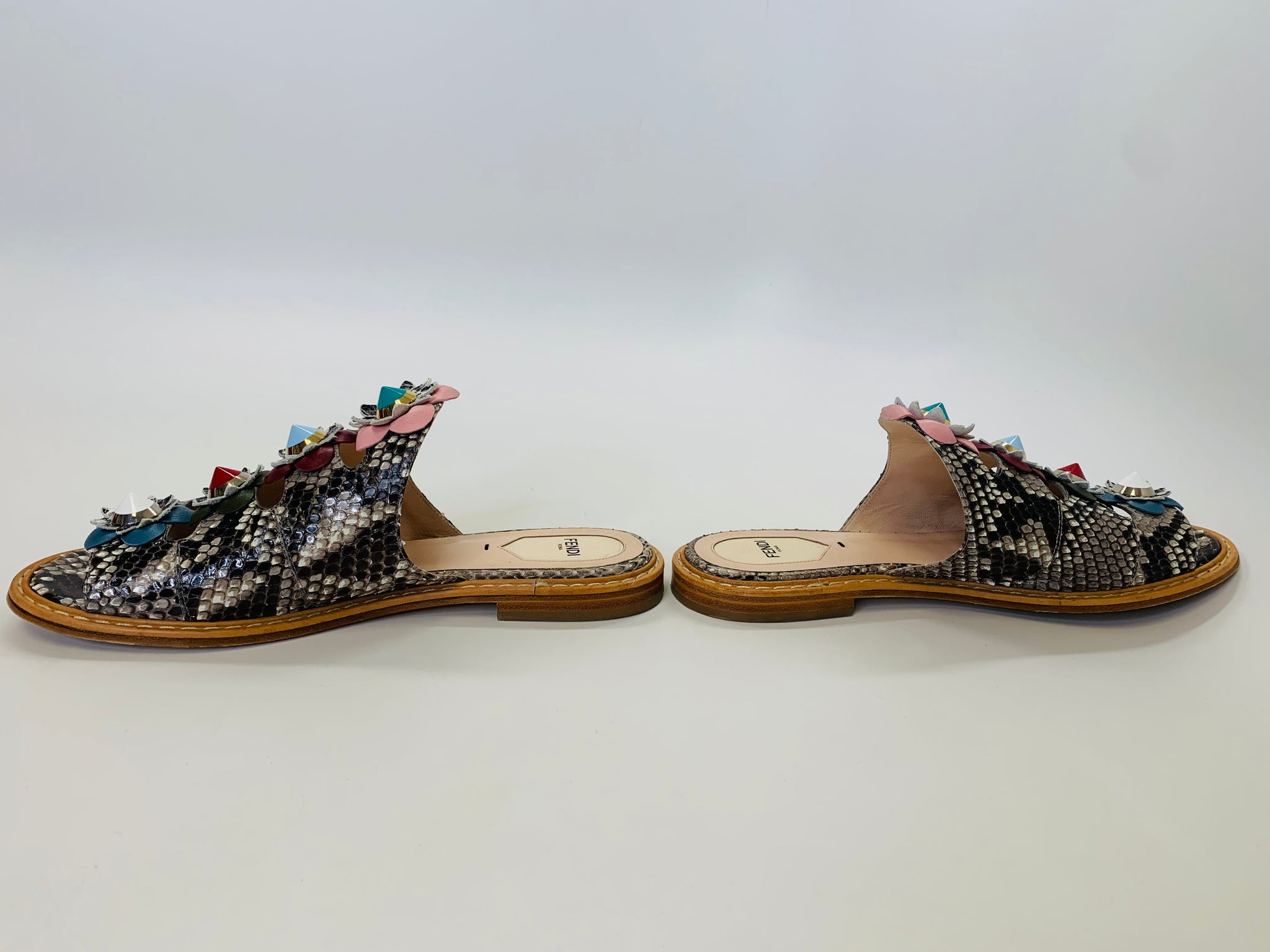 These are pre-owned Fendi python slide sandals. They feature multicolor studded leather flowers.