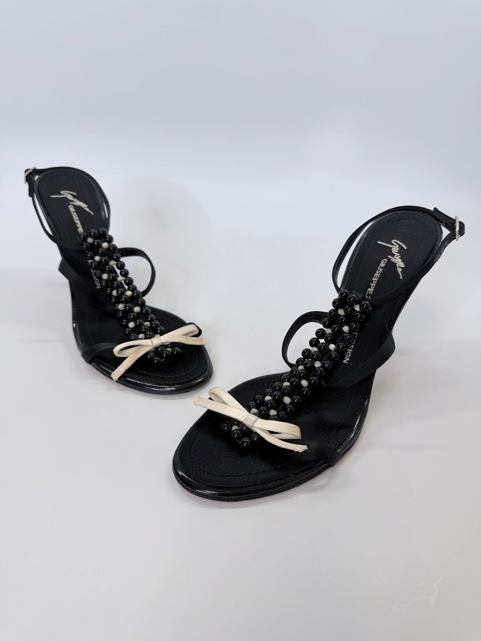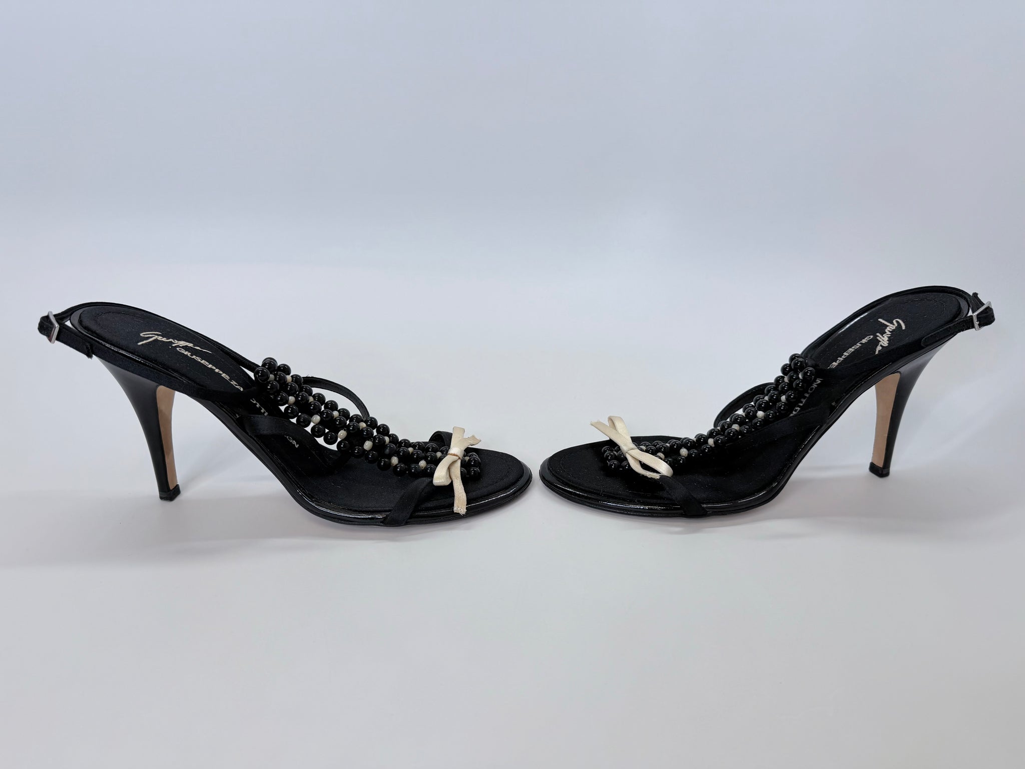 These are pre-owned Giuseppe Zanotti black satin strappy sandals. They feature black and ivory beading, ivory satin bows, silver metal hardware and adjustable ankle buckles for comfort.