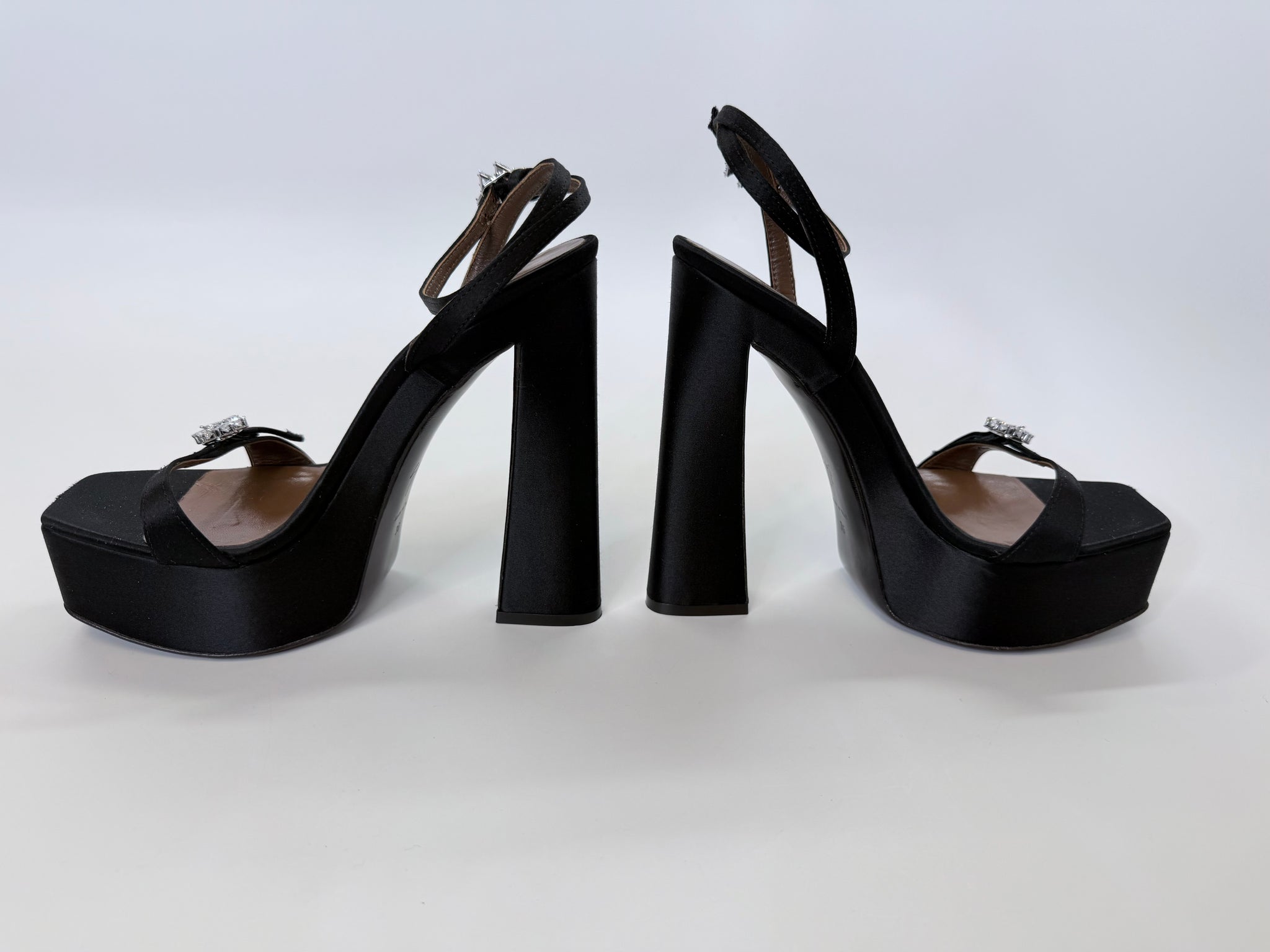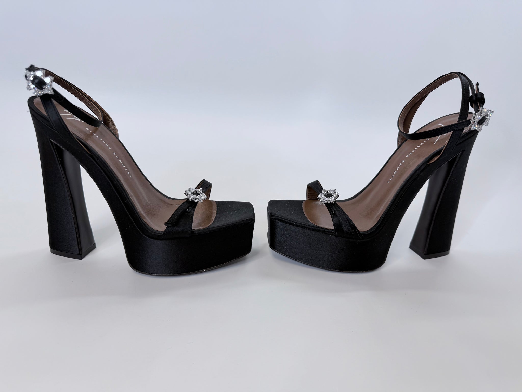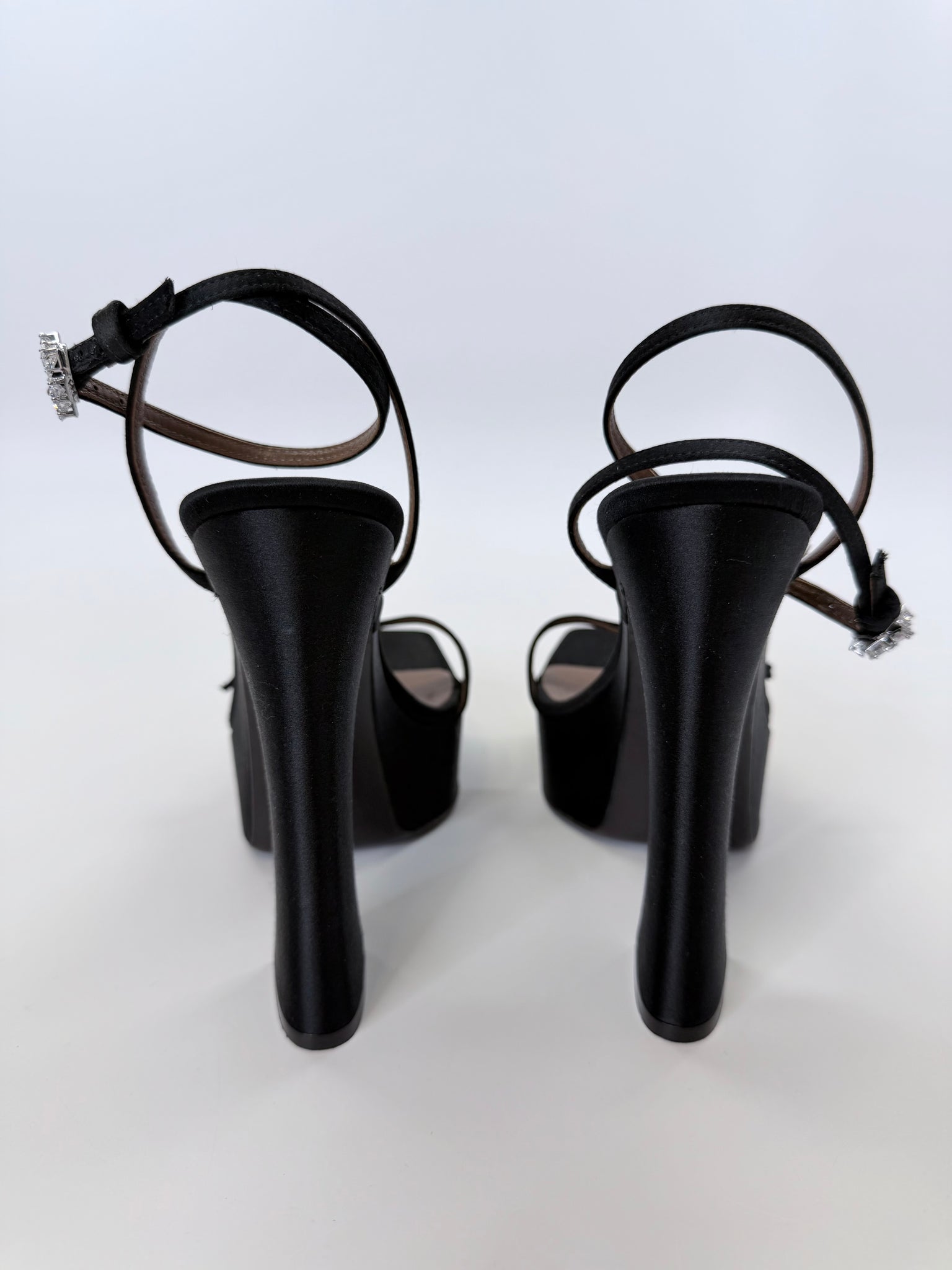 These are pre-owned Giuseppe Zanotti Himari black satin platform wedges. They feature silver metal hardware, crystals and adjustable ankle buckles for comfort.