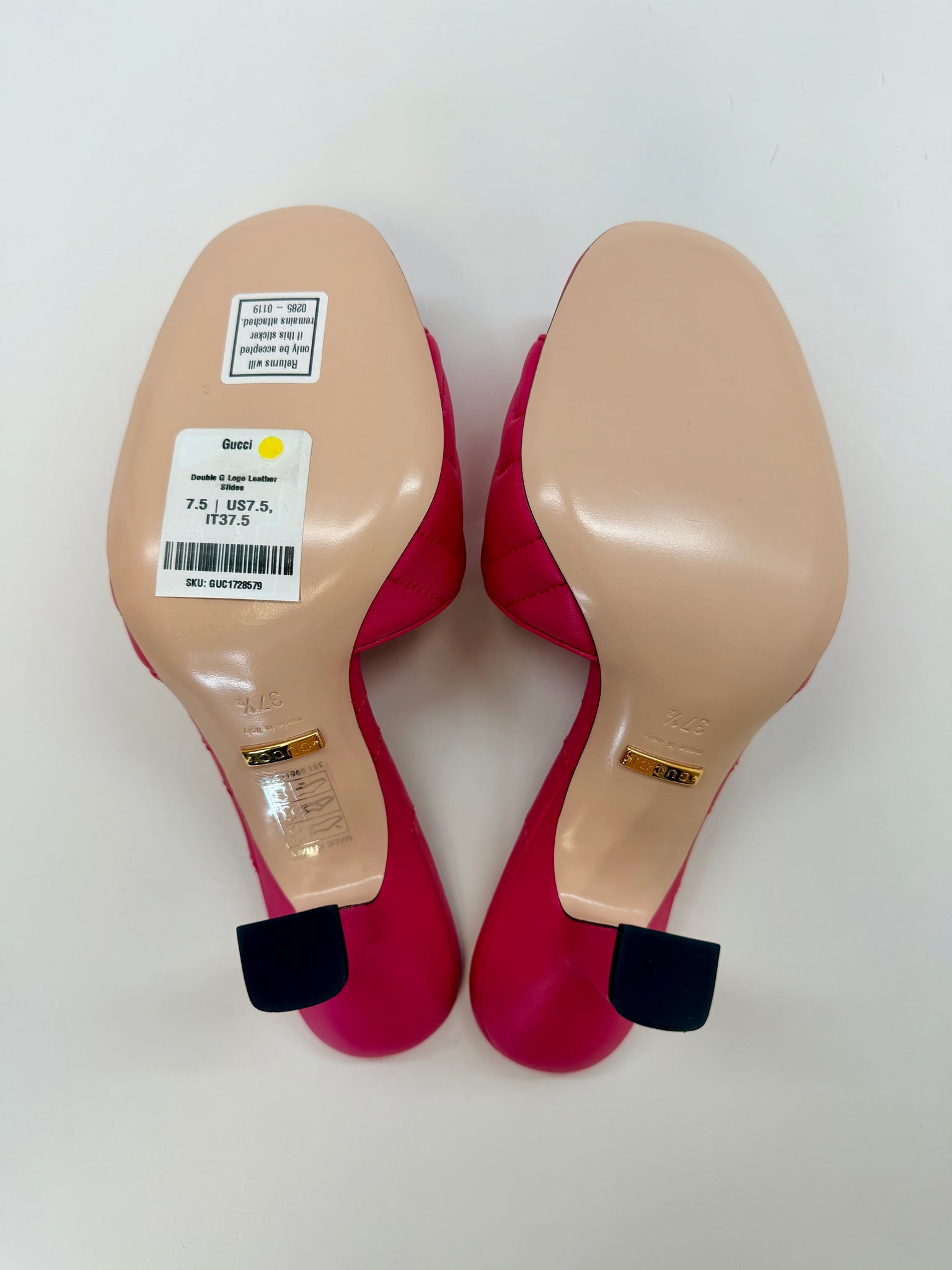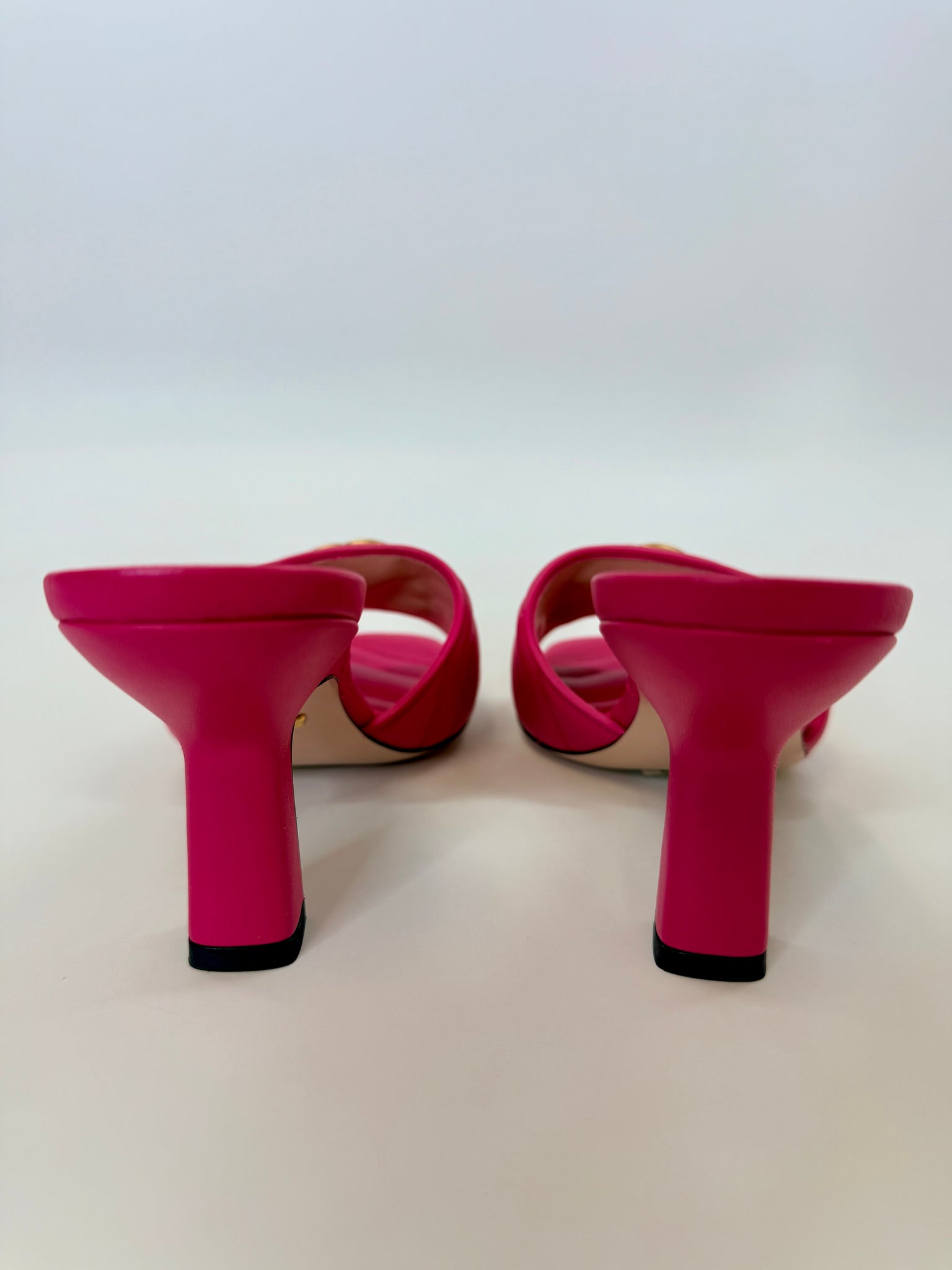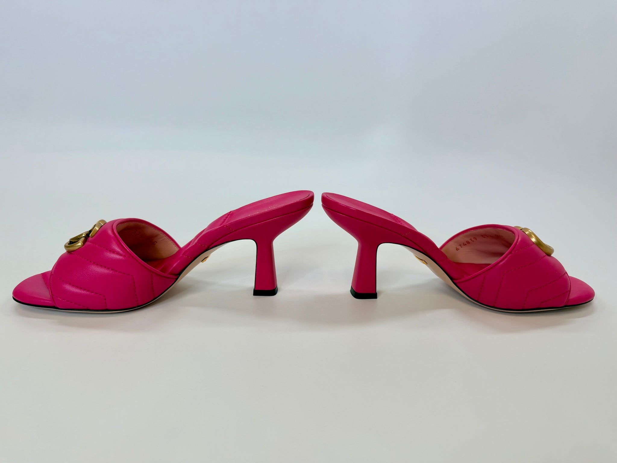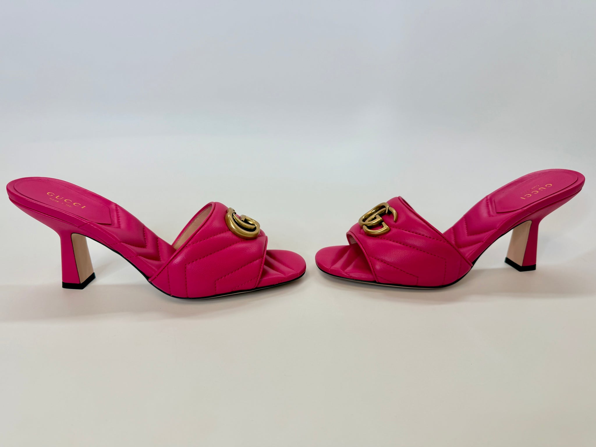 These are pre-owned Gucci pink matelasse leather Marmont slides. They feature gold metal hardware interlocking Gs.