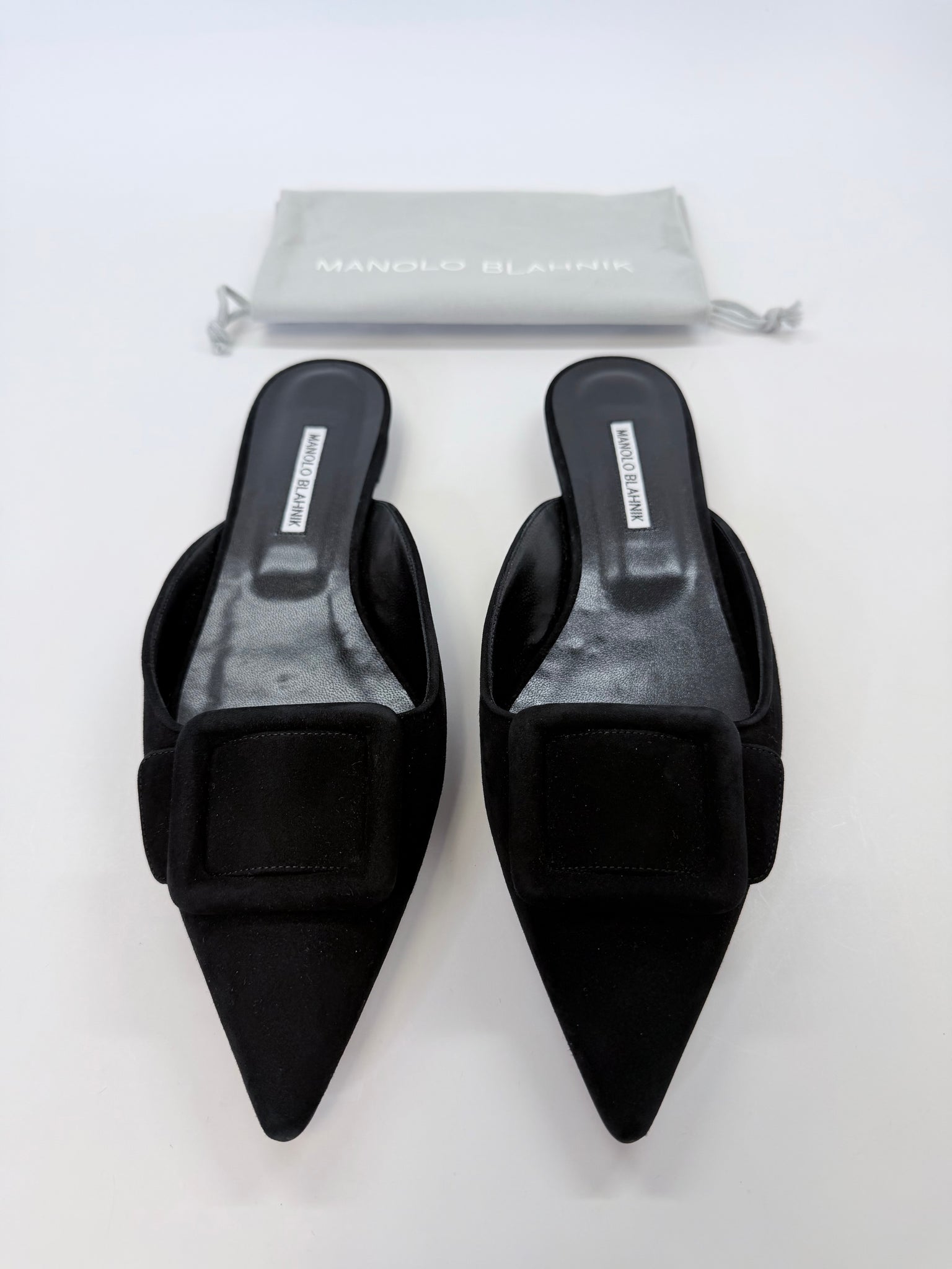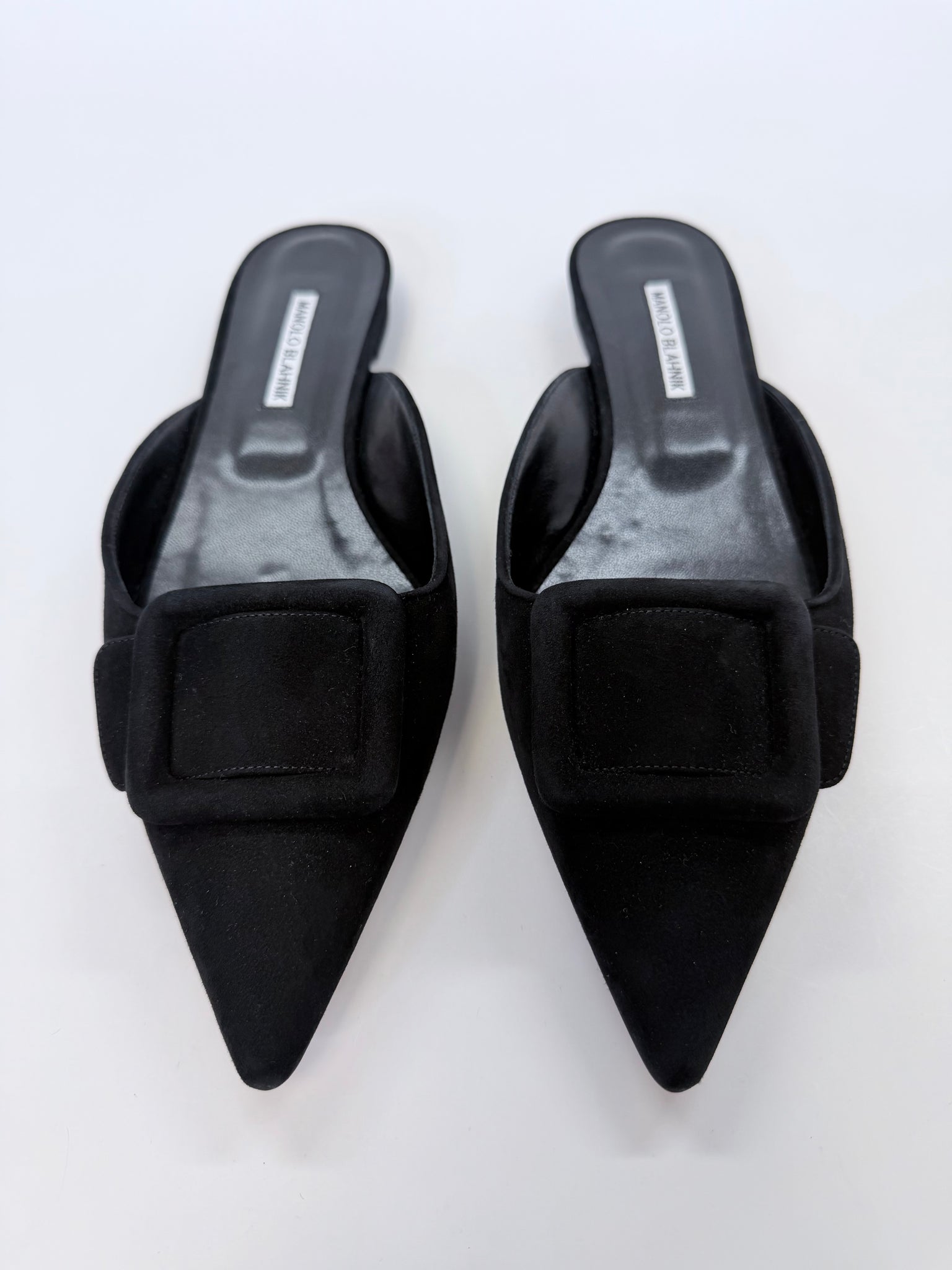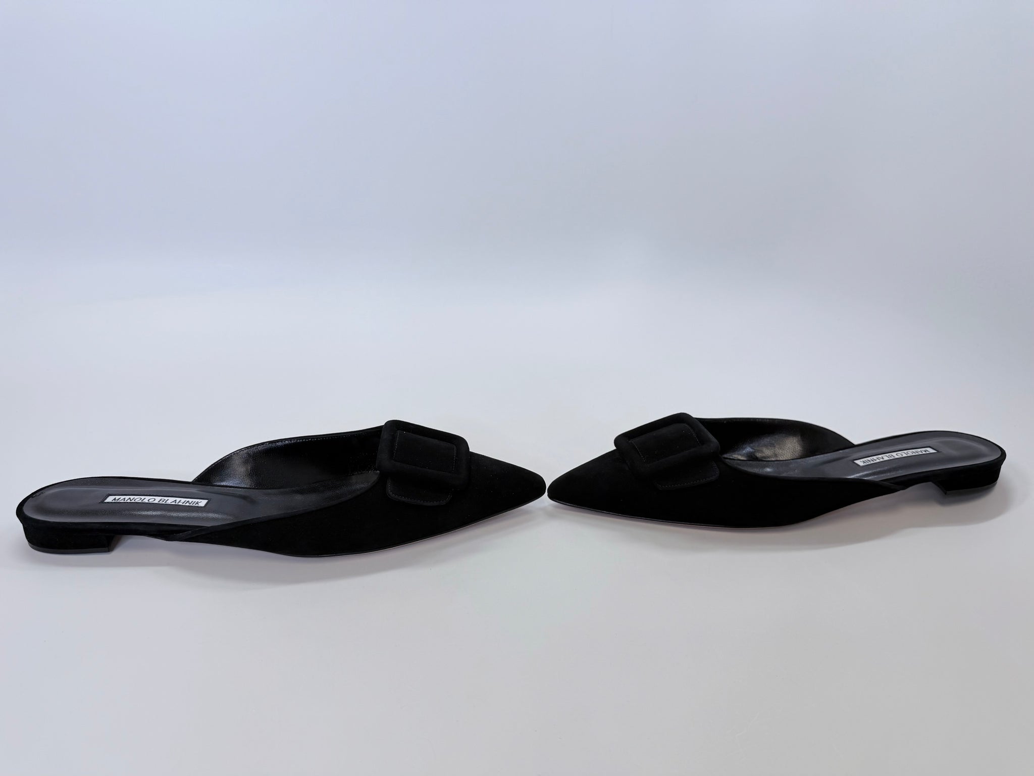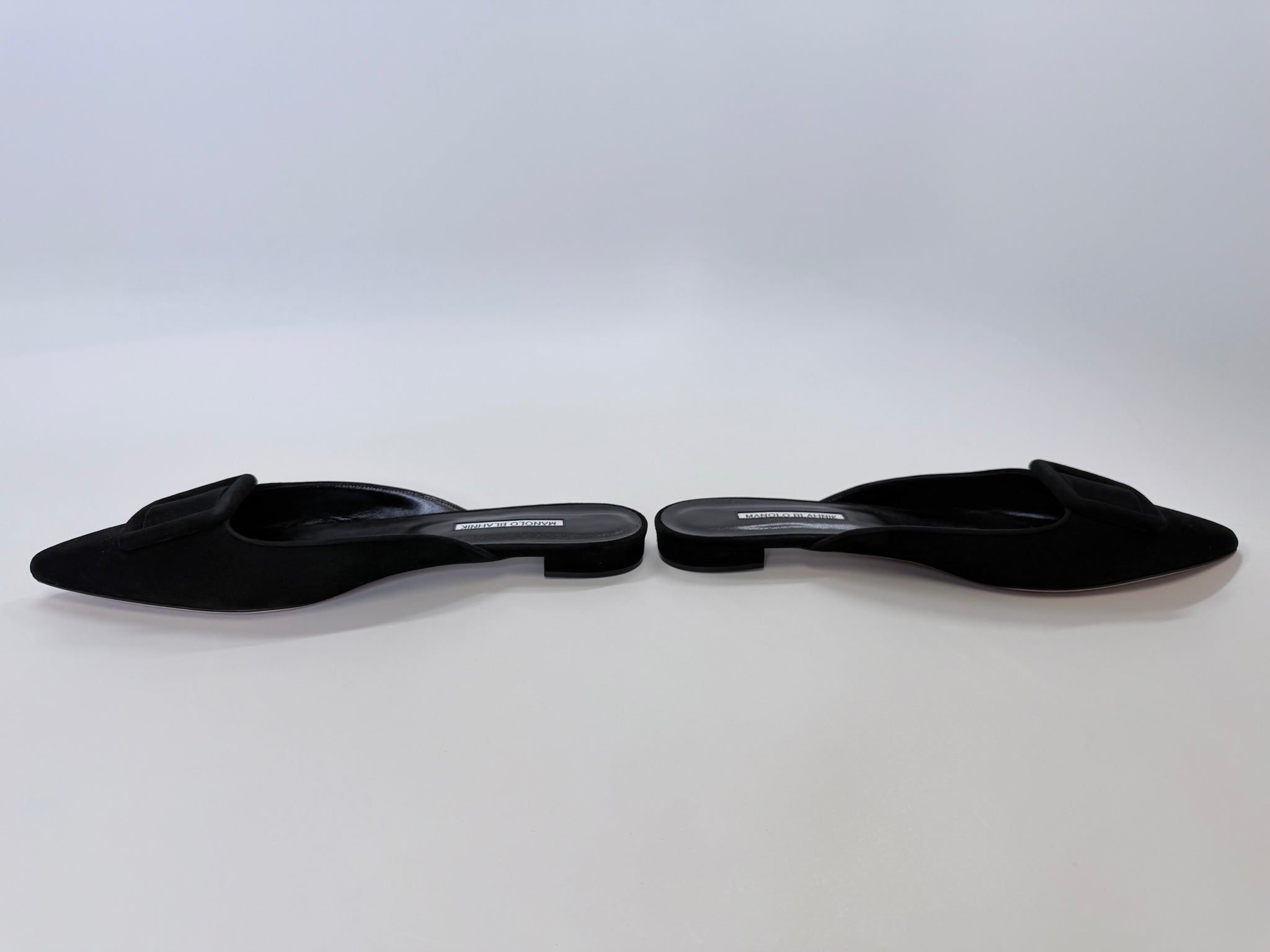 These are pre-owned Manolo Blahnik black suede Maysale flat mules.