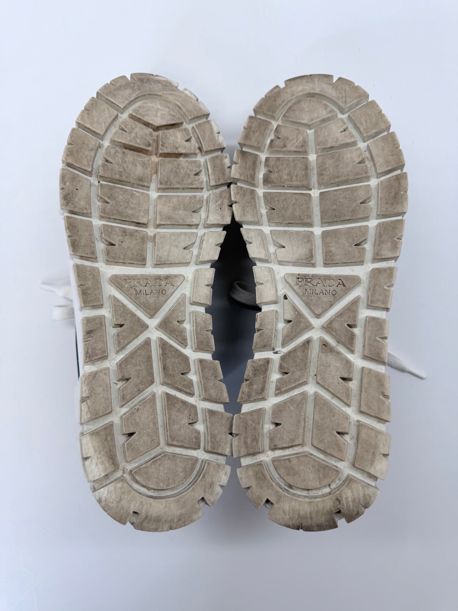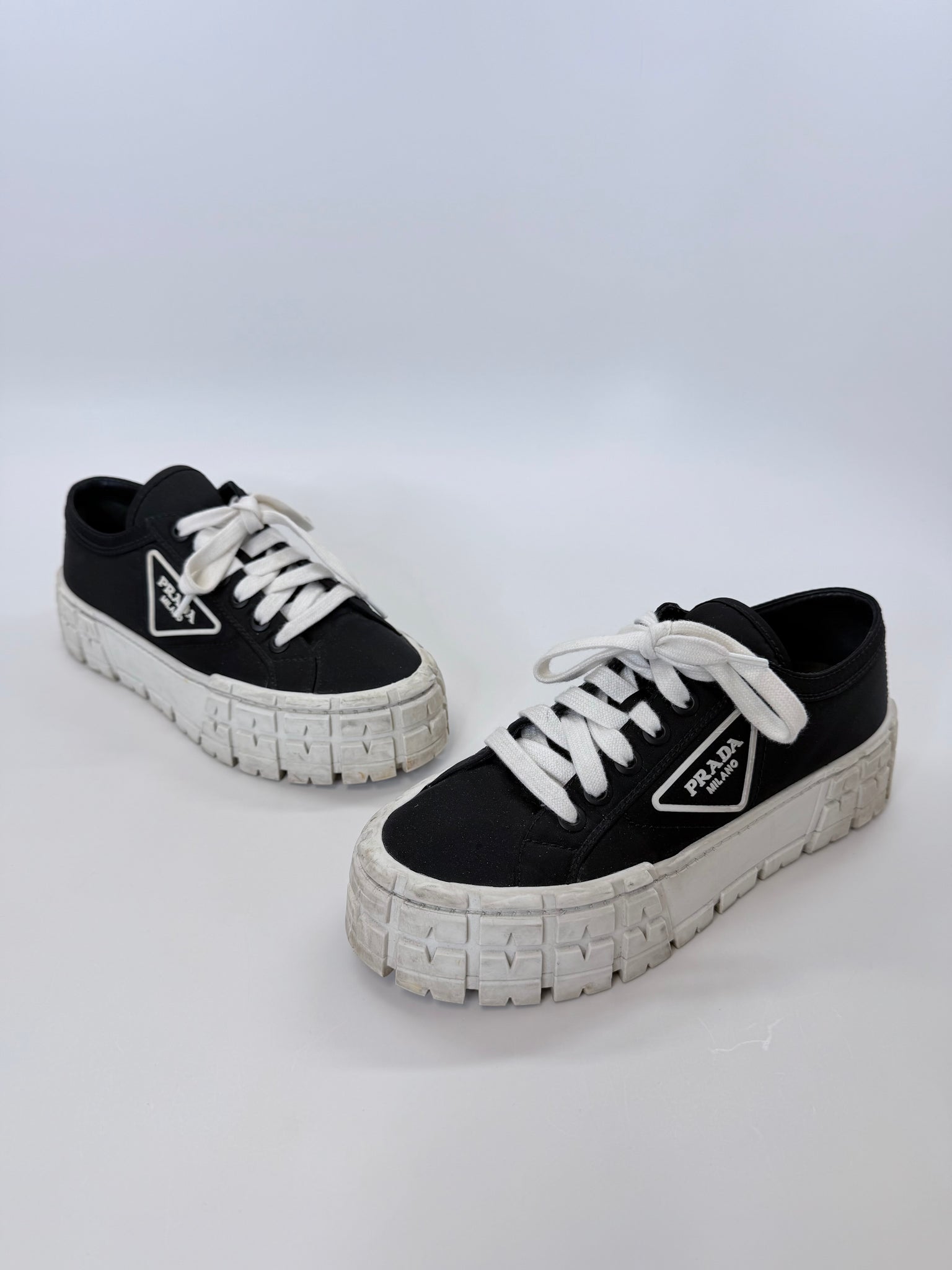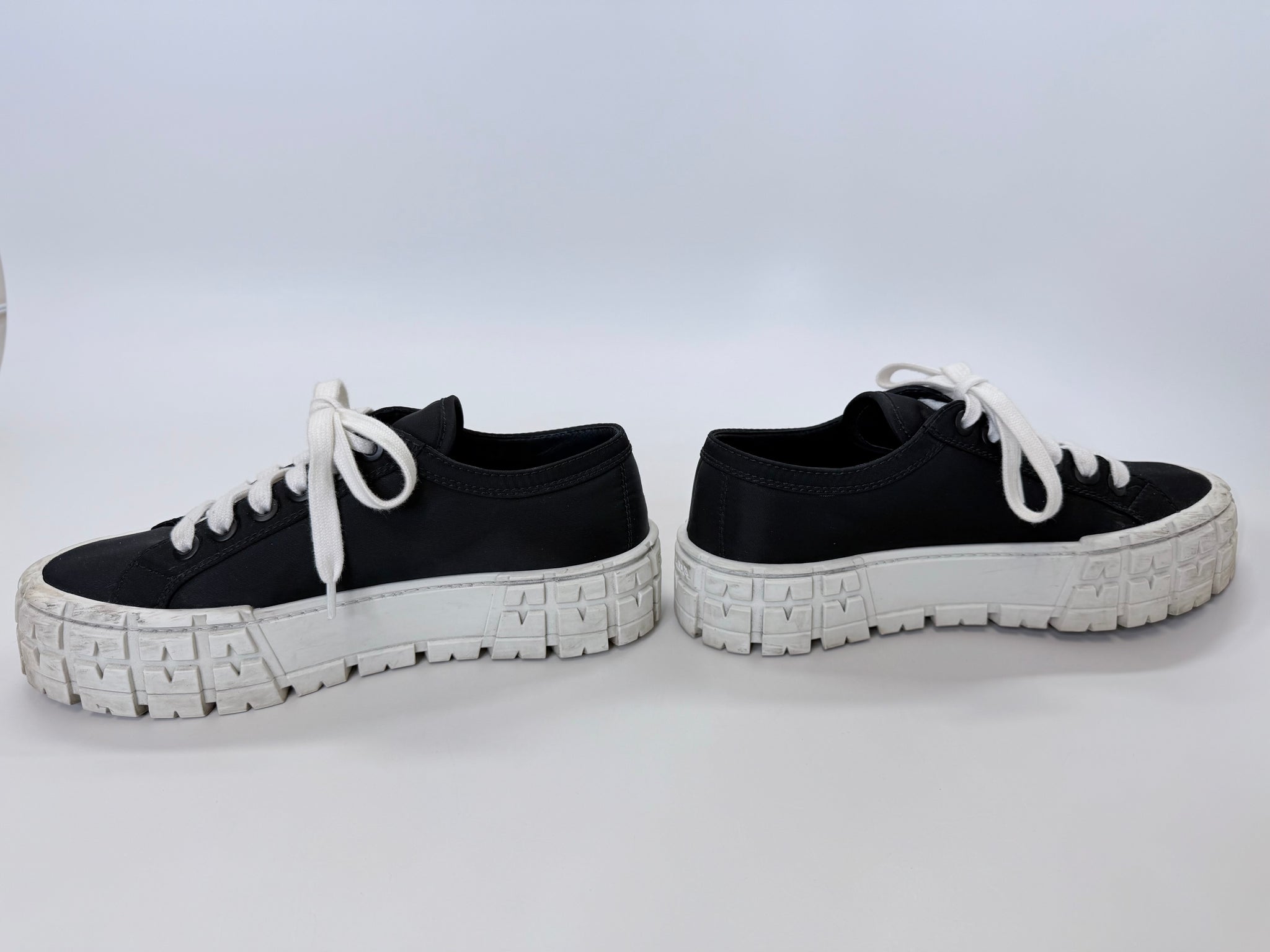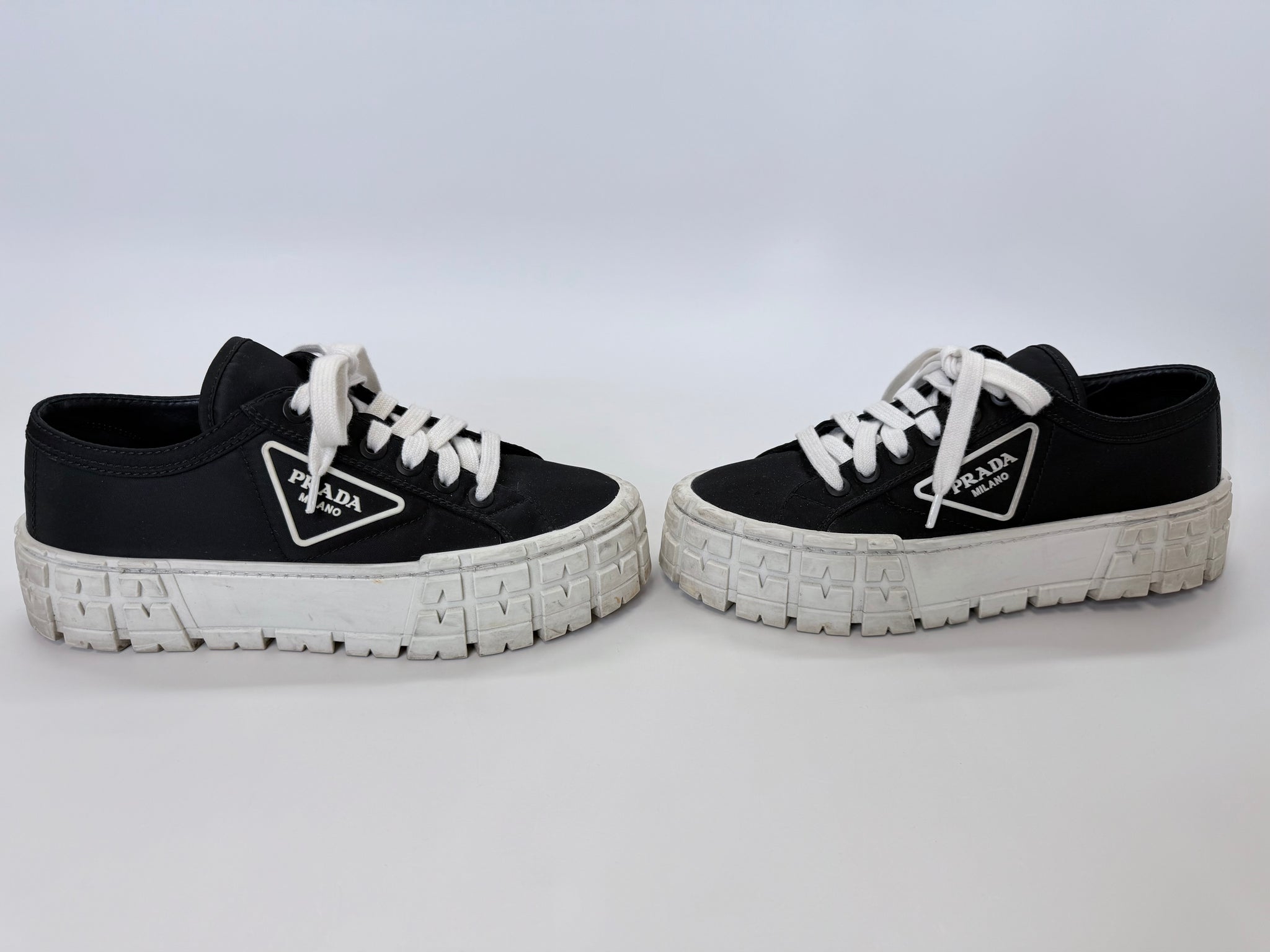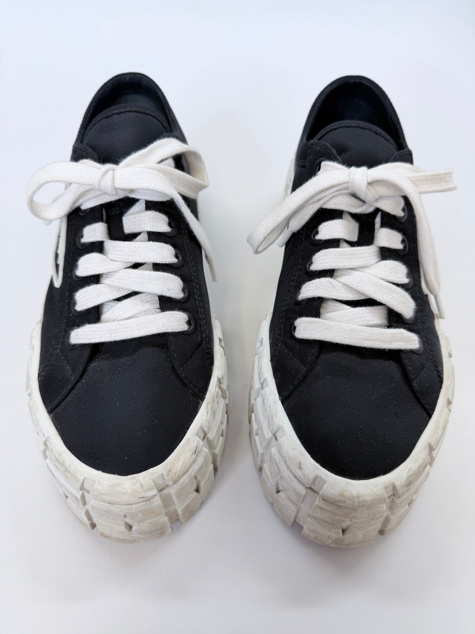 These are pre-owned Prada platform Double Wheel logo black re-nylon and white rubber lace up sneakers.