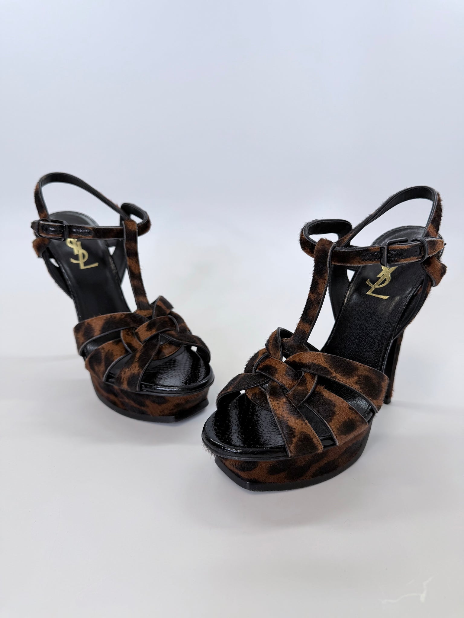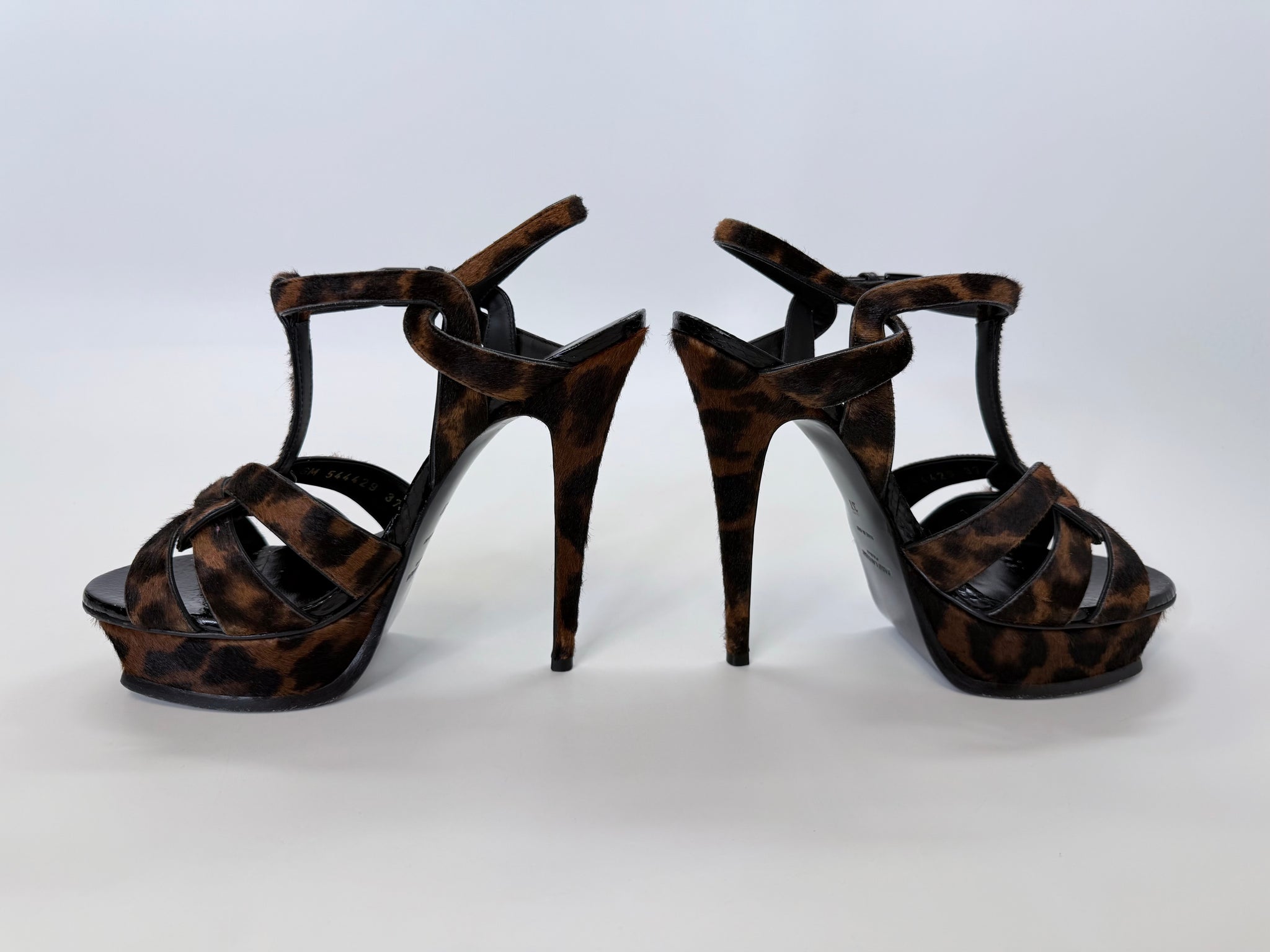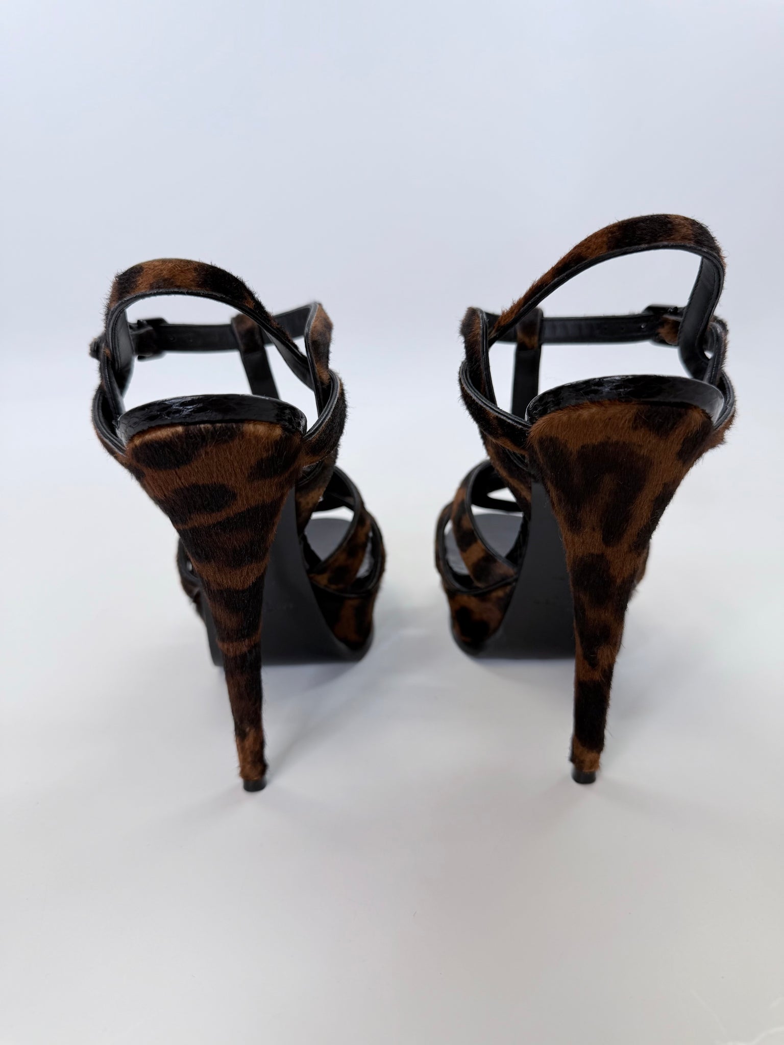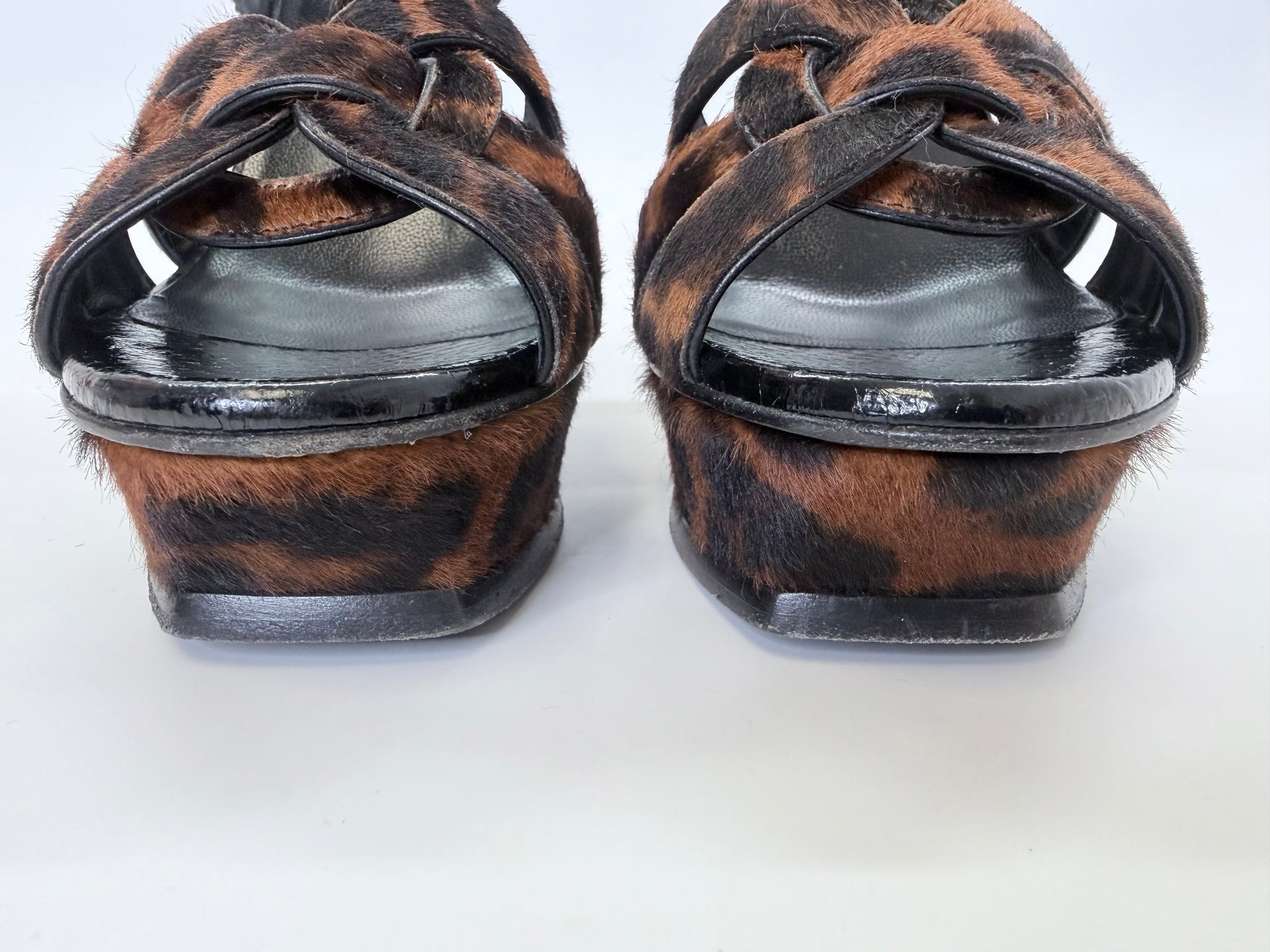 These are pre-owned Saint Laurent Tribute 105 black and brown safari print pony hair platform sandals. They feature adjustable buckle ankle straps for comfort.
