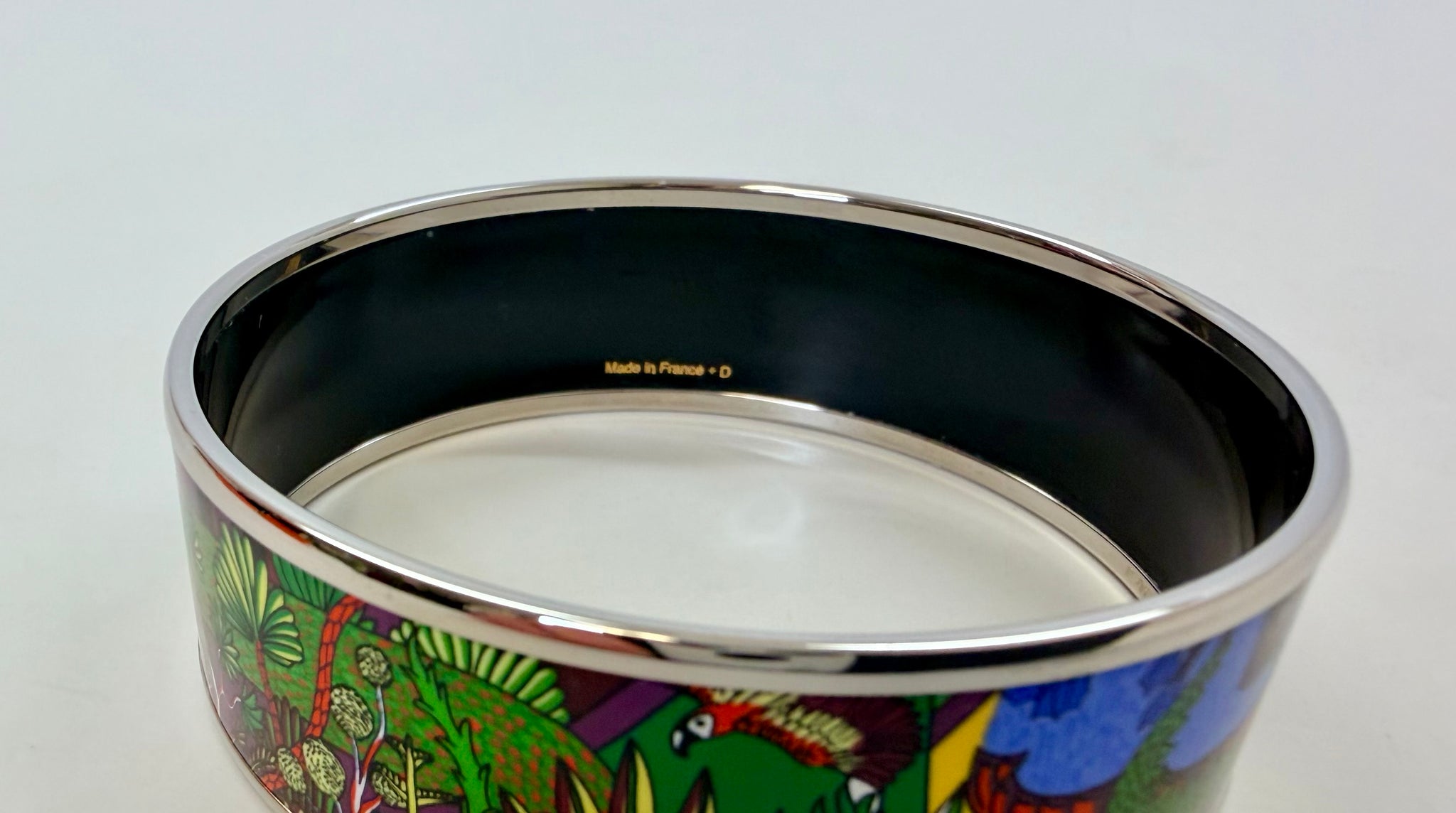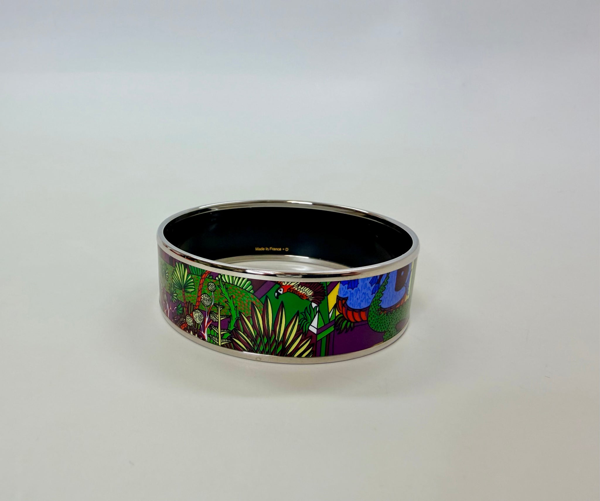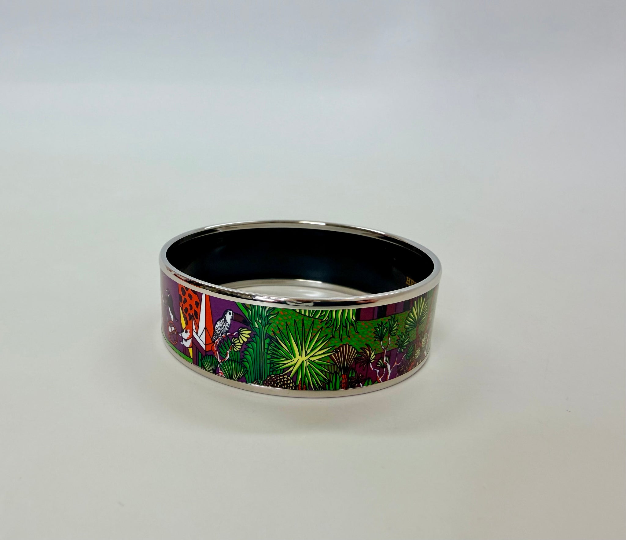 This is a pre-owned Hermès Animapolis Au Paradis wide bangle bracelet in palladium plated metal and enamel.