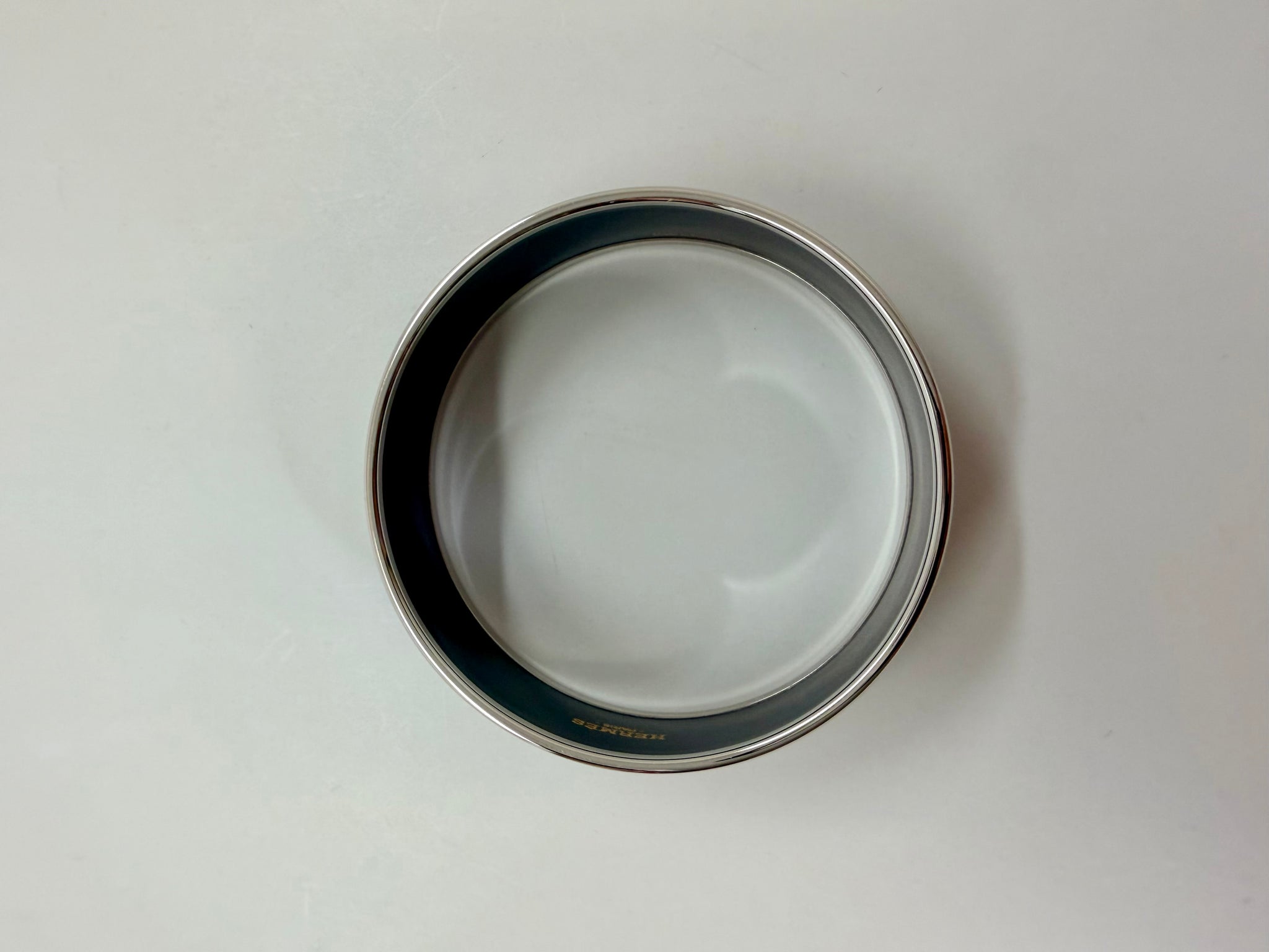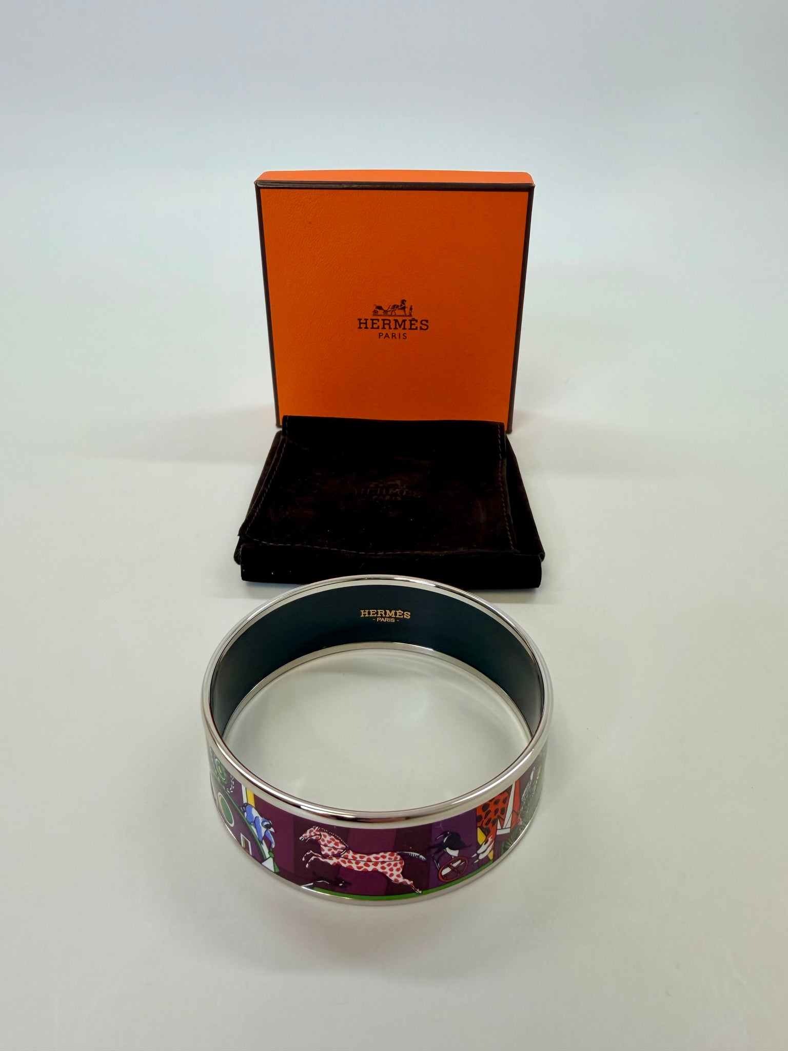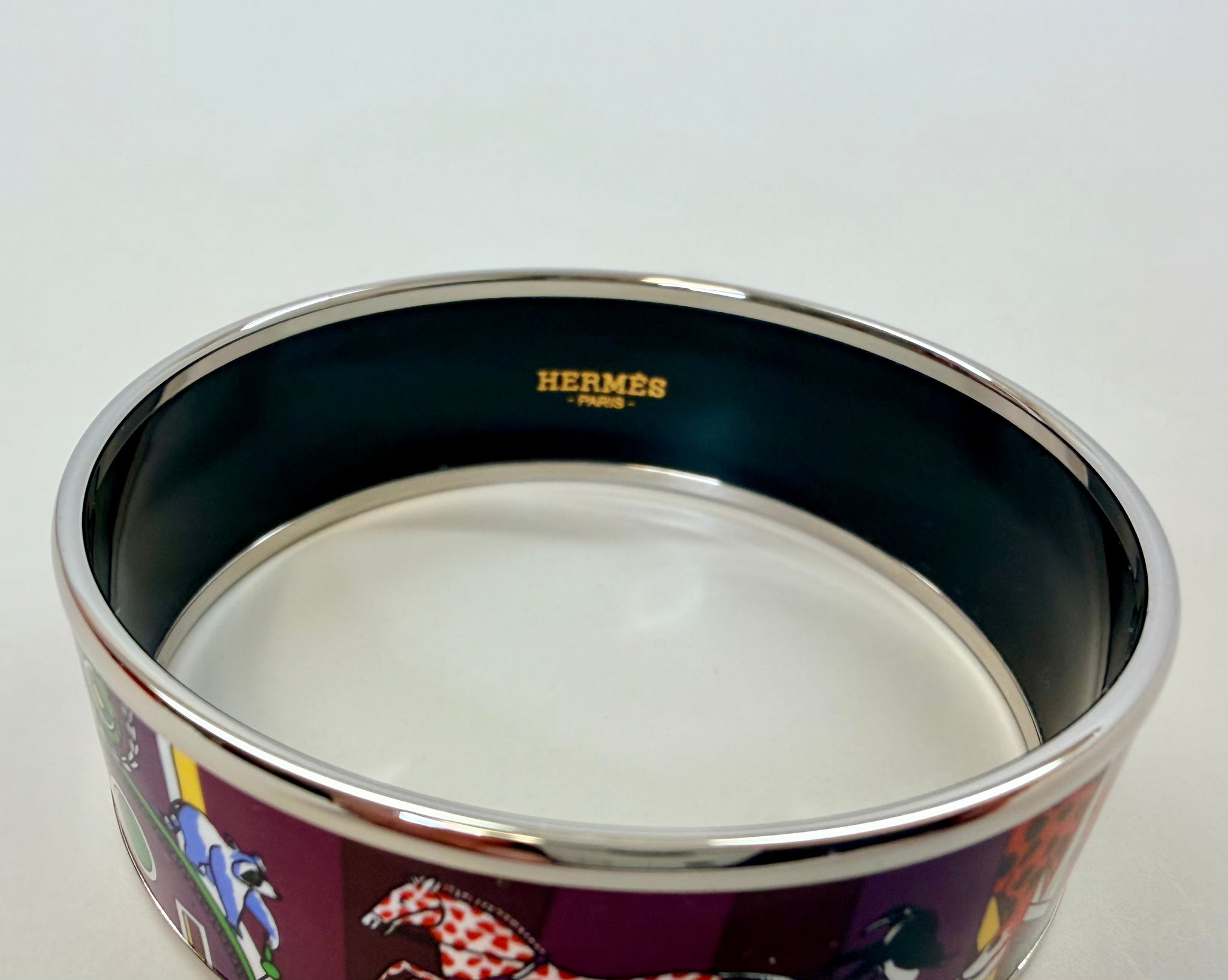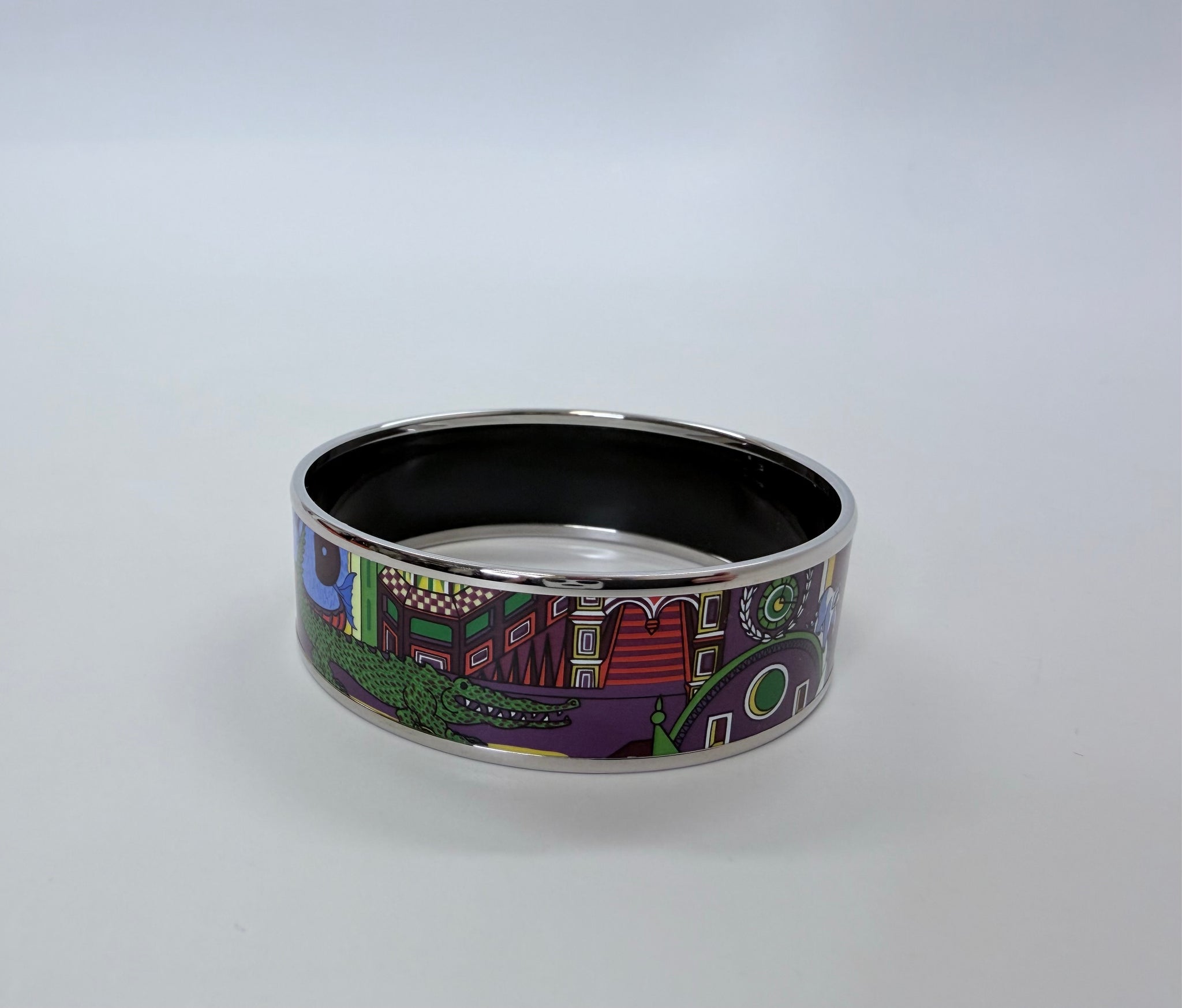This is a pre-owned Hermès Animapolis Au Paradis wide bangle bracelet in palladium plated metal and enamel.