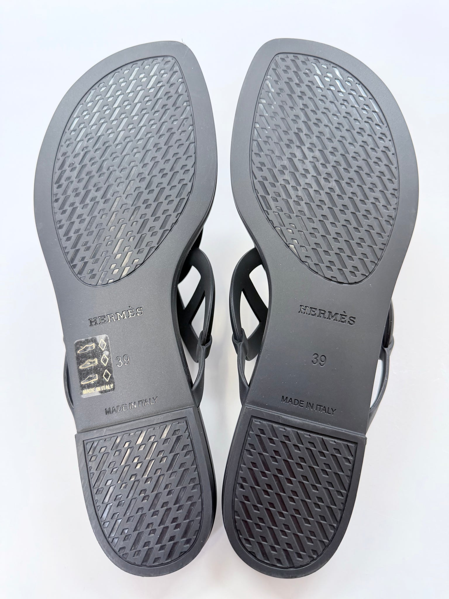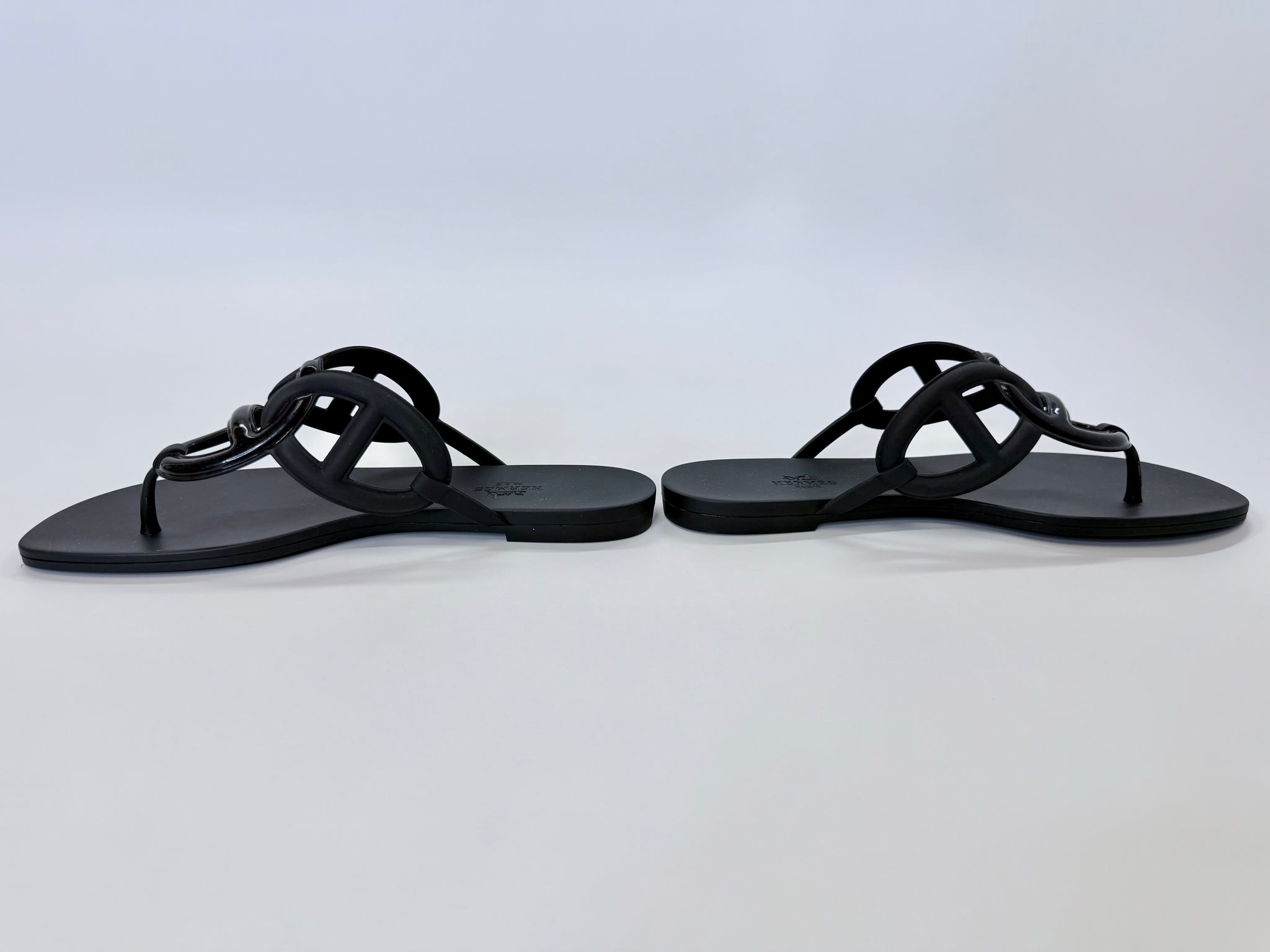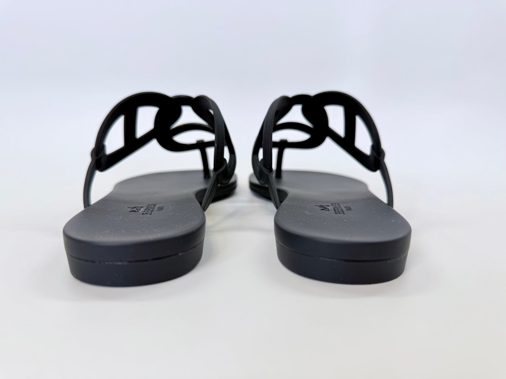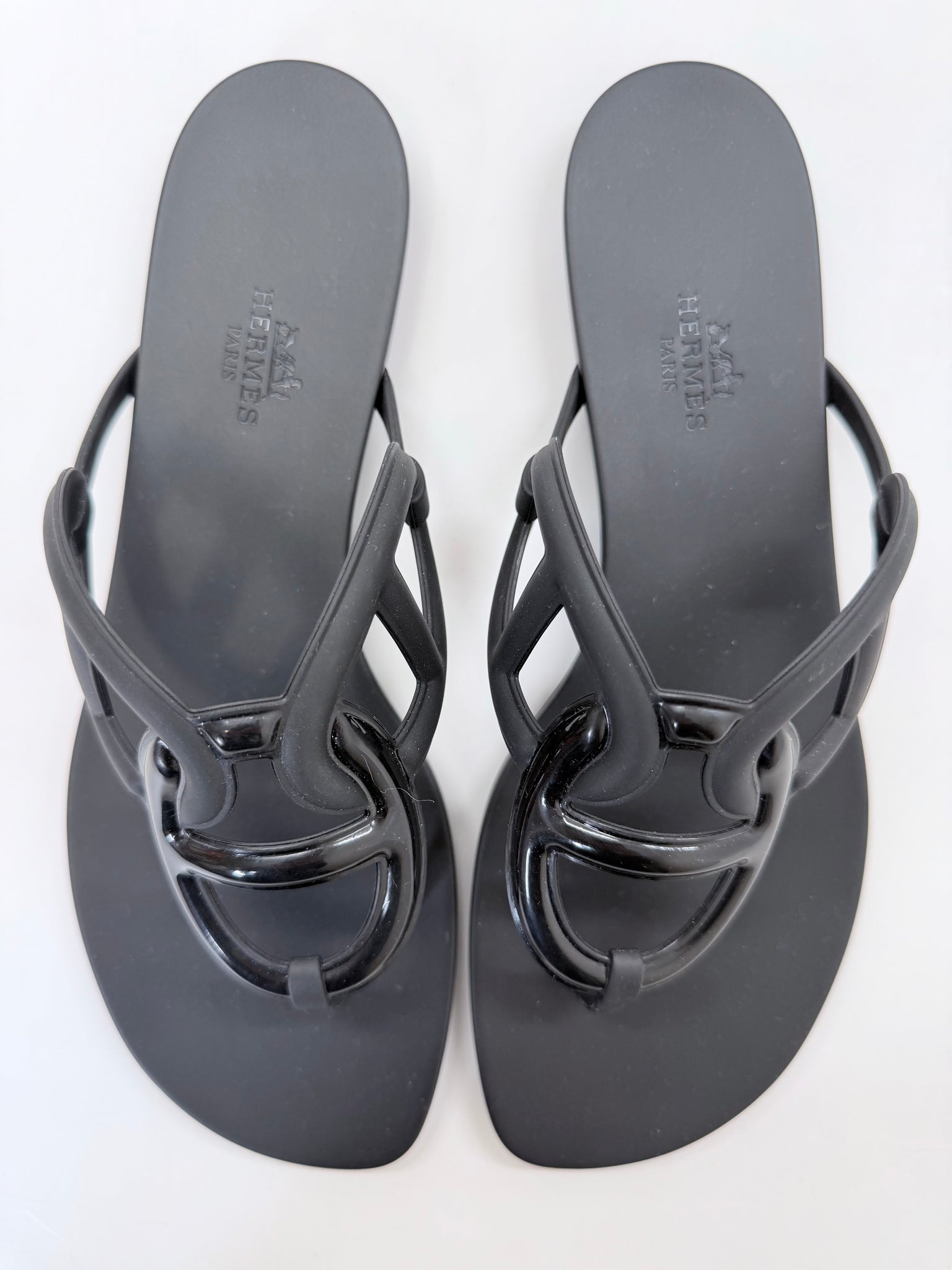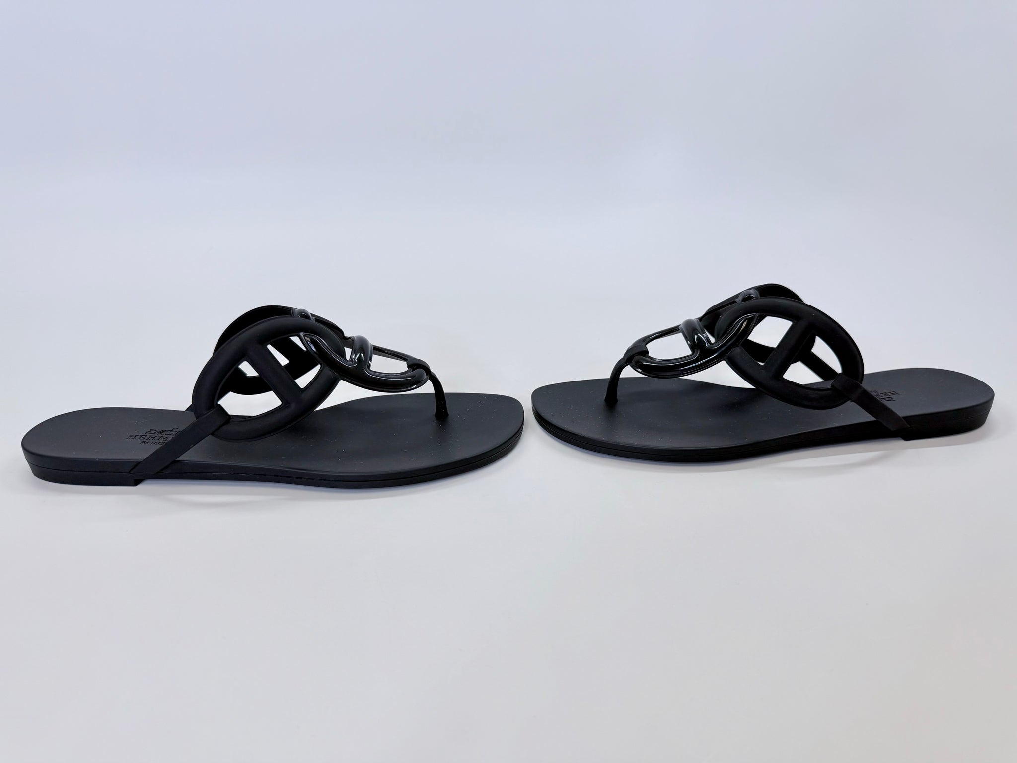These are pre-owned Hermès noir waterproof TPU rubber Egerie Chaine d’ Ancre thong sandals.
