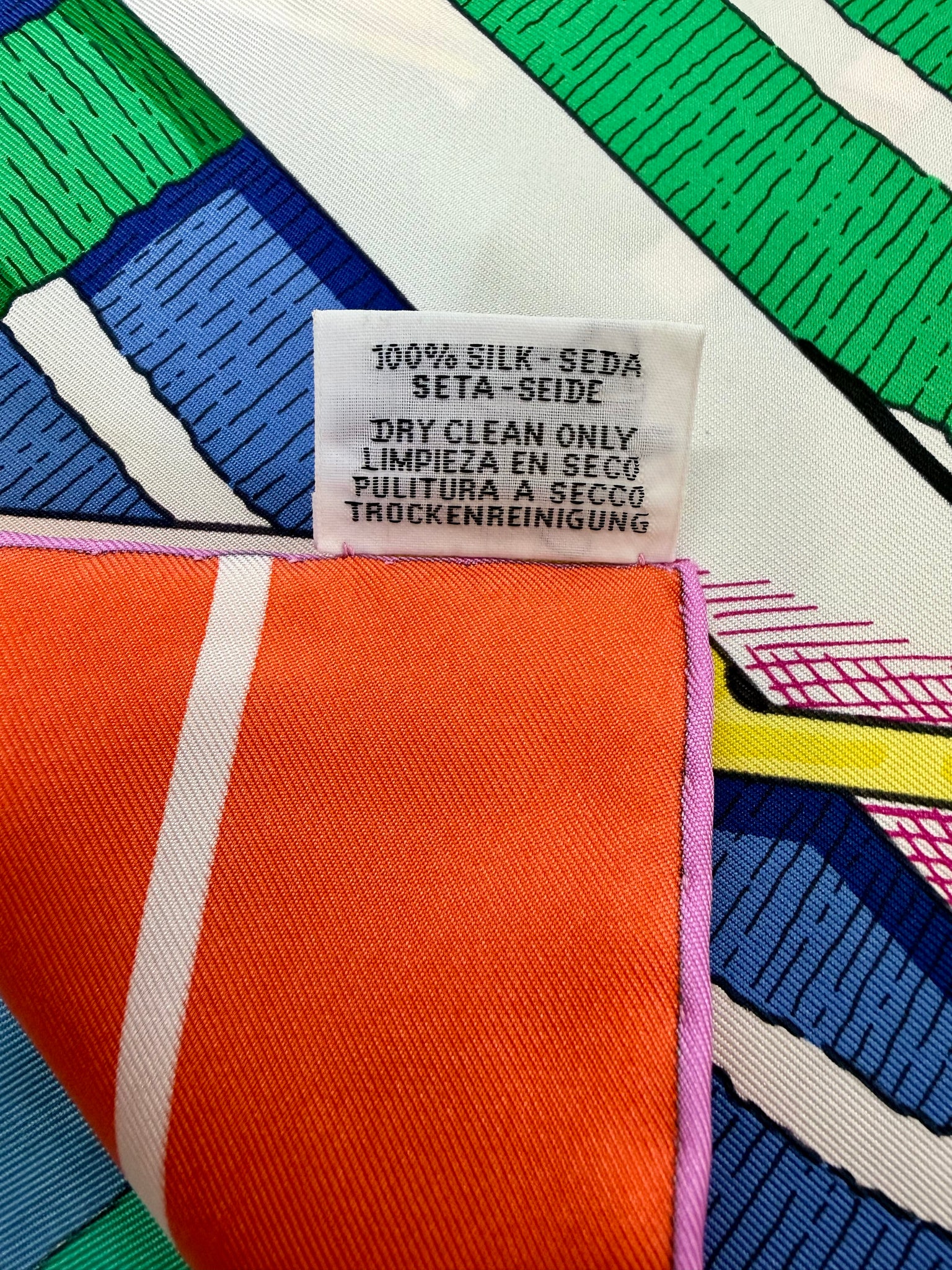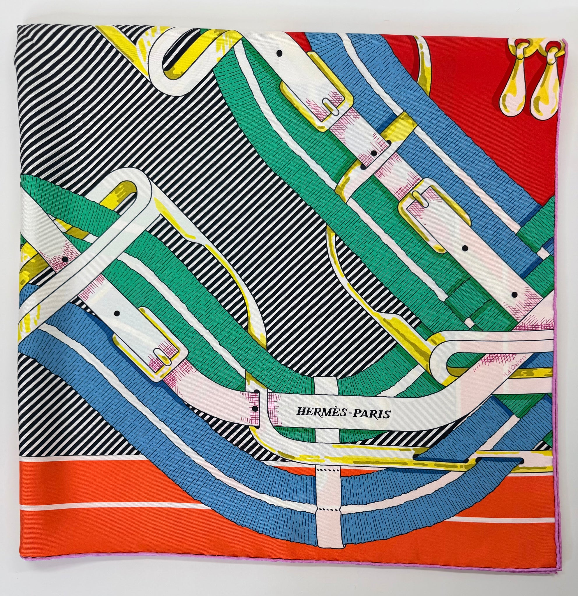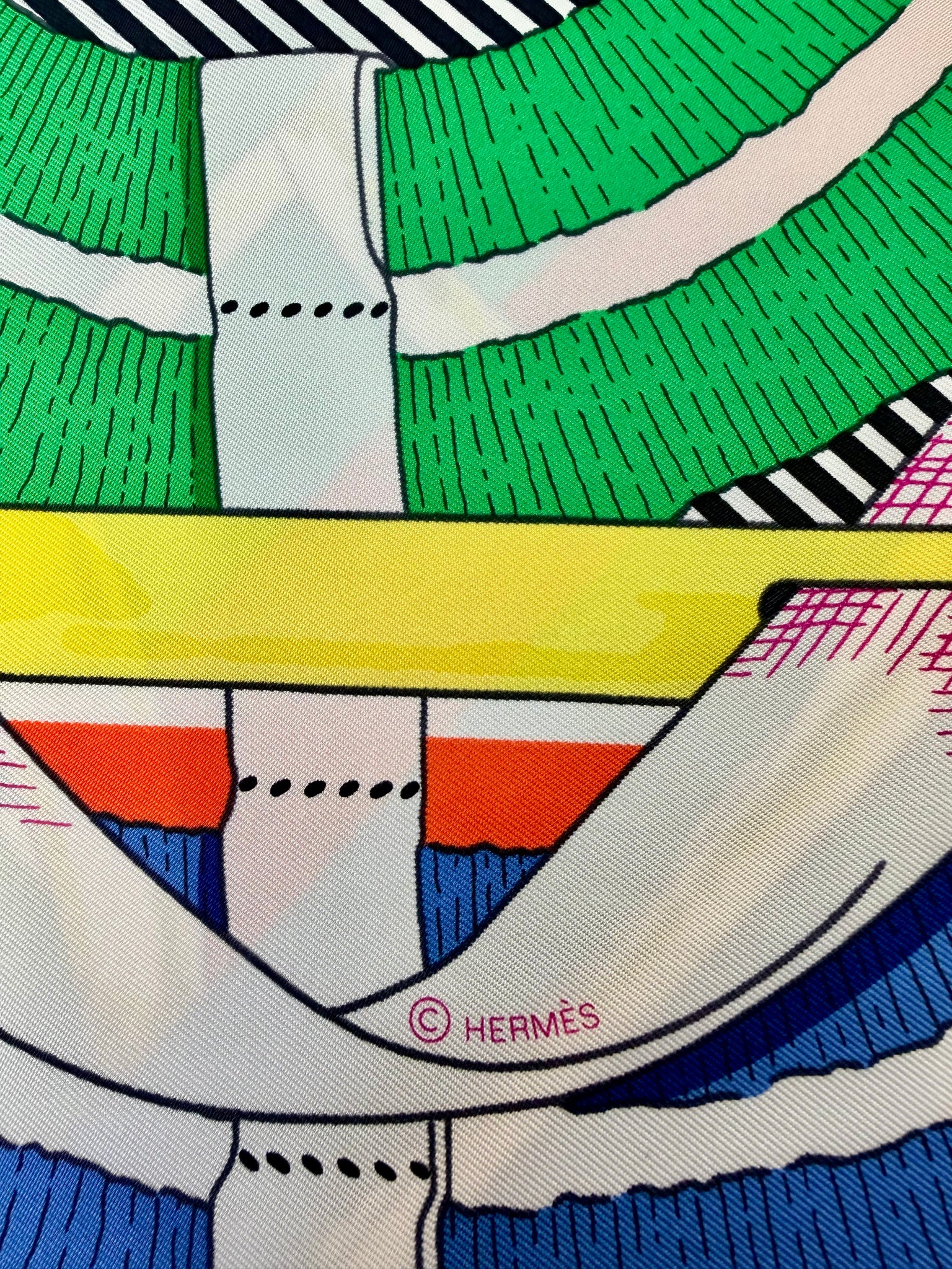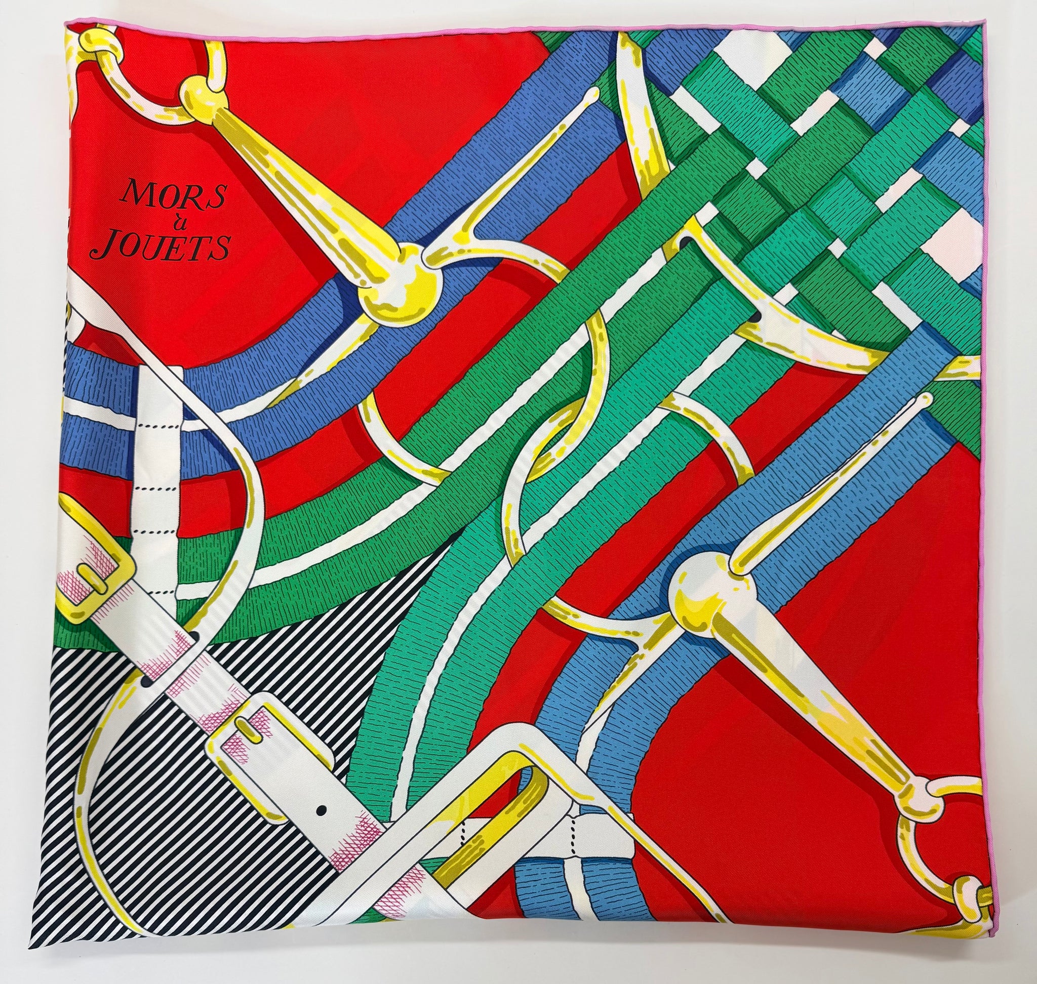 This is a pre-owned Hermès Mors a Jouets blue, orange, white, red, yellow and black silk square scarf.