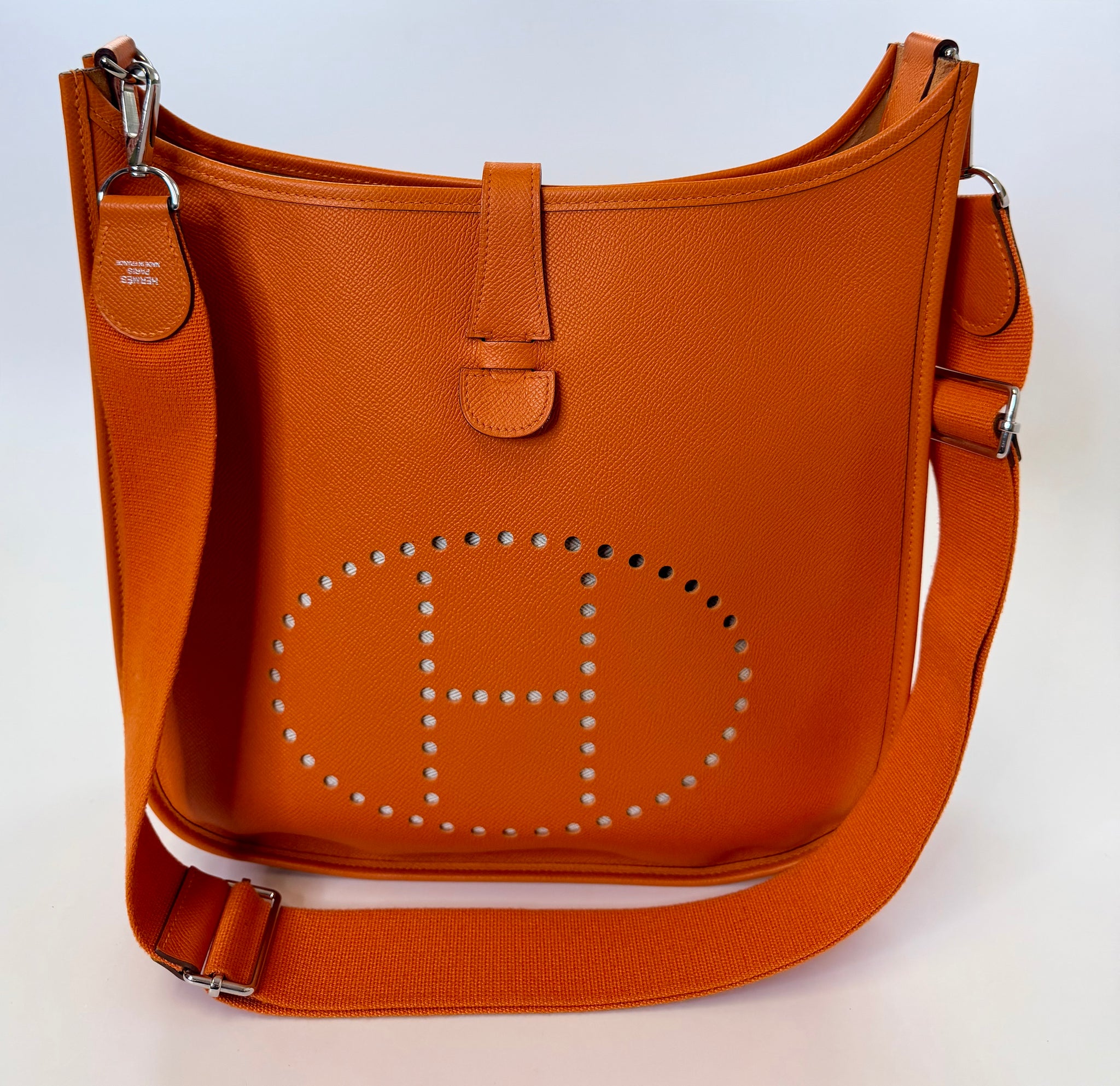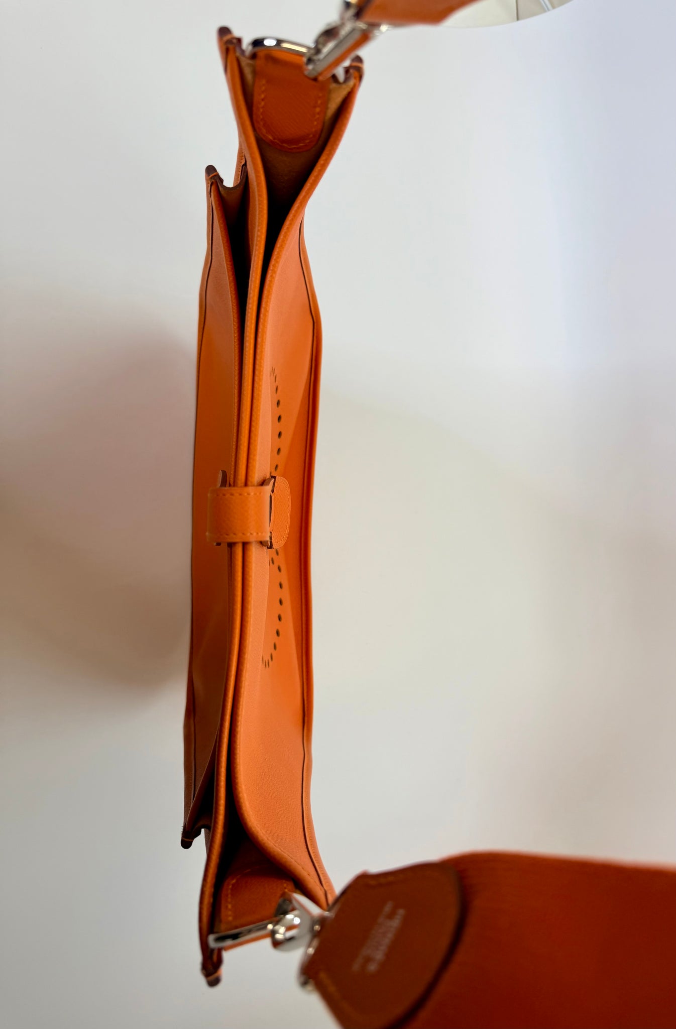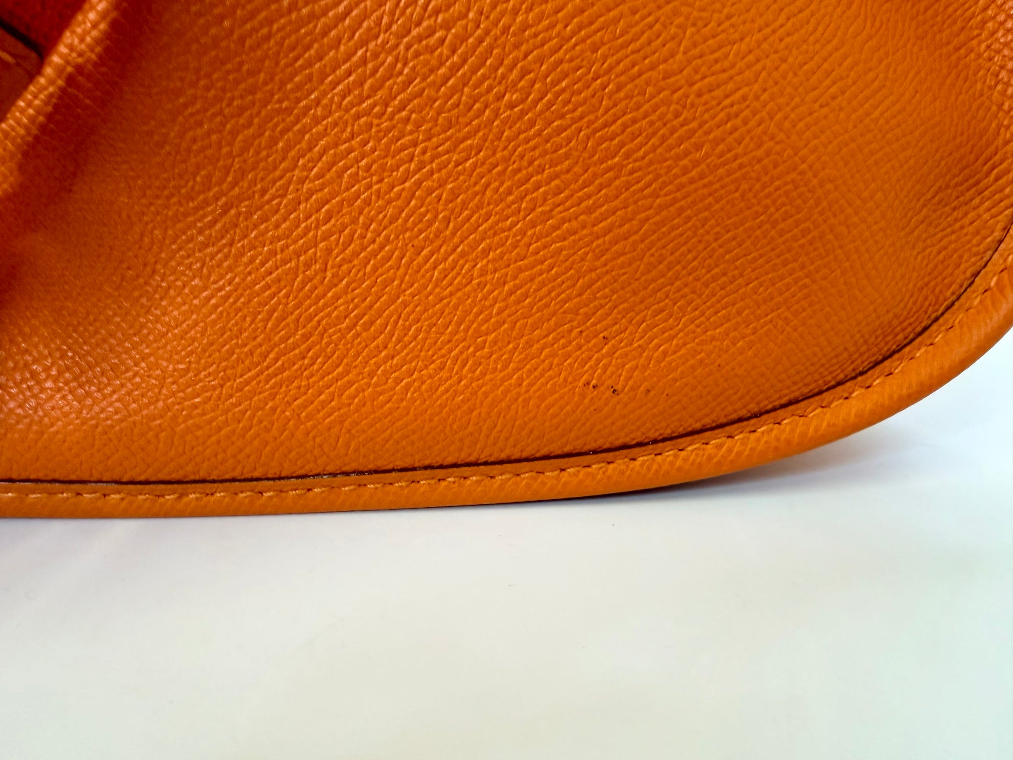 This is a pre-owned Hermès Evelyne III GM bag in orange epsom leather with palladium metal hardware. She features an adjustable length detachable strap and a snap closure exterior pocket.