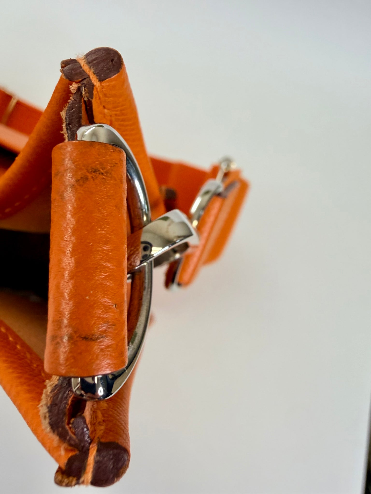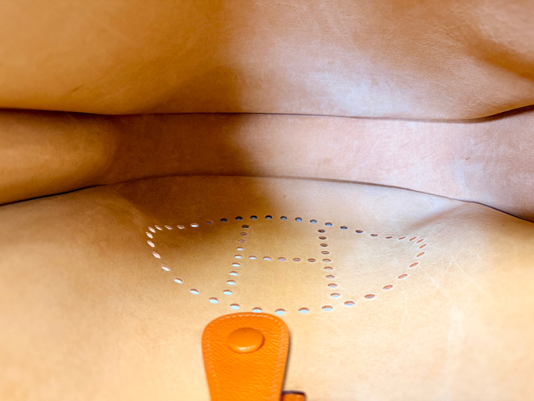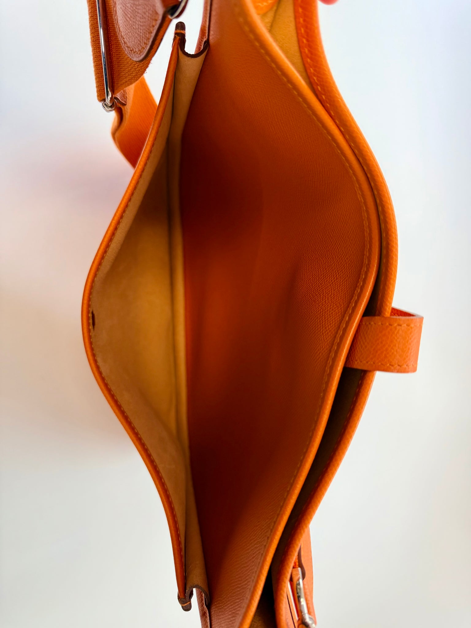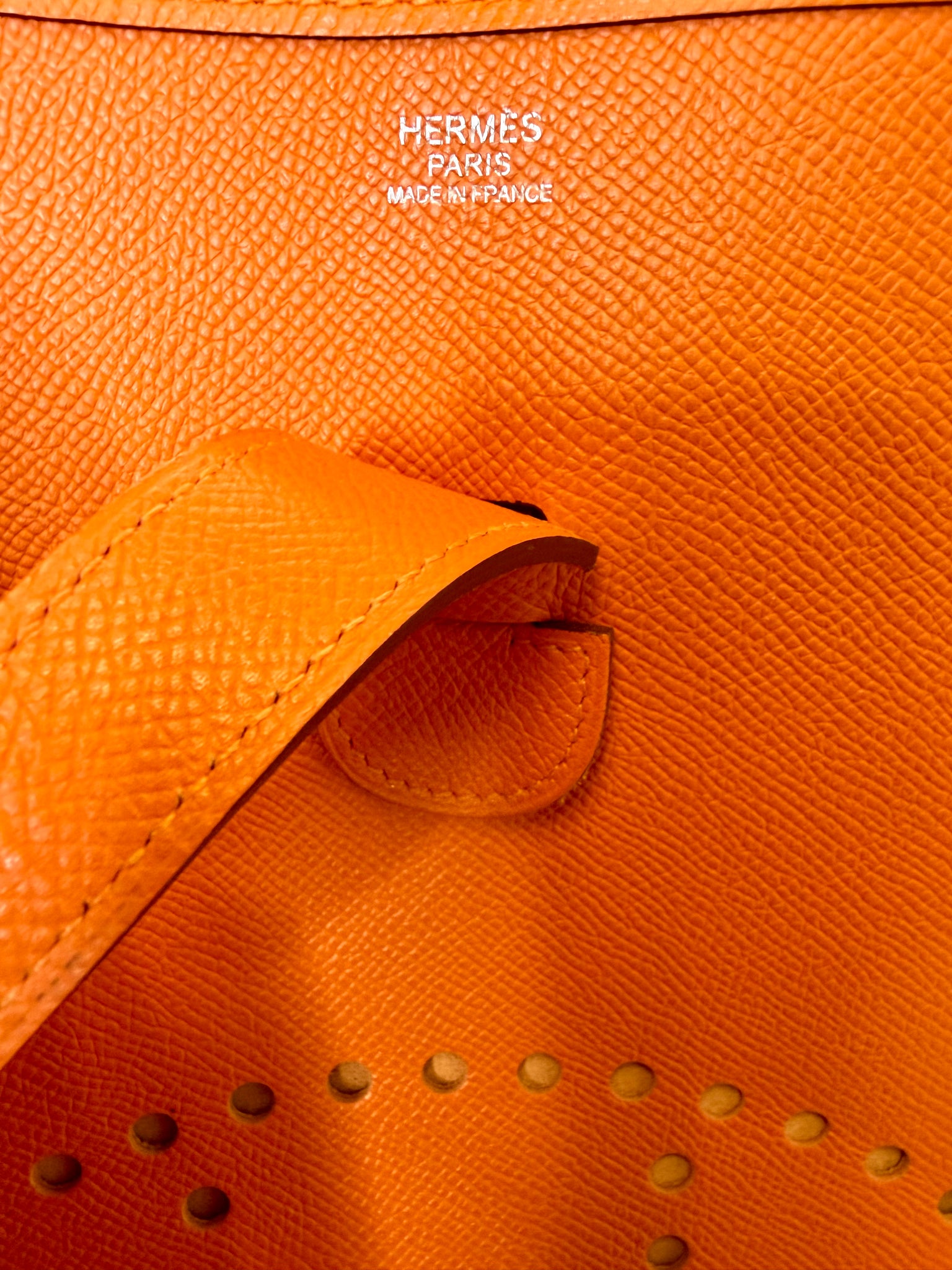 This is a pre-owned Hermès Evelyne III GM bag in orange epsom leather with palladium metal hardware. She features an adjustable length detachable strap and a snap closure exterior pocket.