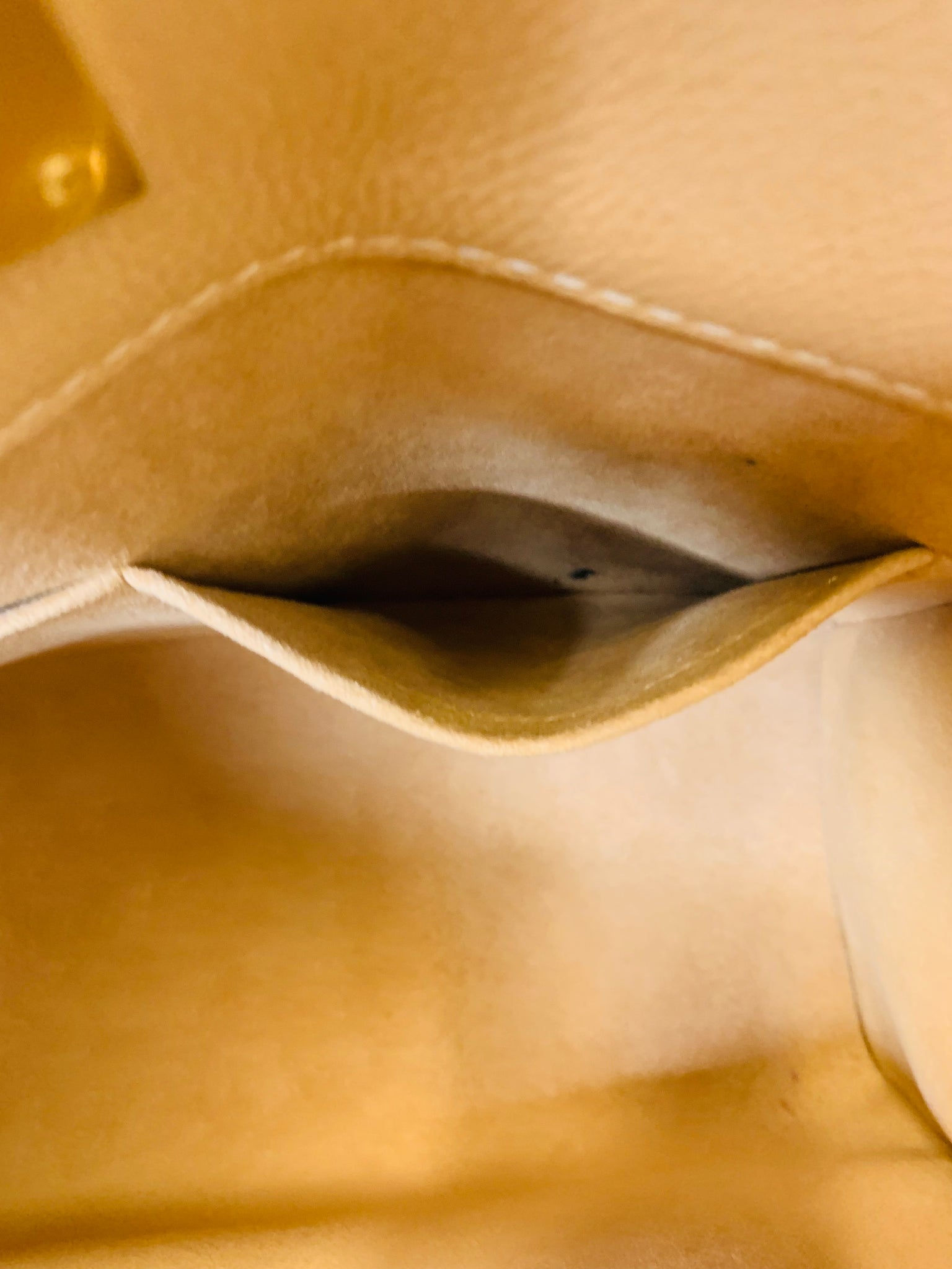 Item Condition - Very good. The exterior of the bag is clean and spot free. The gold metal hardware is clean, shiny and bright with minor scratches and minor fading on the gold metal protective feet on her base that are shown in the pictures. The interior of the bag is clean with marks that are shown in the pictures.