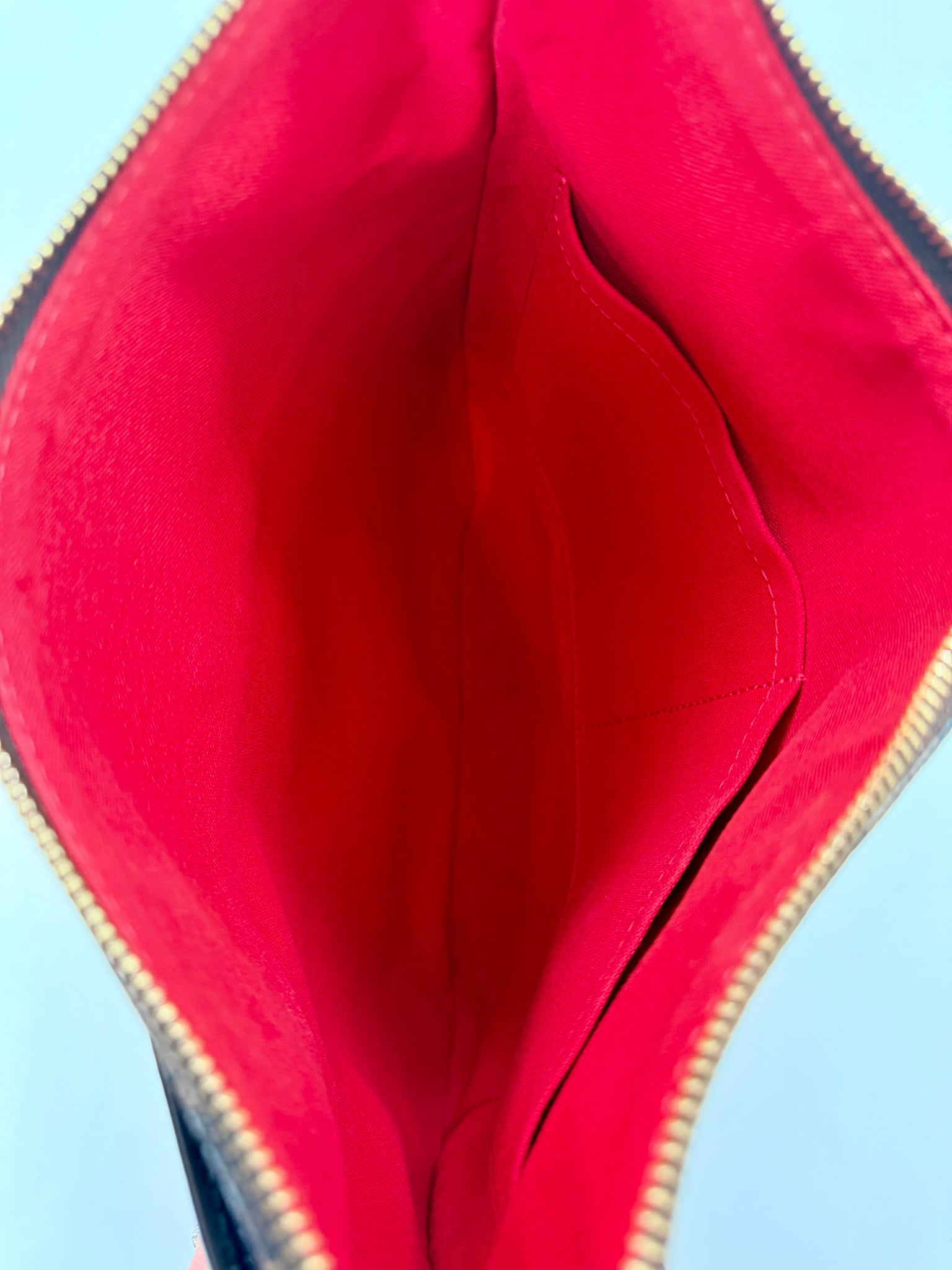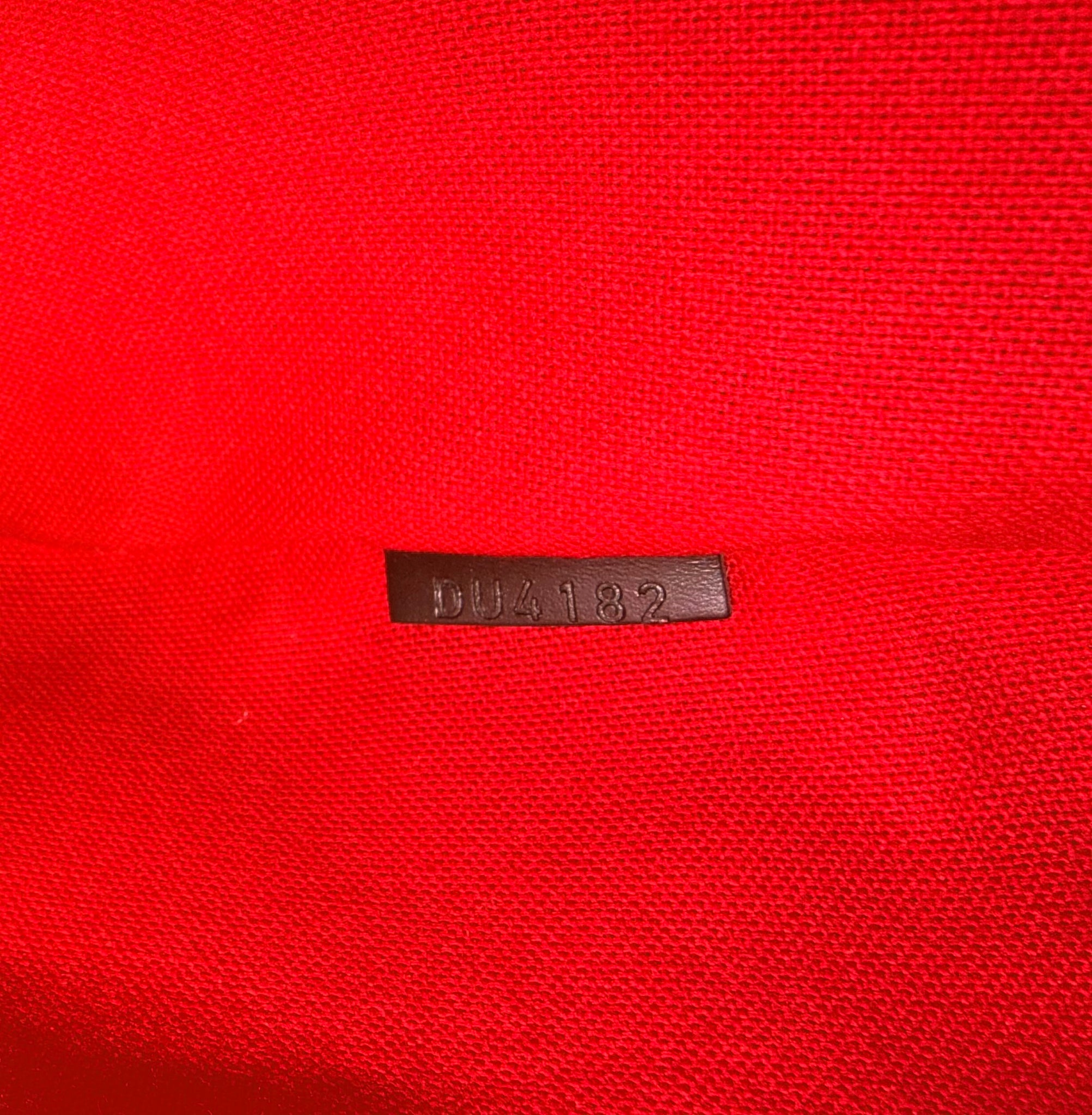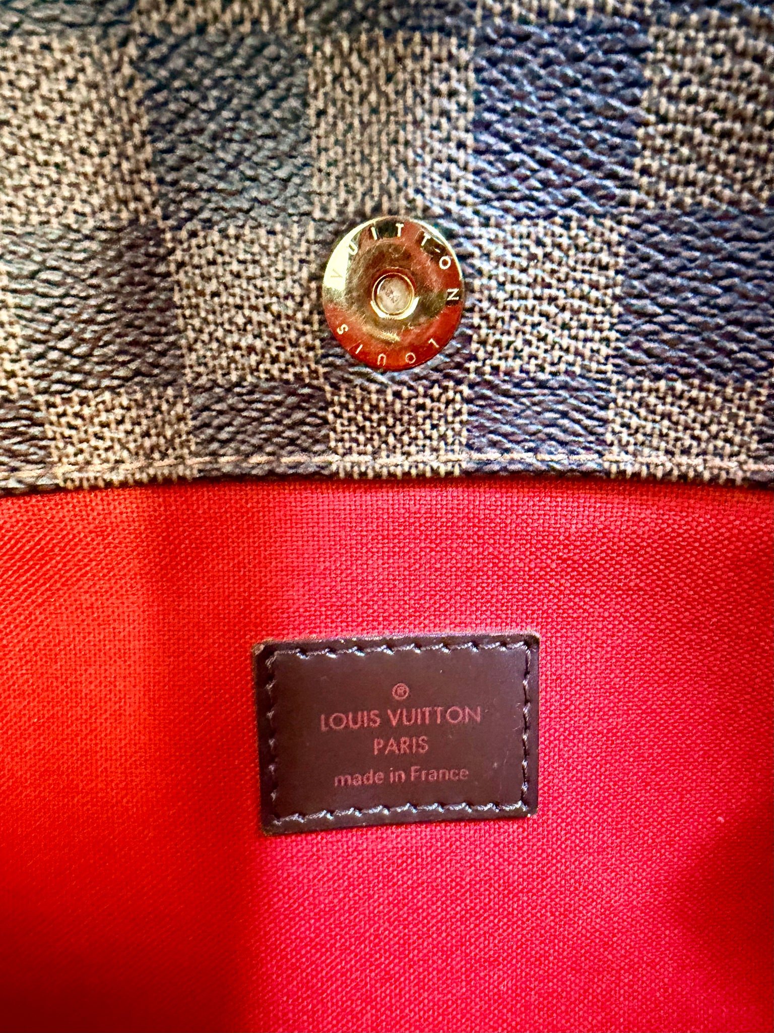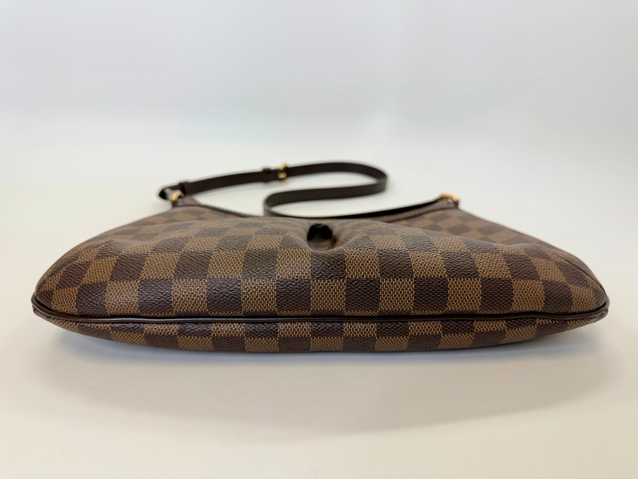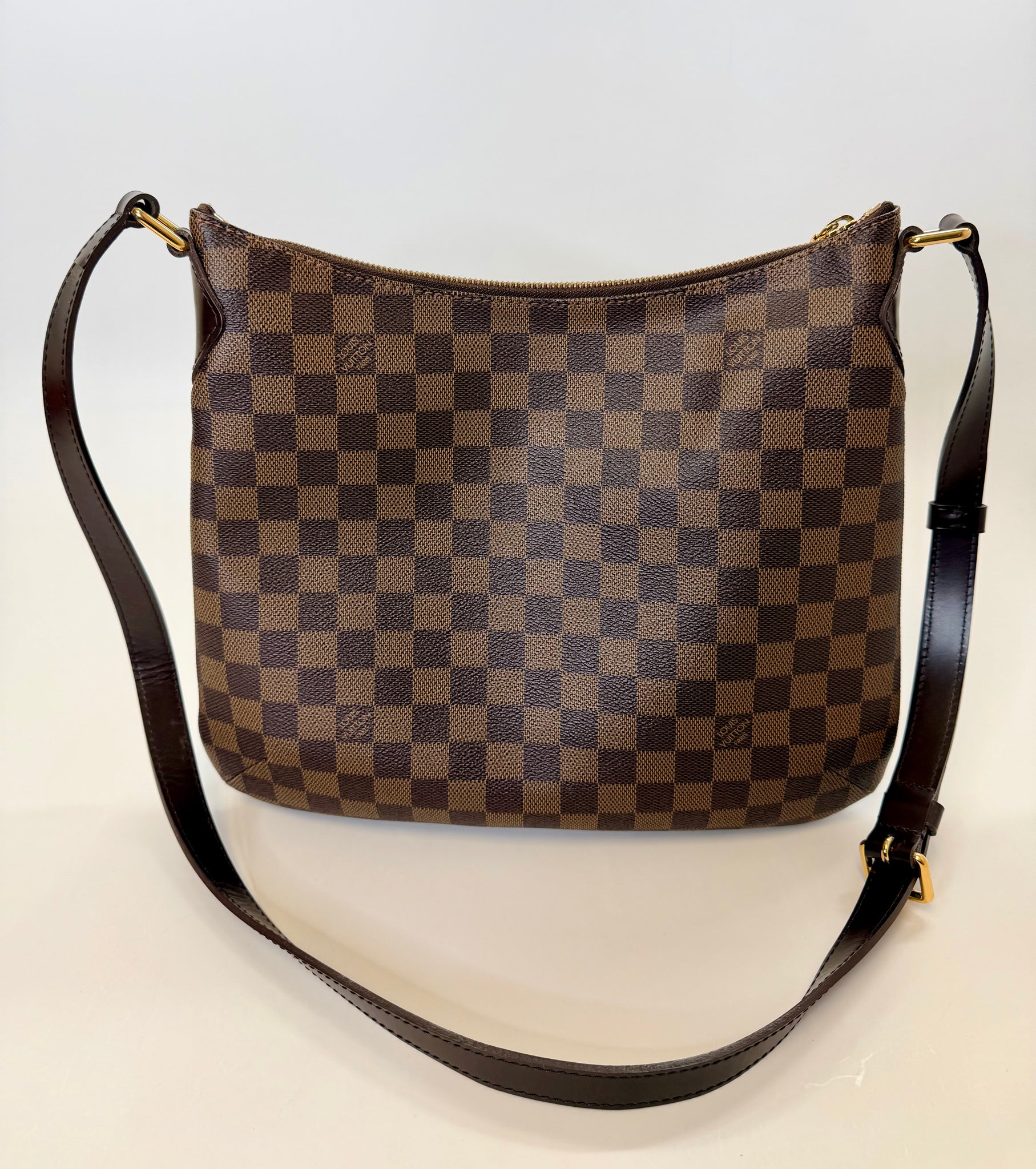 This is a pre-owned Louis Vuitton damier ebene coated canvas with brown leather trim Bloomsbury PM messenger bag. She features gold metal hardware, a zip top closure, a snap closure front pocket and an adjustable buckle cross body strap.