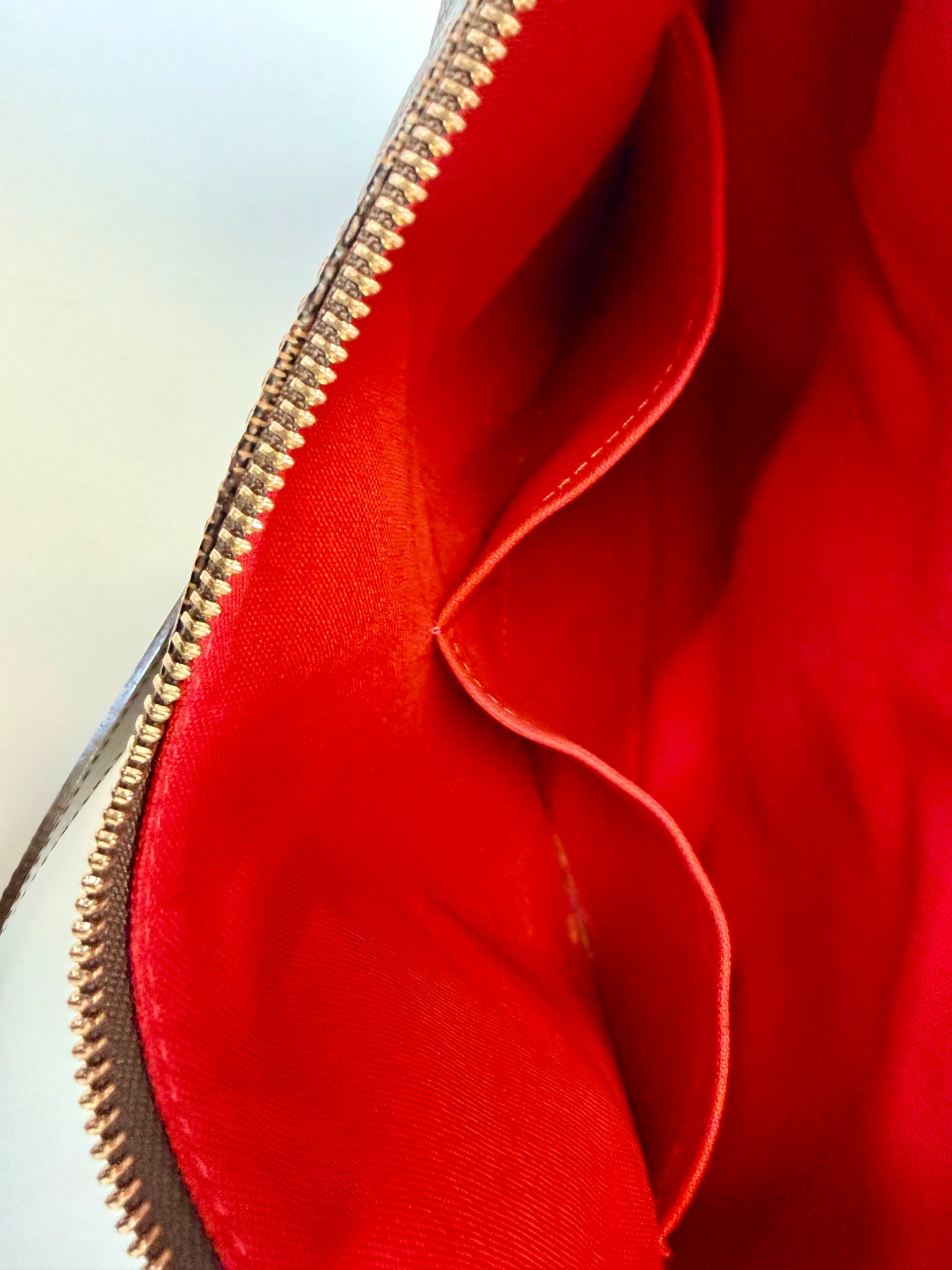 Item Condition - Great. The exterior of the bag is clean and mark free. There is a tiny mark on the strap that is shown in the pictures. The gold metal hardware is clean and shiny with minor scratches that are shown in the pictures. The interior of the bag is clean with marks that are shown in the pictures.